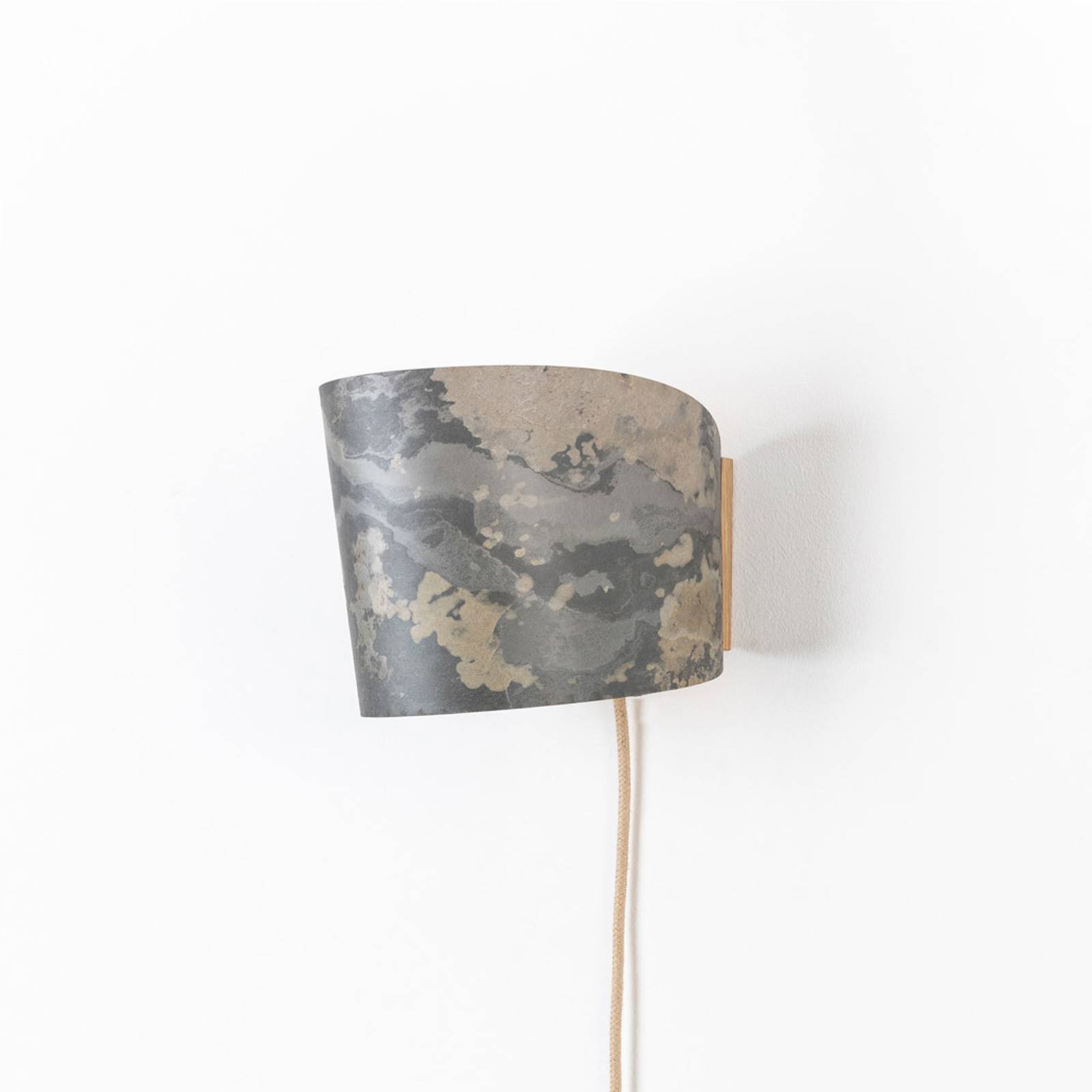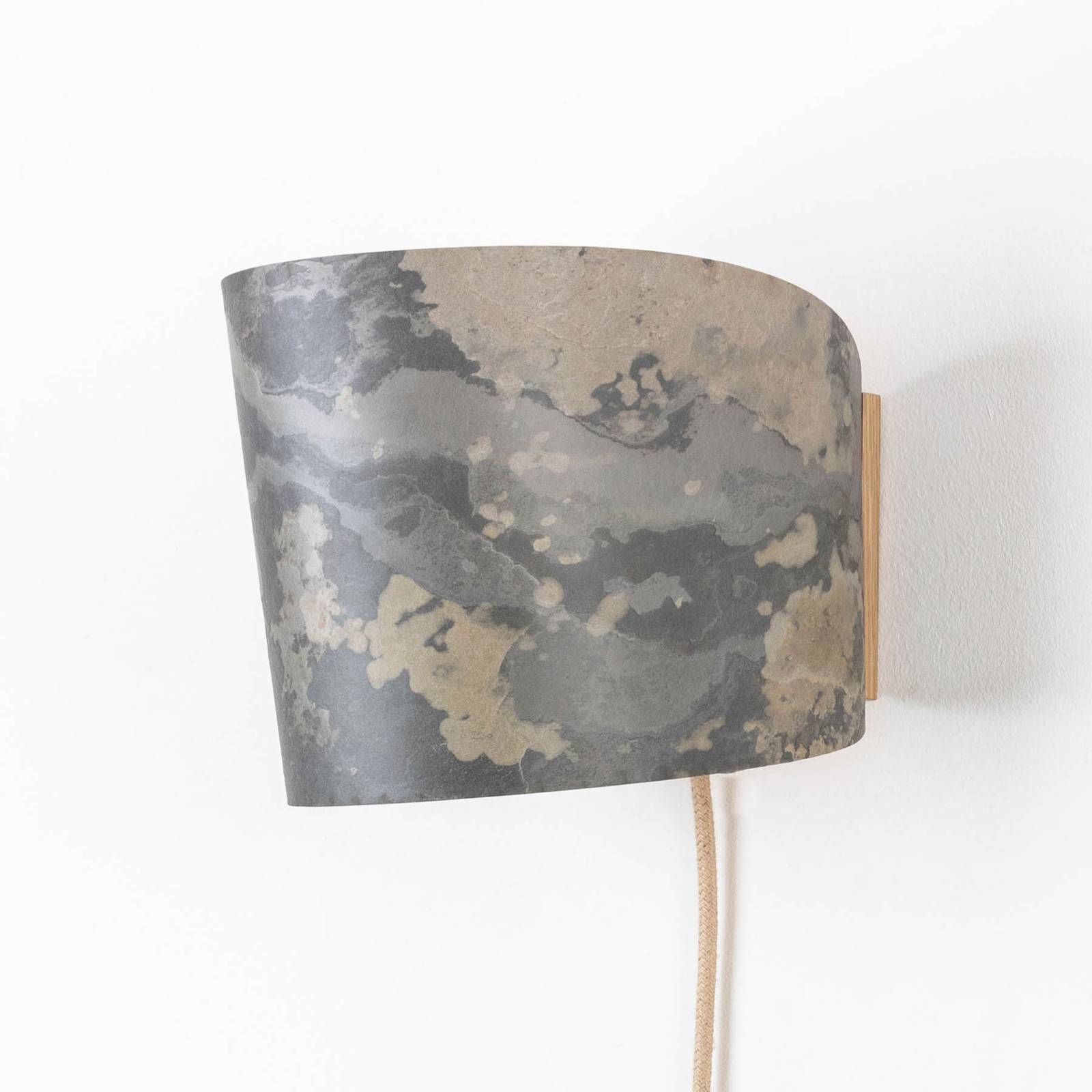 Nástěnné svítidlo 1411 s válcovým stínidlem z průsvitné barevné břidlice – vybavené zástrčkou a vypínačem Stínidlo ve tvaru válce působí jako přírodní a dekorativní unikát s individuálním mramorováním barevné břidlice, které je navíc zvýrazněno při zapnutí světla. Nástěnné svítidlo řady 1411 je vyrobeno z dubového dřeva. Stejně jako u všech svítidel z domu Almut von Wildheim probíhá výroba v Evropě veganským a udržitelným způsobem. Přírodní suroviny se zpracovávají precizní ruční prací. Kabel s pláštěm z jutových vláken je vybaven vypínačem pro zapnutí a vypnutí a zástrčkou pro napájení ze zásuvky.