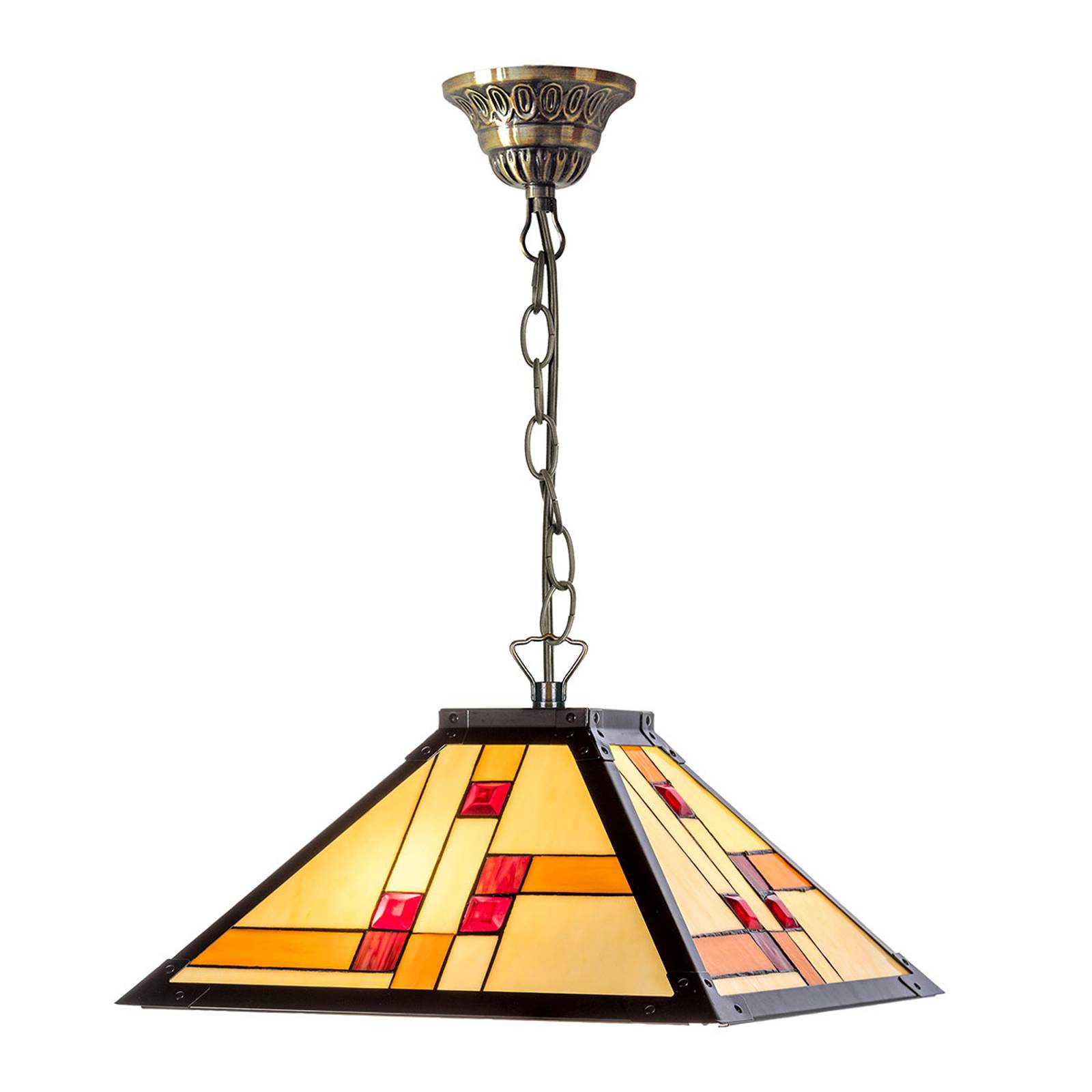 Závěsná lampa KT1836-40 + C2 ve stylu Tiffani se čtvercovým stínidlem Závěsná lampa KT1836-40 + C2 byla navržena v designu Tiffany. Na rozdíl od obvyklých květinových vzorů v tomto designu se však ukazuje v úhlovém designu a grafickém vzoru. Čtyřstranný stínidlo lampy bylo navrženo ze 64 ručně vyrobených skleněných prvků v hranatých vzorech. Barevná kombinace krémové, jantarové a červené z ní dělá univerzální závěsnou lampu, která nepodléhá žádnému módě. Nad stolem vyzařuje jasné osvětlení dolů a měkké osvětlení proniká skrz skleněné stínítko do celé místnosti. Závěsné svítidlo KT1836-40 + C2 s krásně zdobeným vrchlíkem a řetízkovým zavěšením je dodáváno bez lampy.