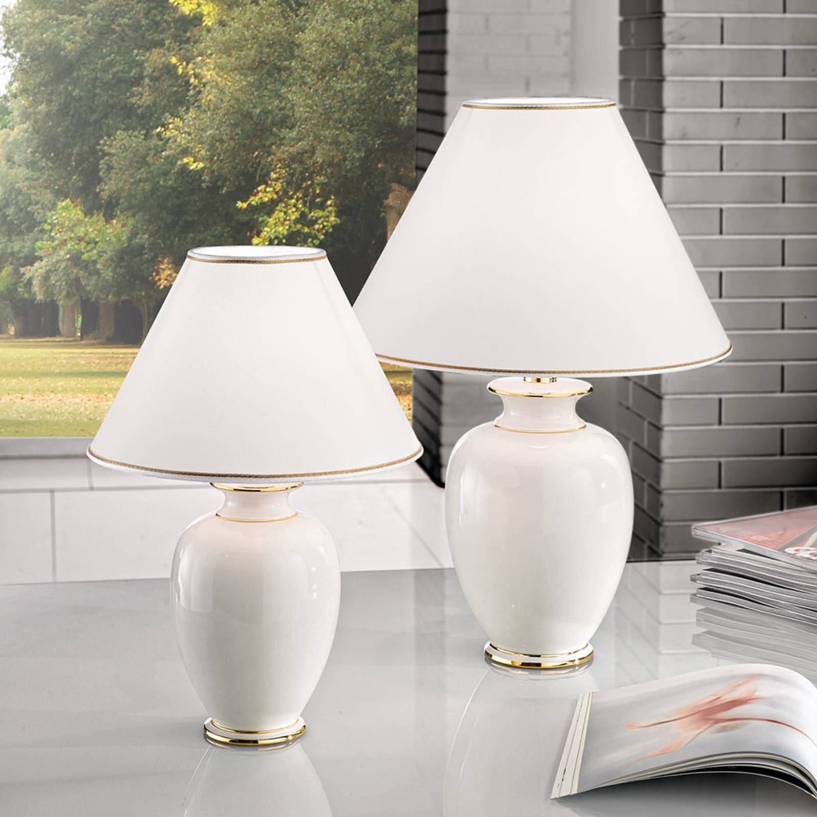 Klasika mezi stolními lampami: Giardino Avorio inspiruje harmonickým bílým základním tónem a zlatými ozdobnými hranami Stolní lampa Giardino Avorio řeže v obývacím pokoji jemnou postavu, ale určitě si najde místo na chodbě nebo v ložnici, kde lákavě přispívá k osvětlení místnosti. Stínidlo je vyrobeno z bavlny v bělavém odstínu a zlatý dekorativní okraj nad a pod harmonicky dotváří vzhled. Výsledné světlo je teplé a útulné, takže se může soustředit na pohodlí. Patice lampy je vyrobena z keramiky v baňatém tvaru, i zde zlaté lemy zajišťují elegantní vzhled. Nadčasově krásně navrženo!