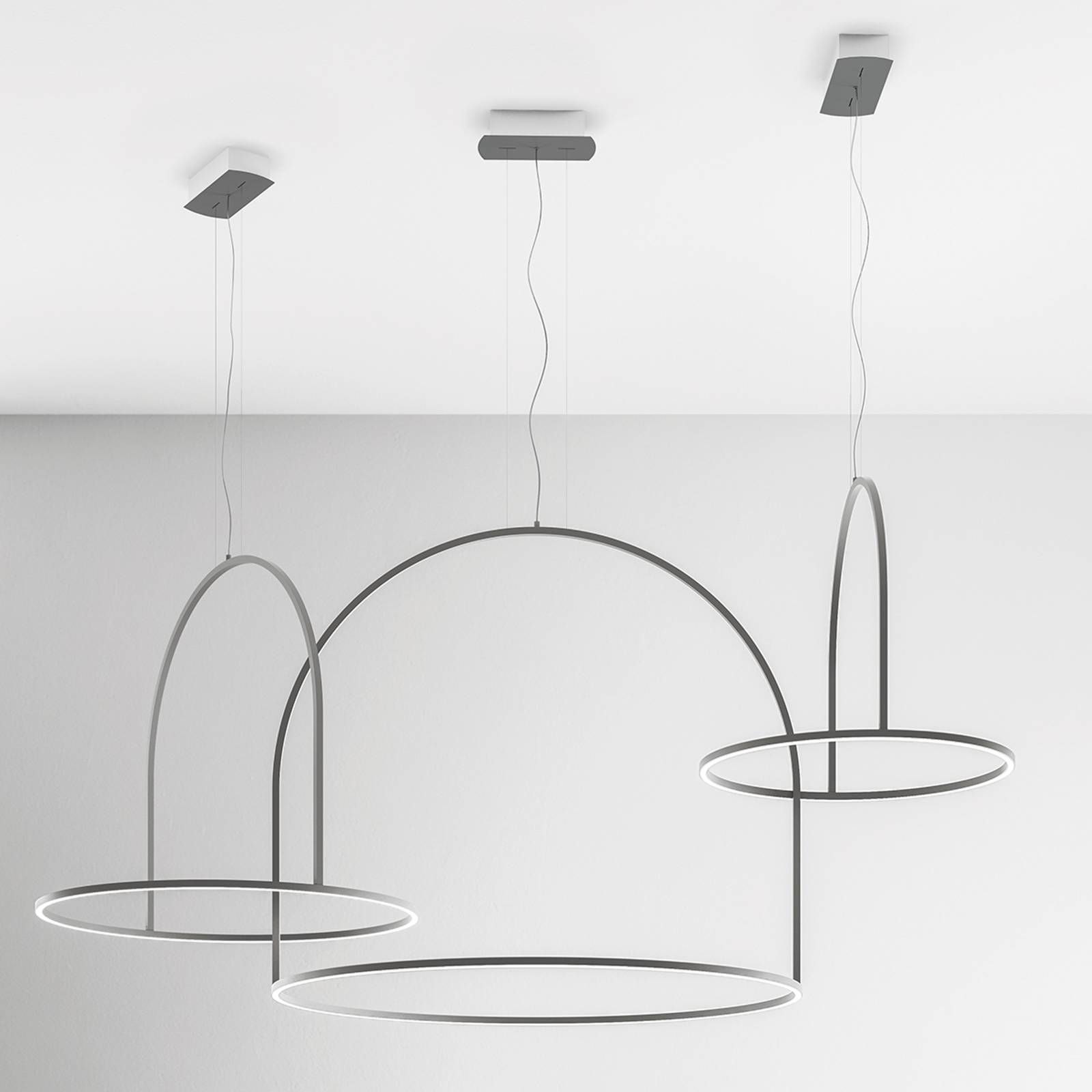 U-Light – šedá závěsná LED lampa s jednoduchým designemZávěsná LED lampa U-Light dokazuje, že k vytvoření skvělé lampy není potřeba příliš propracovaný design. Je zavěšena na černém kabelovém závěsu, který je zase připevněn k hranatému bílošedému vrchlíku. Tato konstrukce slouží k uchycení vlastního stínidla vyrobeného z hliníku. Svým tvarem silně připomíná klec, která je ve svém celku navržena poměrně otevřeně. Svisle umístěný oblouk přímo na kabelu představuje držák pro závěrečný kulatý světelný kruh pod svislým obloukem. Ten je osazen trvale instalovanými LED diodami, které při provozu svítidla vydávají nádherné teplé bílé světlo. Celkově má závěsné svítidlo U-Light LED futuristický styl, který ještě umocňují jasné kontury, tmavá barva a jednoduchý design.