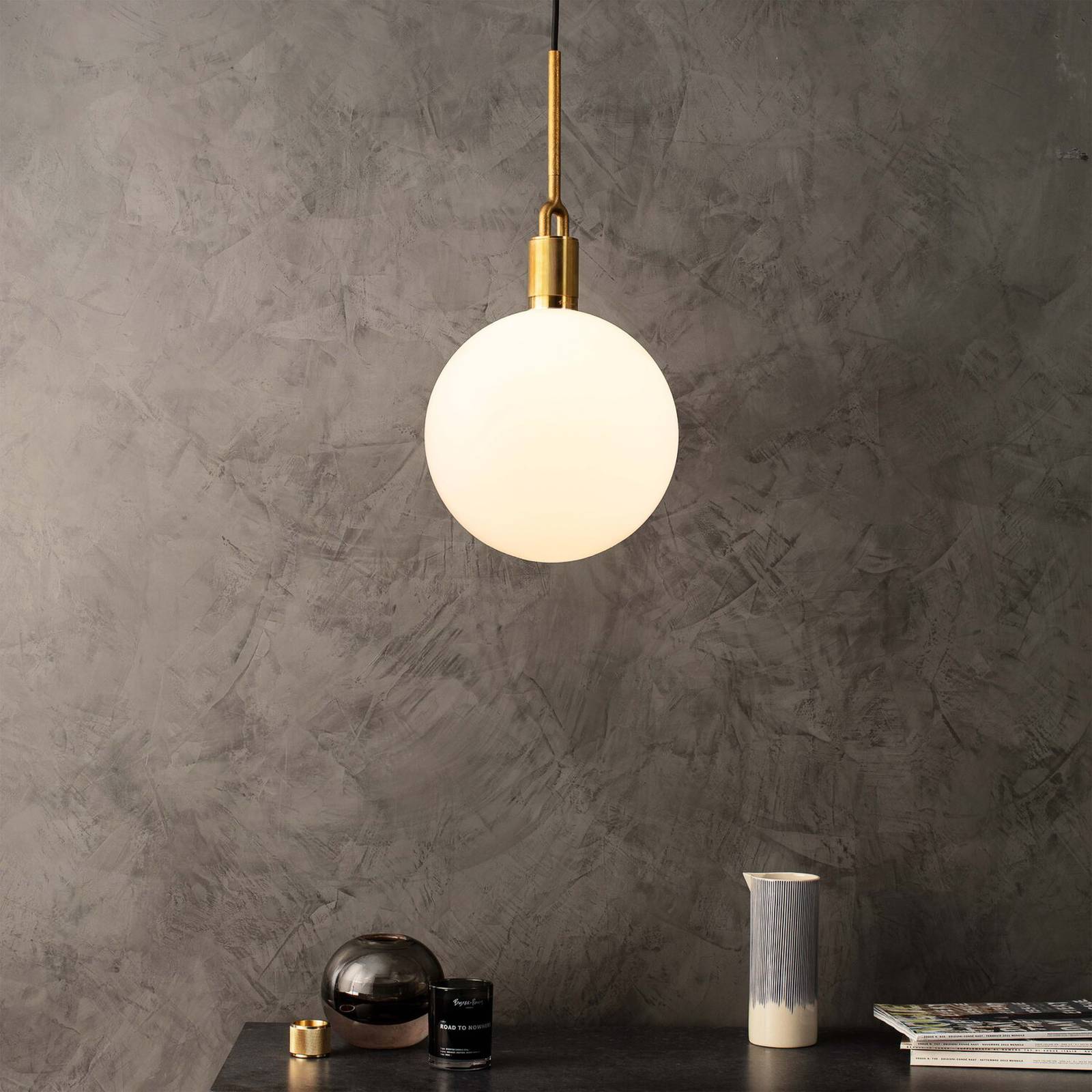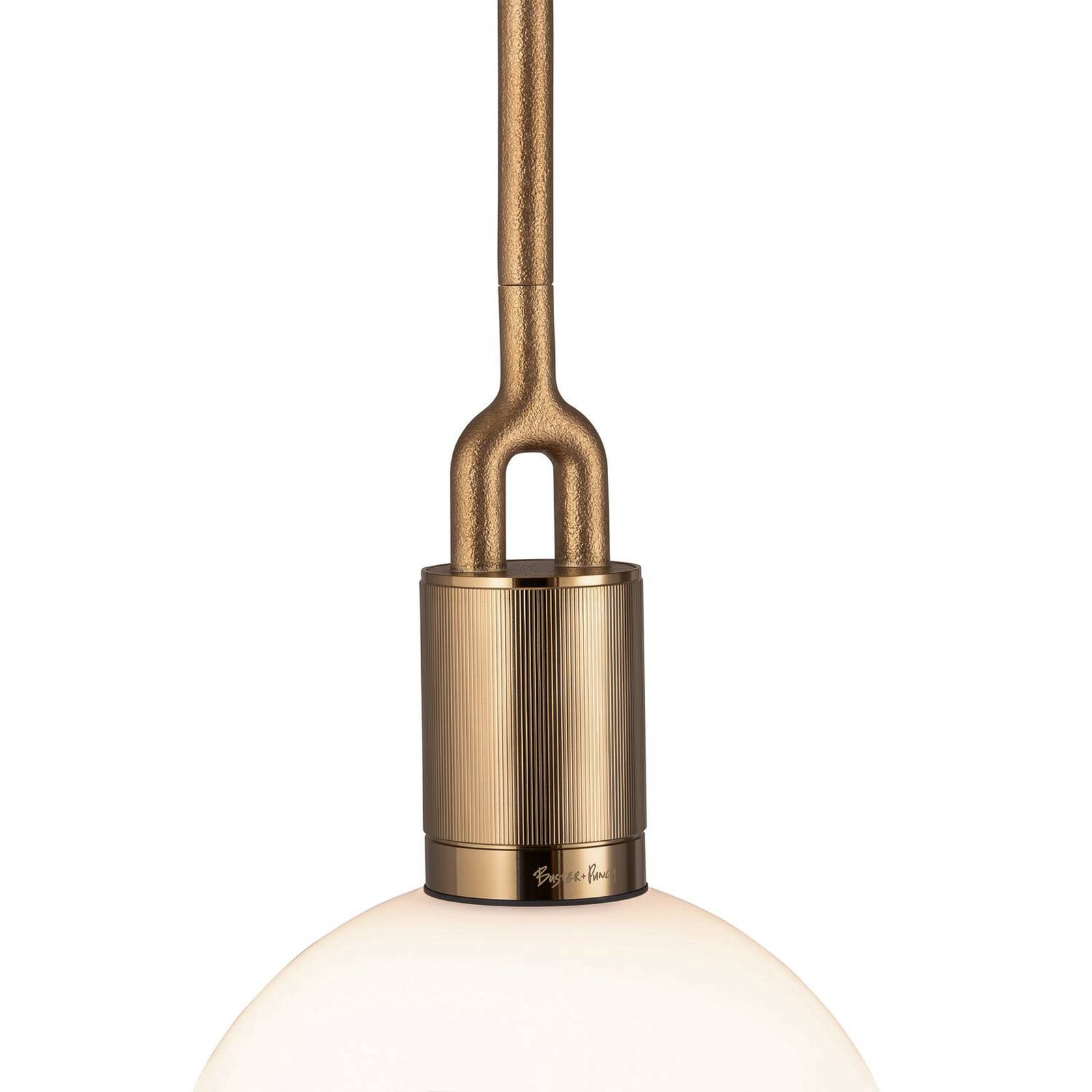 Závěsné svítidlo Forked z mosazi s foukanou koulí z opálového sklaForked je závěsné svítidlo vyrobené ze závěsu z masivní, vysoce kvalitní, lité a strojově opracované mosazi s charakteristickým lineárním kosočtverečným vroubkovaným vzorem Buster Punch na objímce a foukanou koulí z opálového skla, které se hodí do každého interiéru. Pro použití v patici E27 je součástí balení stmívatelná LED žárovka s teplou bílou barvou světla. Pro stmívání lampy je zapotřebí stmívač vhodný pro LED lampy. Kombinace mosazi a bílého opálového skla dodává svítidlu klasický nádech a činí z něj univerzální zdroj světla v soukromých místnostech i v komerčních nebo gastronomických prostorách, který díky kouli z opálového skla vyzařuje světlo příjemně neoslňující a rovnoměrně rozptýlené po celém obvodu.Závěsné svítidlo Forked je produktem anglické značky Buster Punch, která kromě svítidel vyrábí také armatury a nábytek. Láska společnosti Buster Punch k pevným a kvalitním kovům se odráží v každém výrobku výrobce