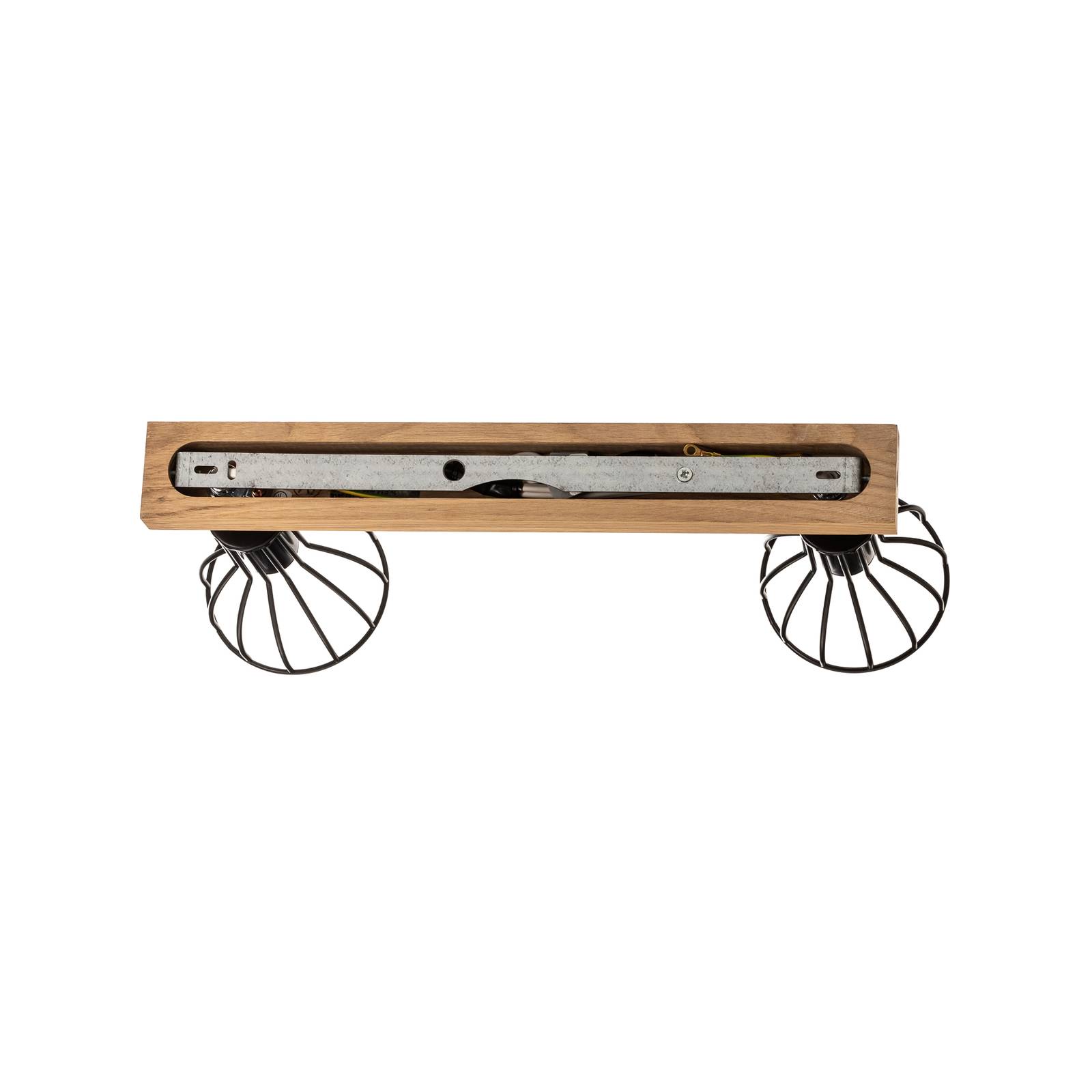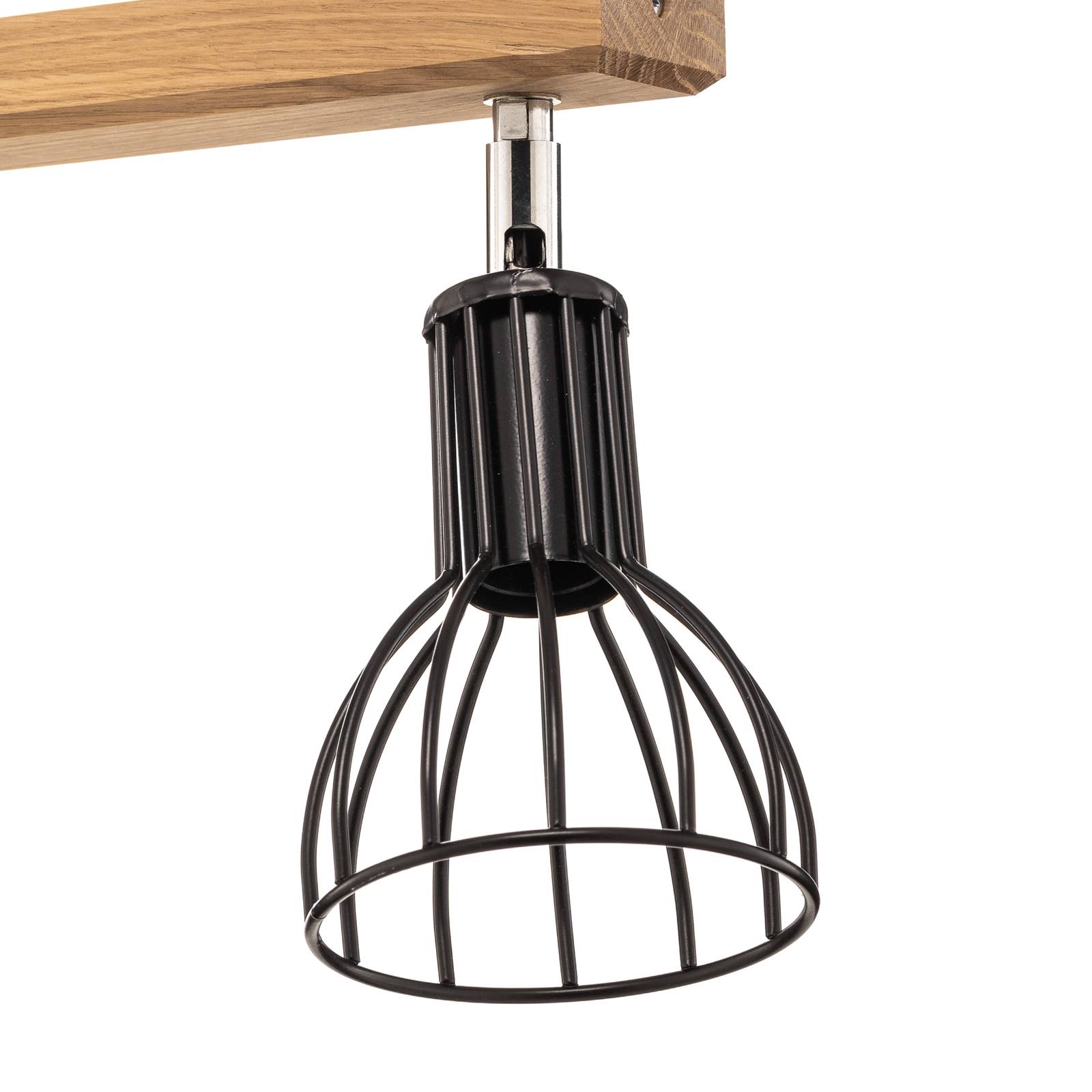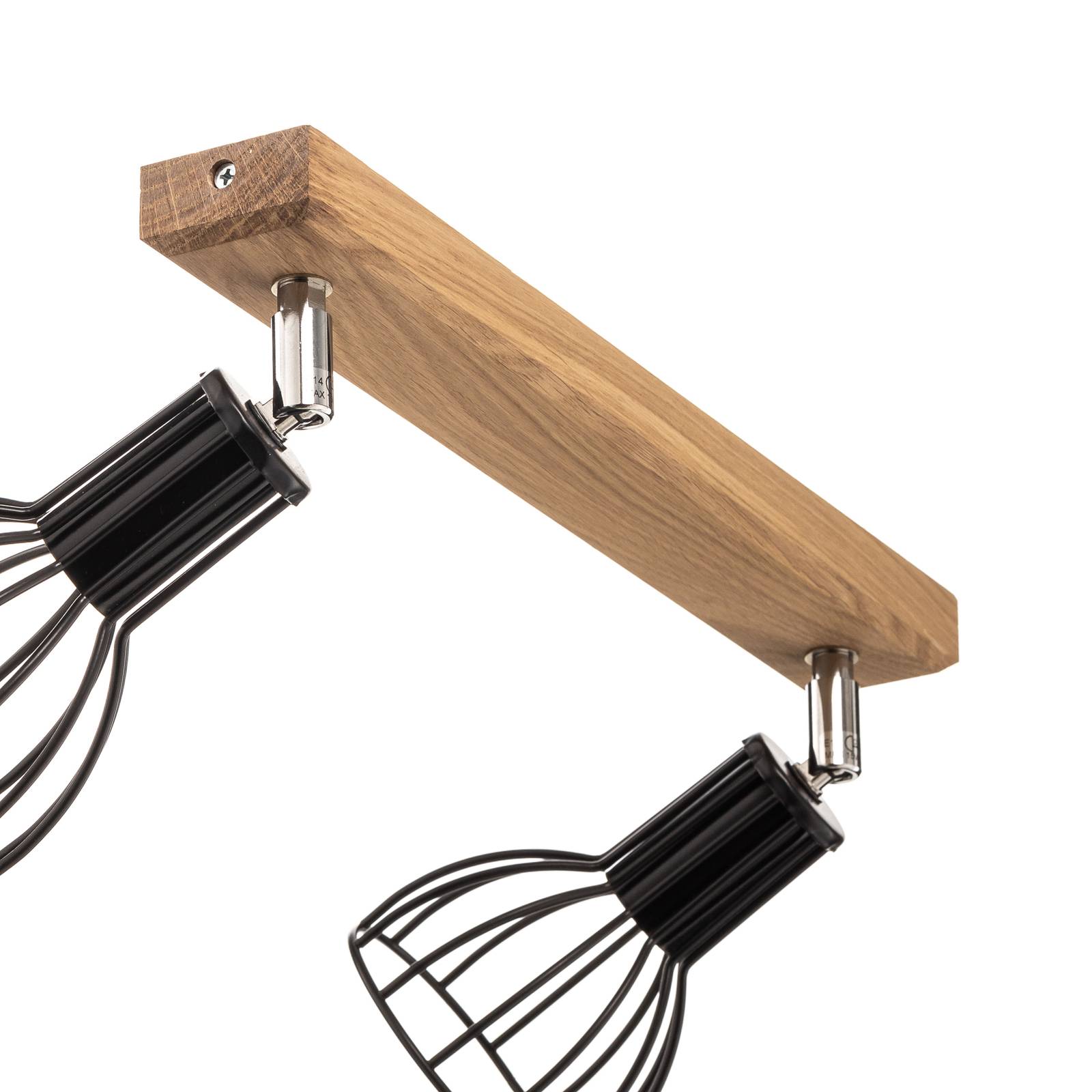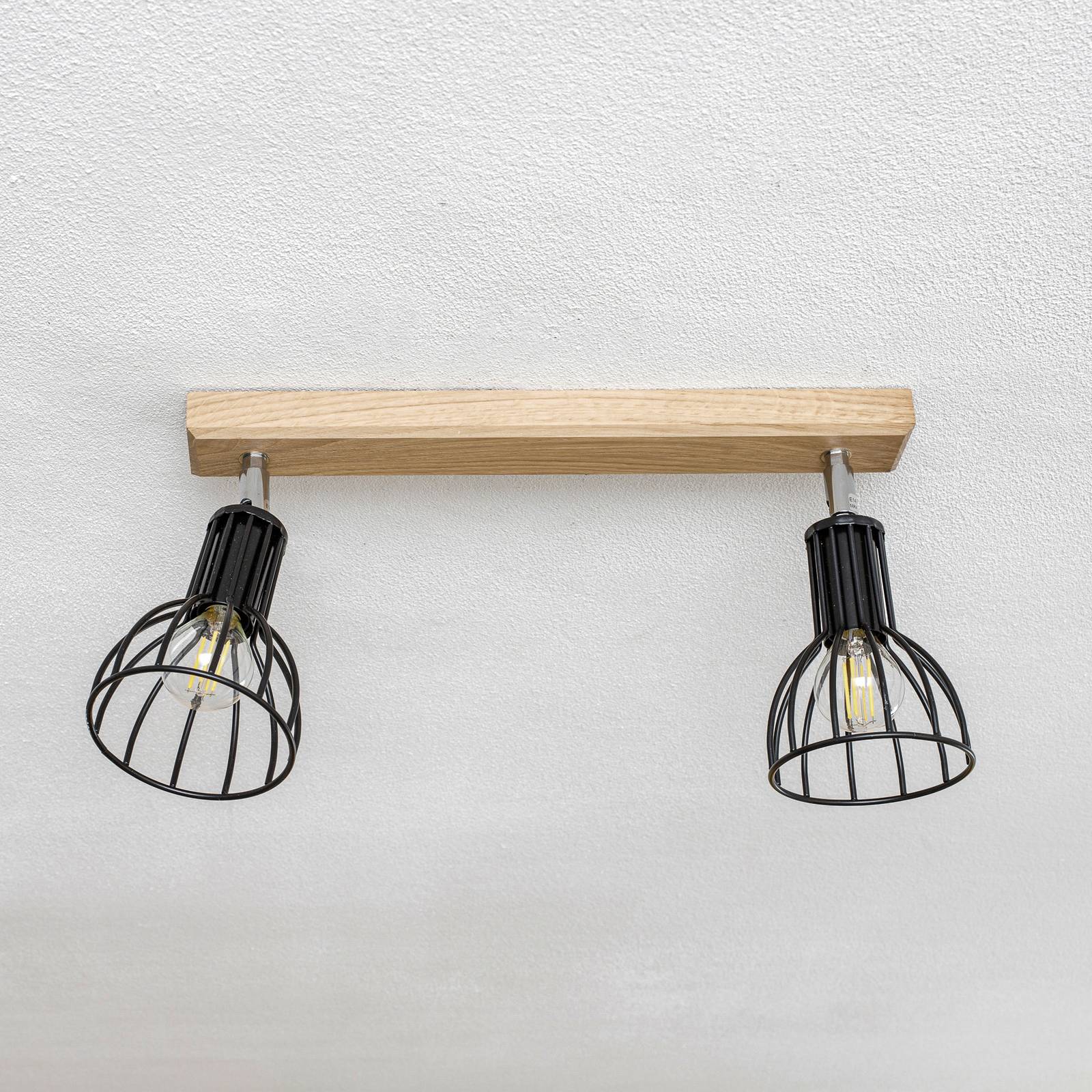Stropní svítidlo Aria se dvěma světly, dubovým baldachýnem a kulatými stínidly v kleci Stropní svítidlo Aria je moderní a přirozené zároveň. Je vybaven dvěma kulatými nastavitelnými stínítky, která jsou navržena v módním designu klece z černých kovových vzpěr. Pohled na používaná svítidla je možný ze všech stran, takže se dekorativní žárovky projeví co nejlépe. Stříšku tvoří obdélníkový prvek ze světlého naolejovaného dubového dřeva. – Svítidlo značky Envostar – Vyrobeno v Evropě – udržitelné obaly z recyklovatelných materiálů