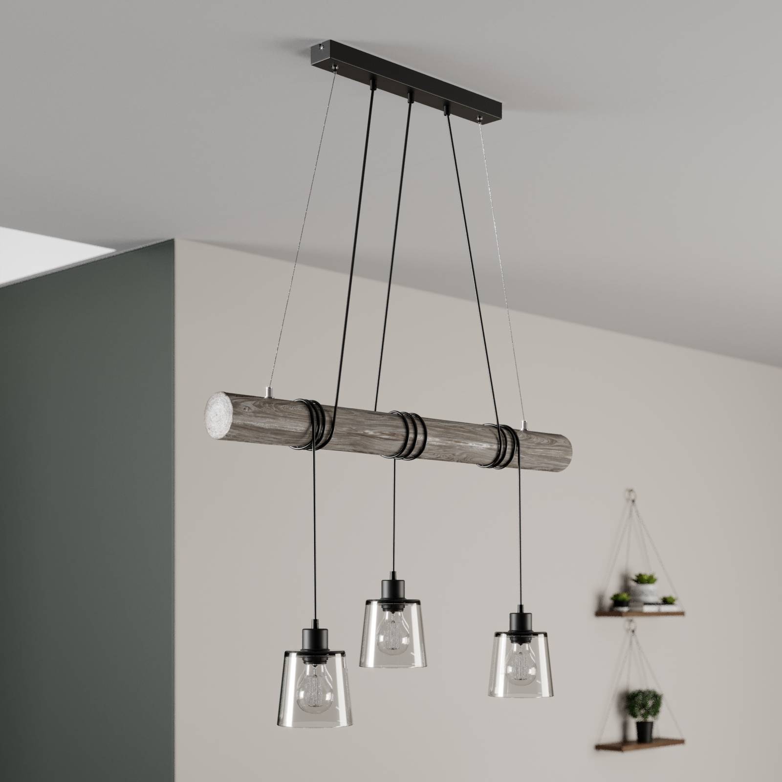 Euluna Závěsné světlo Karrl, 3 zdroje, kouřově šedá/šedá, Obývací pokoj / jídelna, sklo, borové dřevo, kov, plast, E27, 60W, P: 90 cm