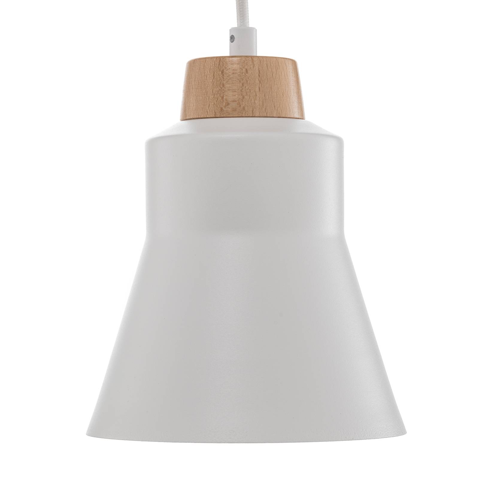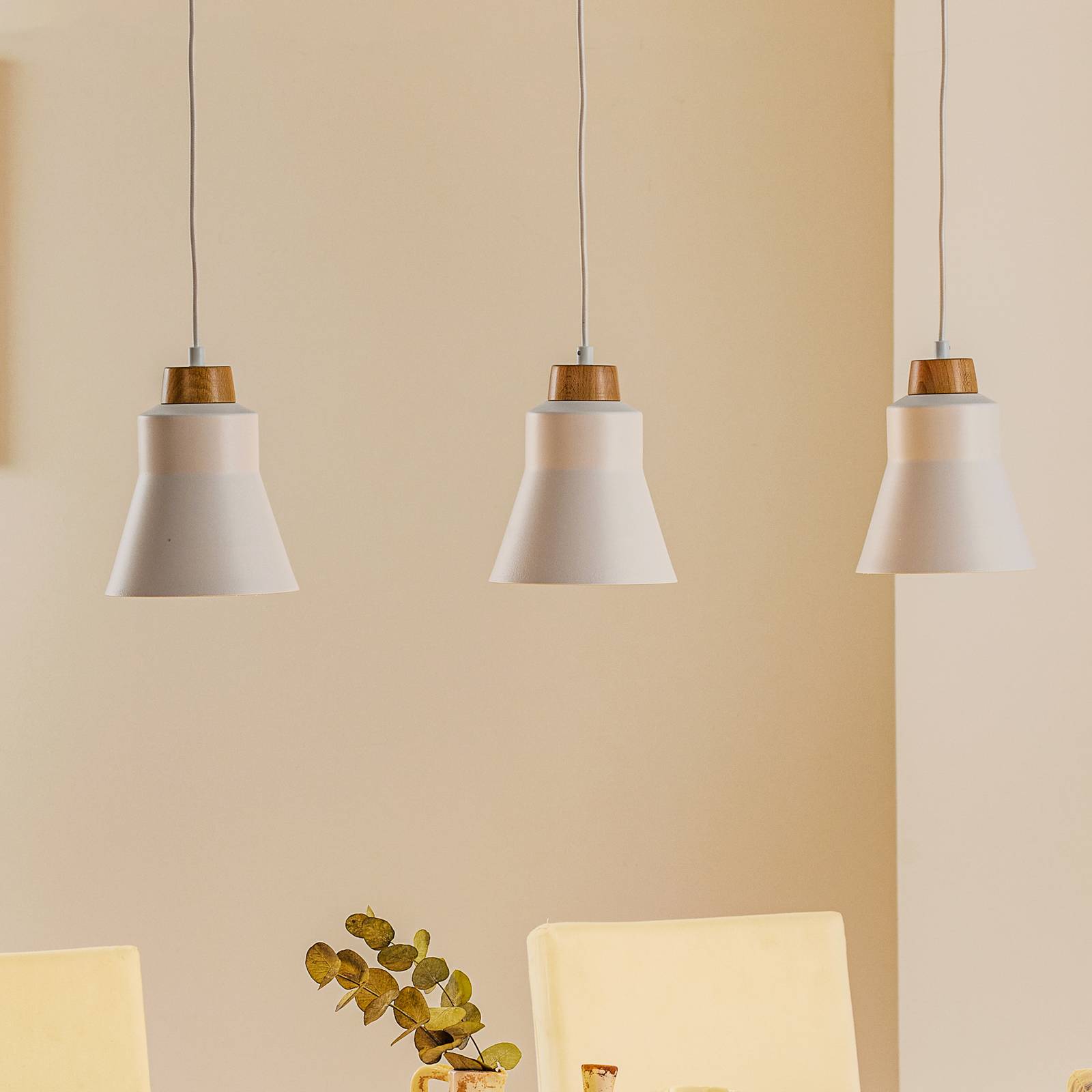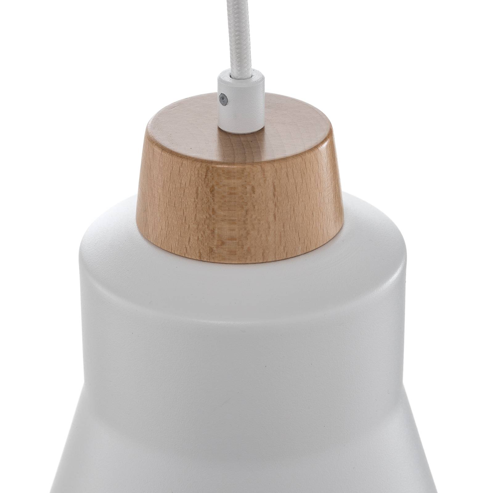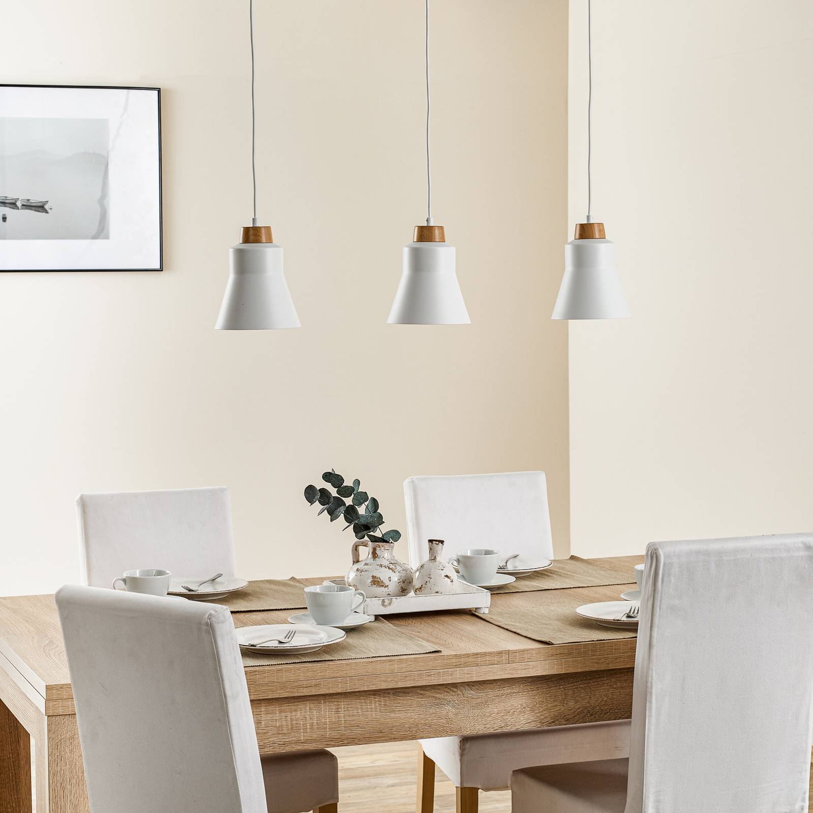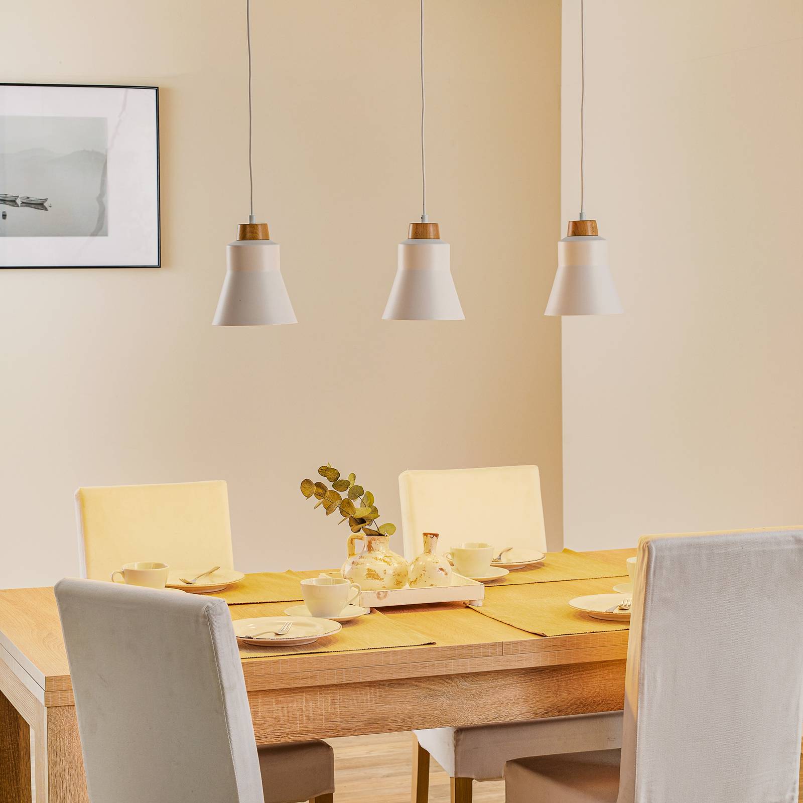 Závěsná lampa se třemi plameny Dřevo s dekorativními prvky ze dřeva Název Wood odkazuje na malé dřevěné detaily na horní části stínítka, která je vybavena baldachýnem a kovovými stínítky. Dodávají závěsné svítidlo, které je ideální pro optimální osvětlení stolu nebo pultu, s přirozeným nádechem. Vnitřek lakovaných kovových odstínů je udržován bílý pro optimální odraz světla.