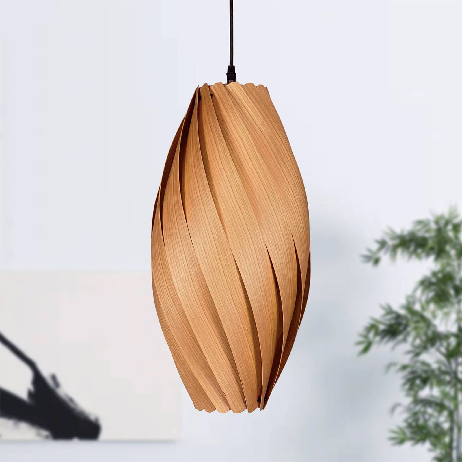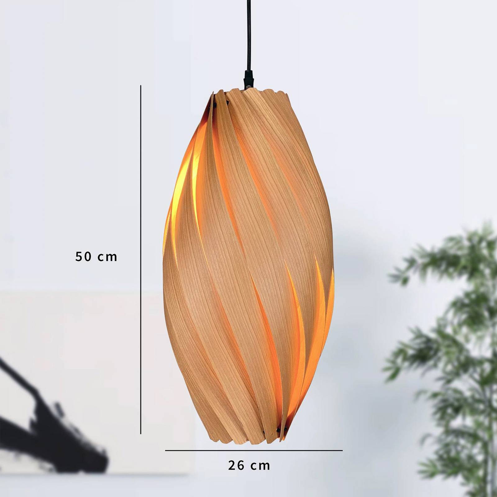 Vyrobeno z třešňové dýhy: závěsná lampa Ardere s podlouhlým stínidlem Červenavé dřevo třešně se dokonale hodí k výrobě krásných lamp, jako jsou ty, které vyrábí kolínská společnost Gofurnit. Spojením jednotlivých, pečlivě vybraných proužků třešňové dýhy vzniká velmi dekorativní svítidlo s báječným vyzařováním světla, které vytváří mimořádně útulnou atmosféru. Světlo vložené lampy jemně vyzařuje zevnitř podél dřevěných lamel ven, čímž účinně zvýrazňuje strukturu třešňového dřeva. Díky svítidlu Ardere lze dostatečně osvětlit postranní stolky v obývacím pokoji nebo jídelní stoly v jídelně či kuchyni. Třešňové dřevo lze velmi dobře kombinovat s jinými tmavšími druhy dřeva. – Udržitelně vyrobená lampa do obývacího pokoje – jsou možné drobné odchylky od obrázkového znázornění – každé svítidlo je jedinečné.