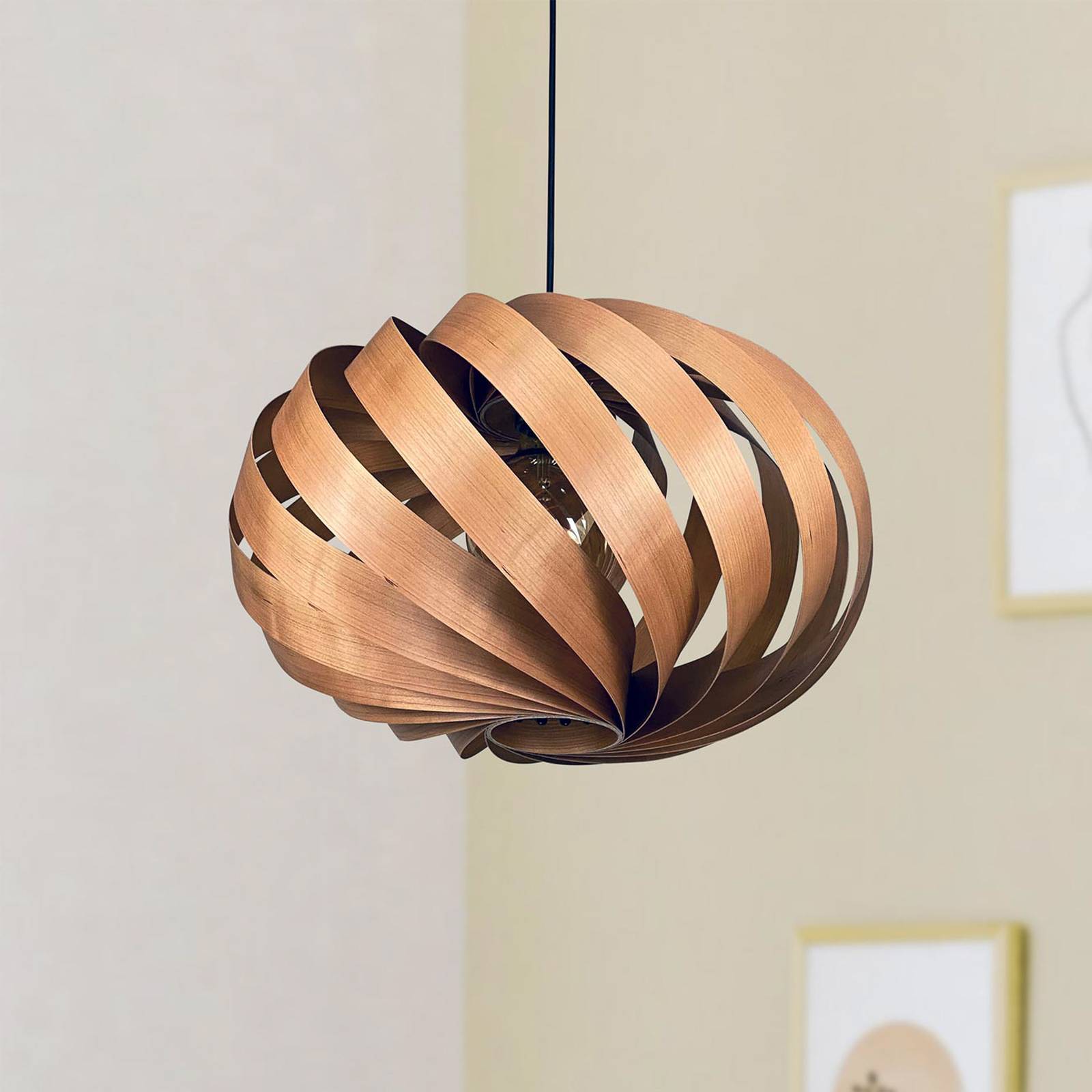 Ušlechtile vypadající závěsná lampa Serentia z třešňové dýhy Díky lehce načervenalému odstínu třešňové dýhy, z níž je vyrobeno stínidlo závěsné lampy Serentia, se dokonale hodí do interiéru s tmavším dřevěným nábytkem. Dřevo vyzařuje elegantní atmosféru a působivě podtrhuje sofistikovaný styl bydlení. Stínidlo oblého tvaru se skládá z jednotlivých dýhových lamel, držák žárovky je umístěn uvnitř stínidla. Jakmile se světlo rozsvítí, stínidlo začne zevnitř zářit a světlo se podél lamel dostane do místnosti. Každé z těchto svítidel Serentia je jedinečný kus, který se mírně liší strukturou od ostatních svítidel v sérii, což je u výrobku z přírodního materiálu dřeva zcela přirozené. – Vybaveno textilním kabelem v černé barvě – vyrobeno v Německu společností Gofurnit – udržitelné obaly