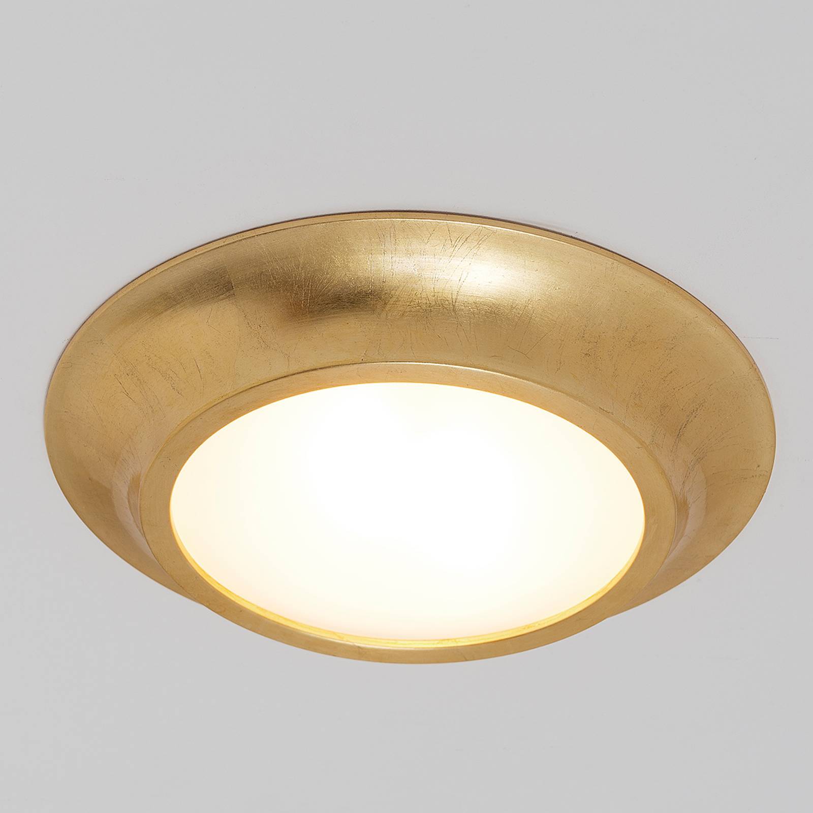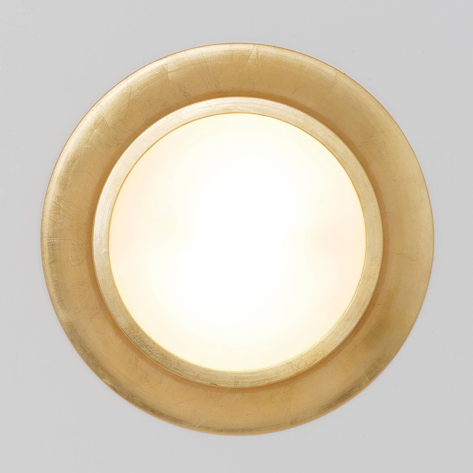 Spettacolo – kulaté keramické stropní svítidlo s povrchovou úpravou z plátkového zlataRám stropního svítidla Spettacolo je vyroben z keramiky a je potažen krásnou povrchovou úpravou z plátkového zlata, která svítidlu dodává ušlechtilý efekt. Difuzor ze satinovaného skla je navržen s mírným zakřivením a je zodpovědný za rovnoměrné a neoslňující rozložení světla. V mnoha místnostech lze stropní svítidlo Spettacolo o průměru 50 cm použít jako hlavní zdroj světla.