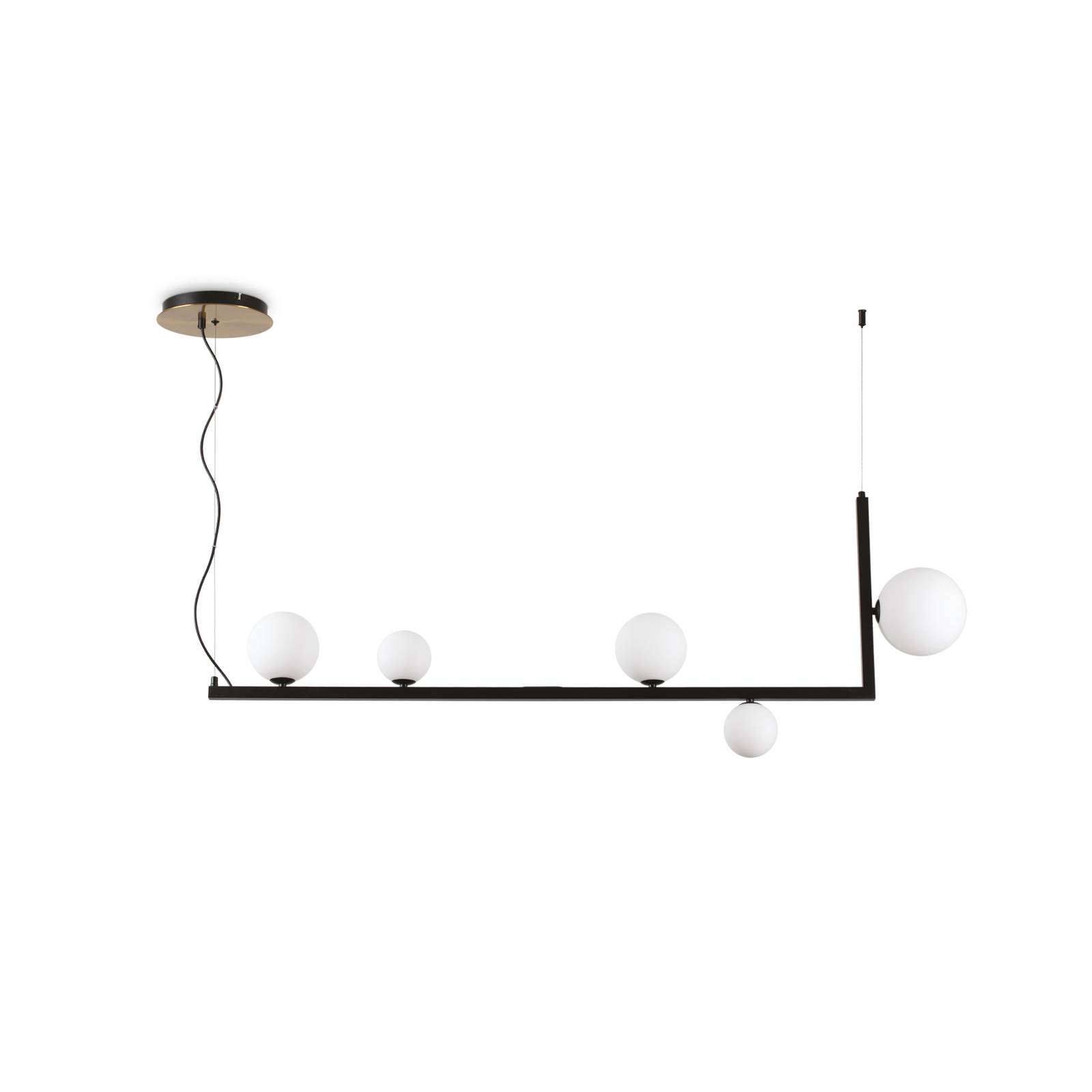 Závěsná lampa Birds s pěti lampami a bílými sklyRám této závěsné lampy, která dostála svému názvu Birds, je vyroben z kovu v černé a saténové mosazi. Bílá skla vypadají díky svému rozložení na černé rámové liště a kolem ní jako ptáci na elektrickém vedení.Světlo žárovek G9, které jsou součástí dodávky, vyzařuje do místnosti ze všech stran bez oslnění. Závěsné svítidlo, které se díky své moderní estetice osvědčí nejen jako zdroj světla, ale také obohatí místnost o dekorativní prvek.