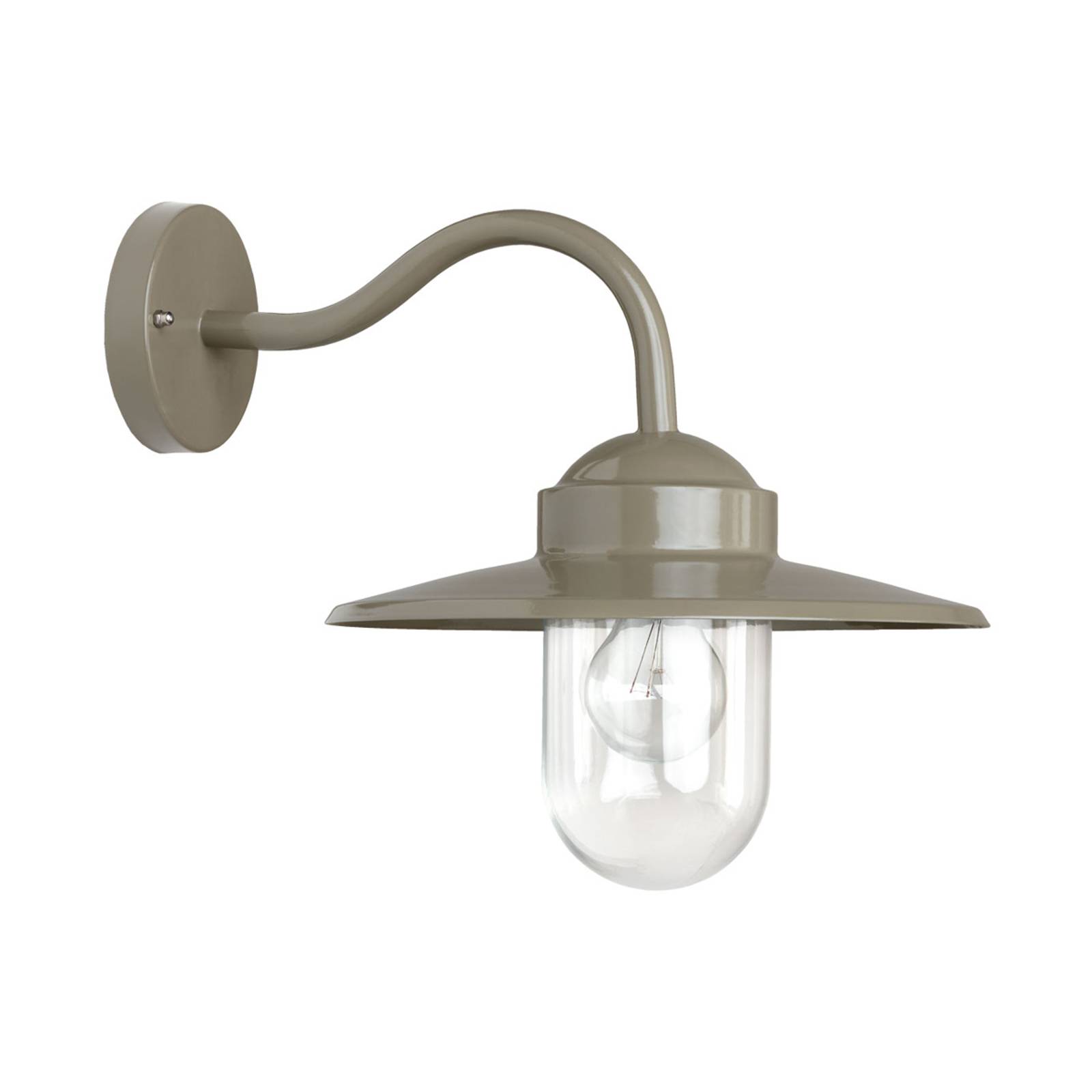 Venkovní nástěnné svítidlo Dolce s práškovým nástřikem odolným proti povětrnostním vlivům v barvě taupeVenkovní nástěnné svítidlo Dolce je i přes svou jednoduchou povrchovou úpravu v barvě taupe skutečným poutačem na stěnu domu. Je to především díky jejímu elegantnímu retro designu. Díky práškovému lakování je svítidlo mimořádně odolné vůči povětrnostním vlivům a dokonale se hodí pro venkovní použití. Světlo rovnoměrně vyzařuje přes stínítko z čirého skla. Do patice E27 lze namontovat jak klasické, tak LED žárovky.