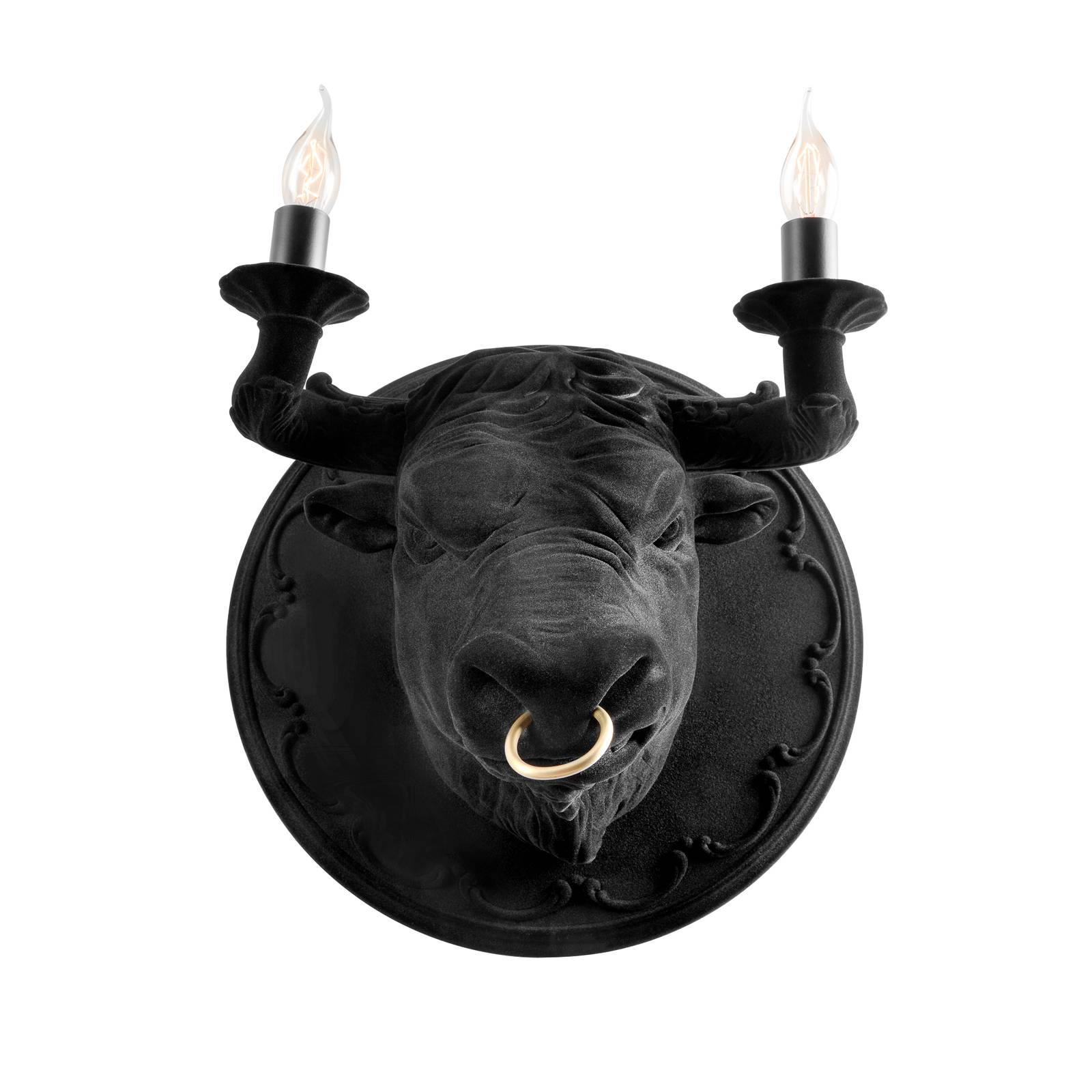 Působivé nástěnné svítidlo Corrado ve tvaru býčí hlavy Nekonvenční styl a neobvyklé materiály – tím je známý italský výrobce Karman. Designér Matteo Ugolini to zakomponoval i do tohoto návrhu. Nástěnné svítidlo Currado není jen zdrojem světla, ale slouží také jako mimořádně dekorativní prvek, protože designová forma vychází z býčí hlavy. Materiál je také něčím výjimečný. Povrch modelu Corrado tvoří sametová keramika. Mosazný kroužek na nose je zajímavým detailem, který se odlišuje od zbytku lampy. Doporučujeme stylové žárovky ve tvaru svíčky s paticí E14 (viz příslušenství).