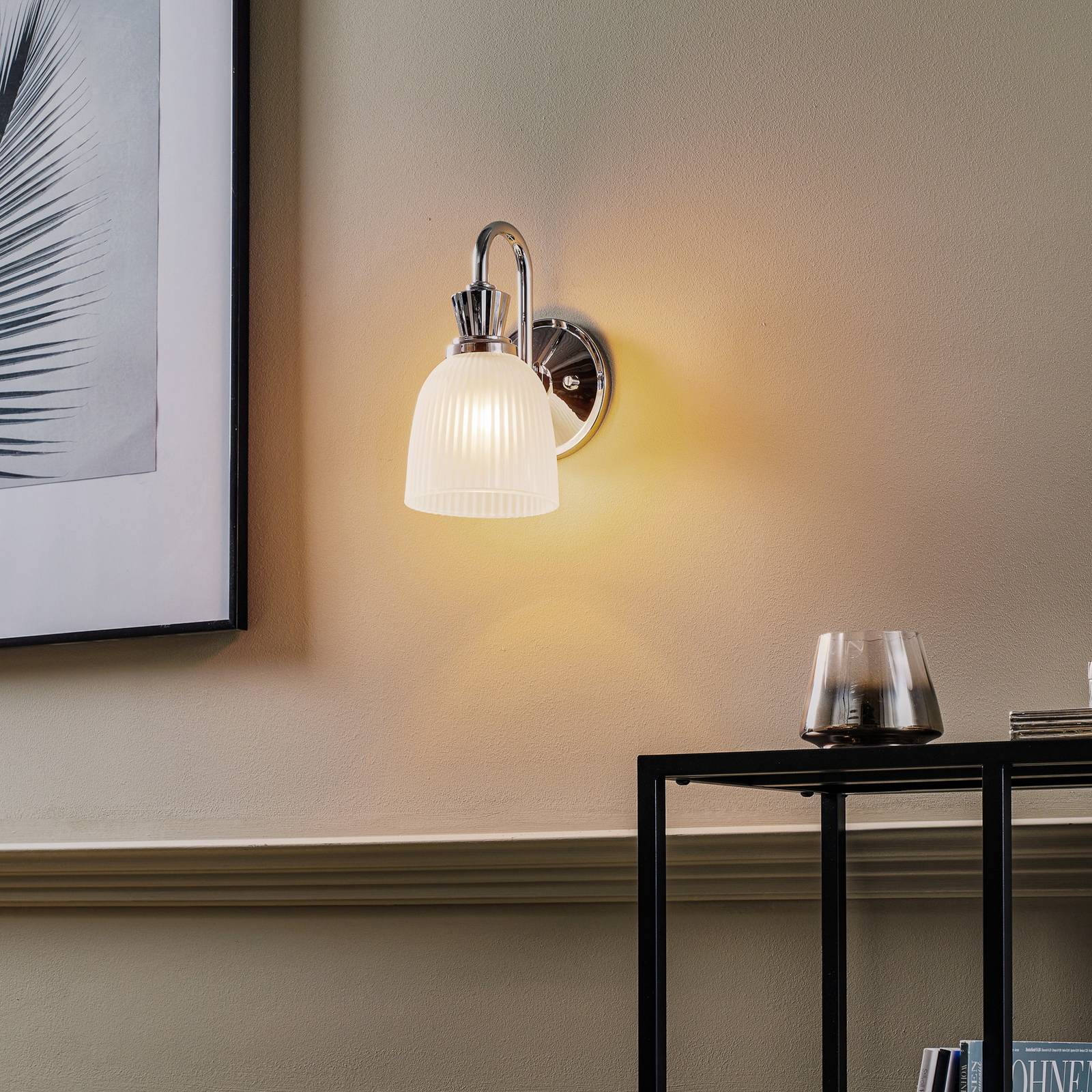 1-plamenové LED nástěnné svítidlo Cora se skleněným stínidlem do koupelny Díky nadčasově elegantním křivkám a drážkovanému stínidlu ze skla je nástěnná LED lampa Cora v koupelně skutečným poutačem. Svítidlo je samozřejmě technicky vhodné pro použití ve vlhkých místnostech. Nástěnné LED světlo Cora nevypadá skvěle jen jako dekorativní umělecké dílo vedle nebo nad koupelnovým zrcadlem. Tato lampa může také svítit kdekoli na toaletě pro hosty nebo v koupelně jako další atmosférické osvětlení. Skleněné stínítko dokonale harmonizuje s jiskřivým chromovým vzhledem úsporné zářivky. I když nástěnná lampa Cora na sebe upozorňuje spíše nadčasovým a moderním designem, malým detailům nechybí potřebná propracovanost. Díky zakřivenému zavěšení se zdá, že bílé skleněné stínidlo elegantně plave ve vzduchu, zatímco Cora vydává své příjemné světlo přesně.