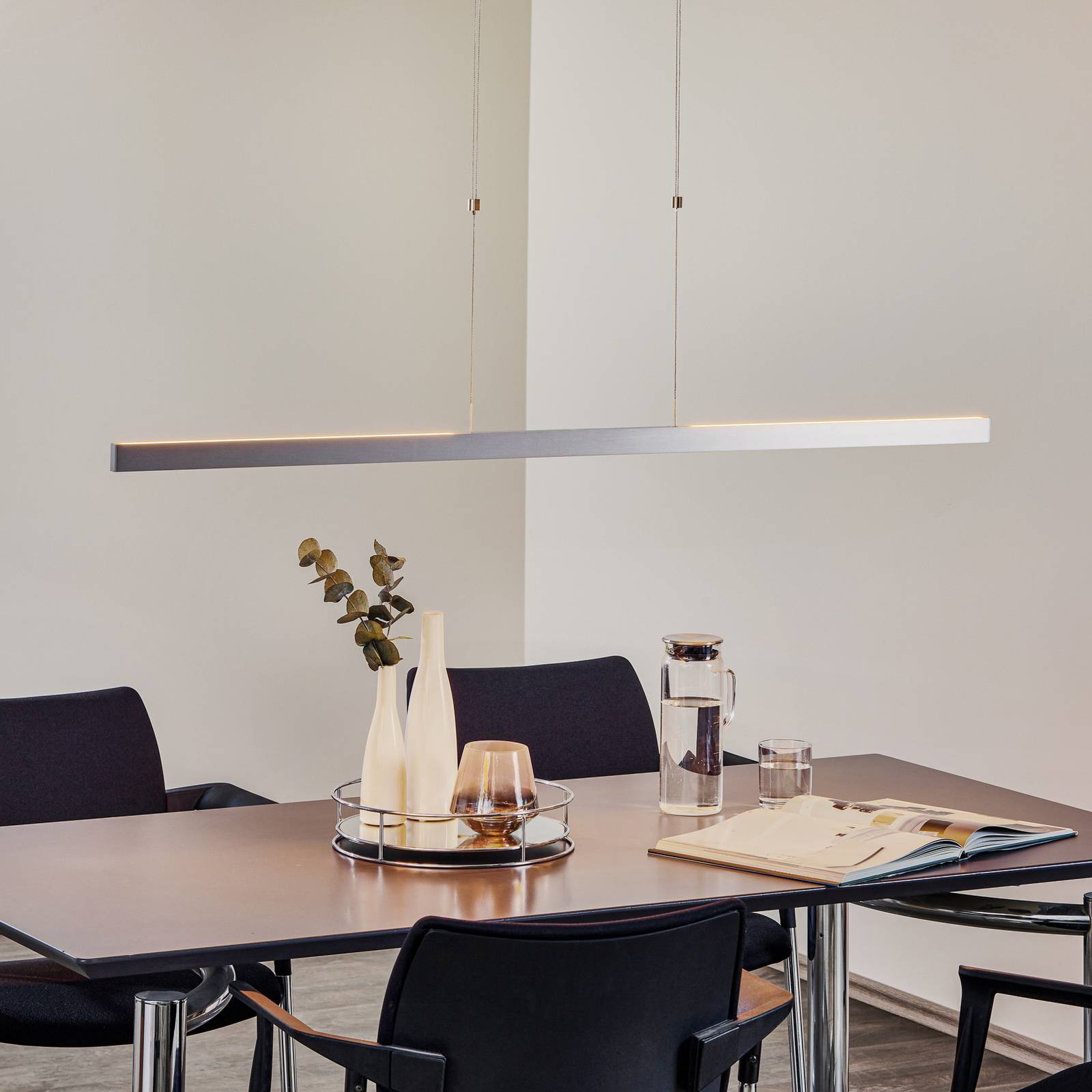 Moderní závěsné svítidlo Linn LED s ovládáním gesty, výškově nastavitelné Energeticky úsporné závěsné svítidlo Linn LED zaujme nejen svým nadčasově krásným vzhledem v matném niklu. Diskrétní závěsné svítidlo umožňuje spíše přímé i nepřímé osvětlení. Díky možnosti výškového nastavení nabízí svítidlo širokou škálu designových možností. Svítidlo lze namontovat individuálně podle potřeby, ať už nad obývací nebo jídelní stůl nebo konferenční stůl. Jednou z dalších předností tohoto puristického svítidla je ovládání dvěma gesty. Díky této technologii lze závěsné svítidlo Linn nejen velmi snadno zapínat a vypínat, ale také plynule stmívat několika cílenými pohyby ruky. Závěsné svítidlo tak svým příjemným světlem přispívá přesně k požadované atmosféře v místnosti. Díky rovnému kovovému vzhledu se závěsné svítidlo přizpůsobí i nejrůznějším stylům bydlení a koncepcím vybavení. S tímto energeticky úsporným svítidlem si přijdou na své i příznivci minimalismu.