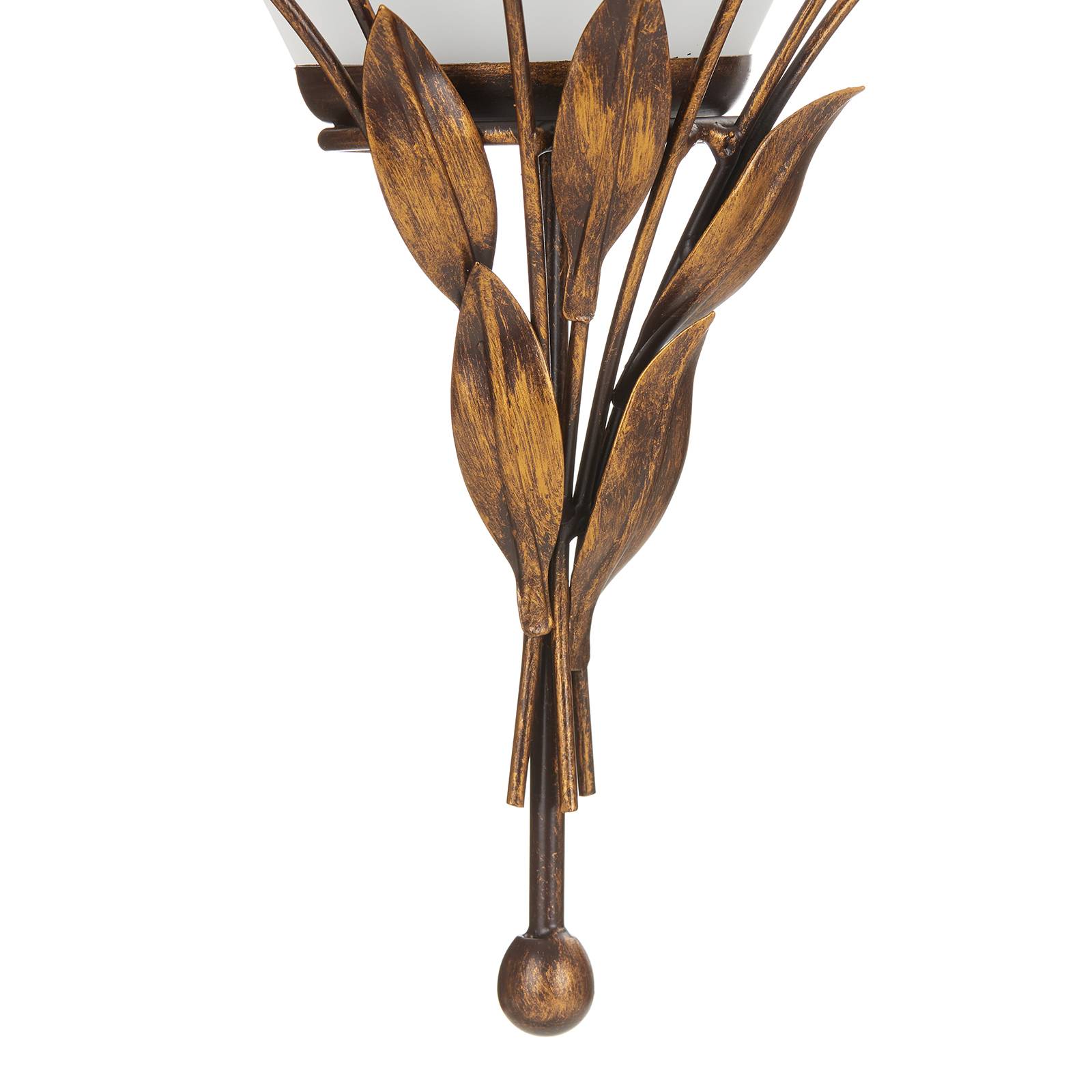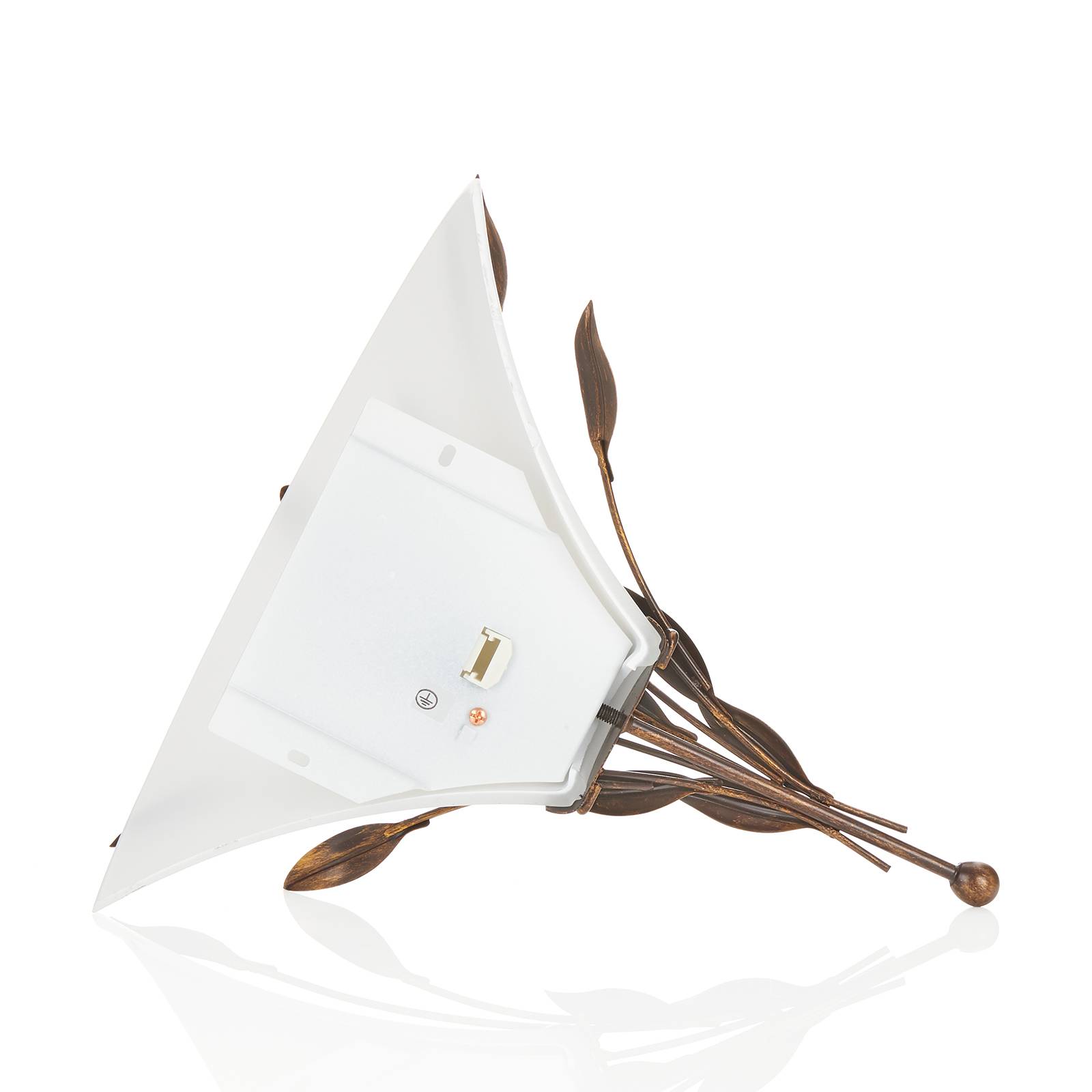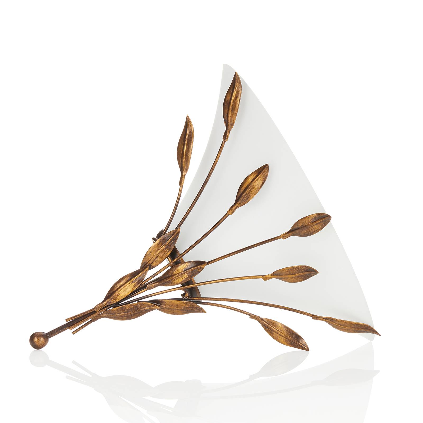 Dekorativní nástěnná lampa Campana s kouzlem květůUšlechtilý design skleněných květů je kouzlem nástěnné lampy Campana ve tvaru trychtýře. Větve, které byly patinovány zlatou barvou, působí spolu s kovovou tyčí v rezavě hnědé barvě velmi vznešeně. Trychtýř z opálového skla dodává lampě finální podobu.