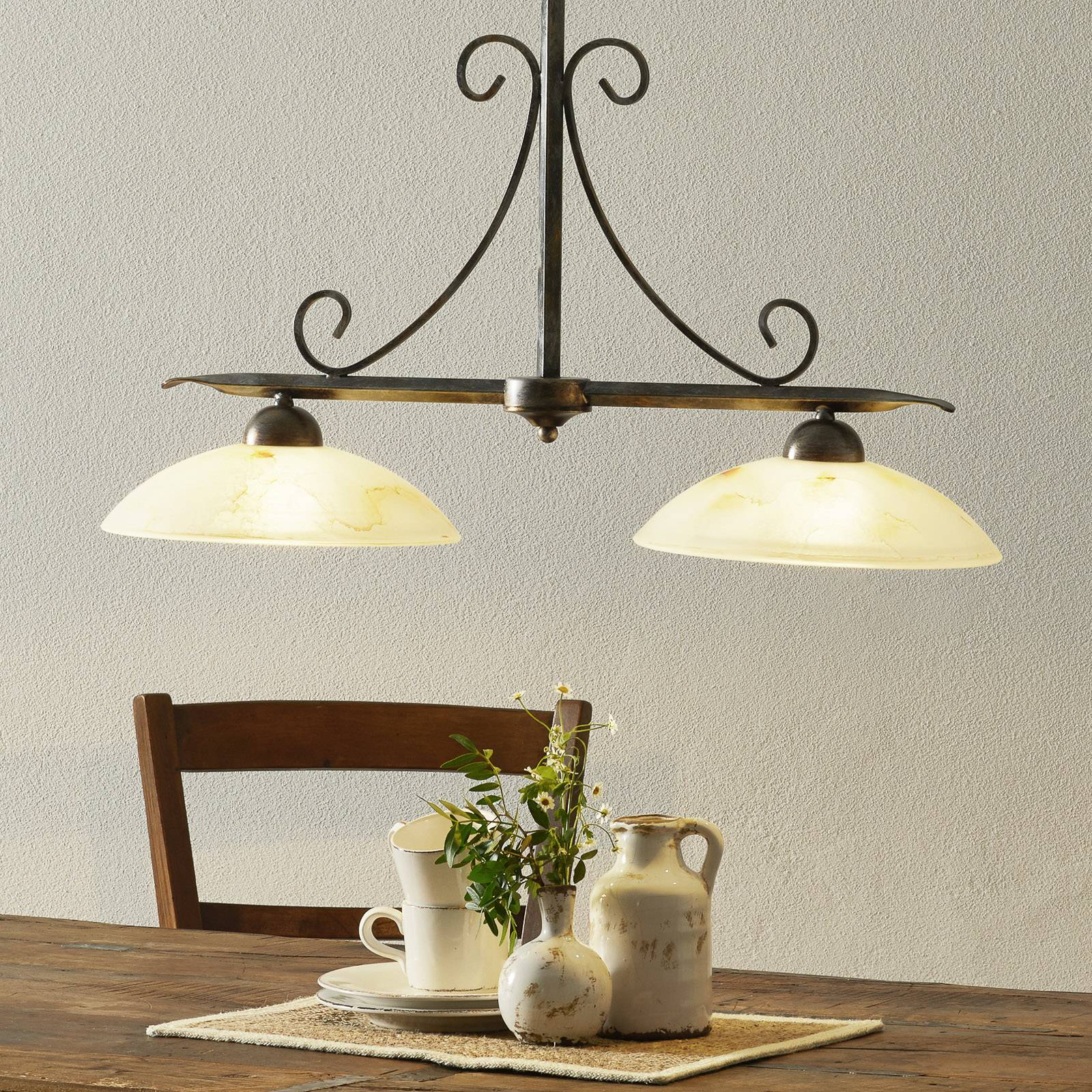 dvoulampový závěsný lustr DANA ze starostříbrného kovu a mramorovaného sklaDvoulampový závěsný lustr DANA inspiruje ušlechtilým designem ze starostříbrného kovu a mramorovaného skla. Díky tomu se stane ozdobnou ozdobou obývacího pokoje nebo jídelny. Světlo jemně a hřejivě vyzařuje do místnosti přes dvě skleněná stínidla jantarové barvy. Kvalitní zpracování činí z lampy německo-italského výrobce světelný objekt s dlouhou životností.