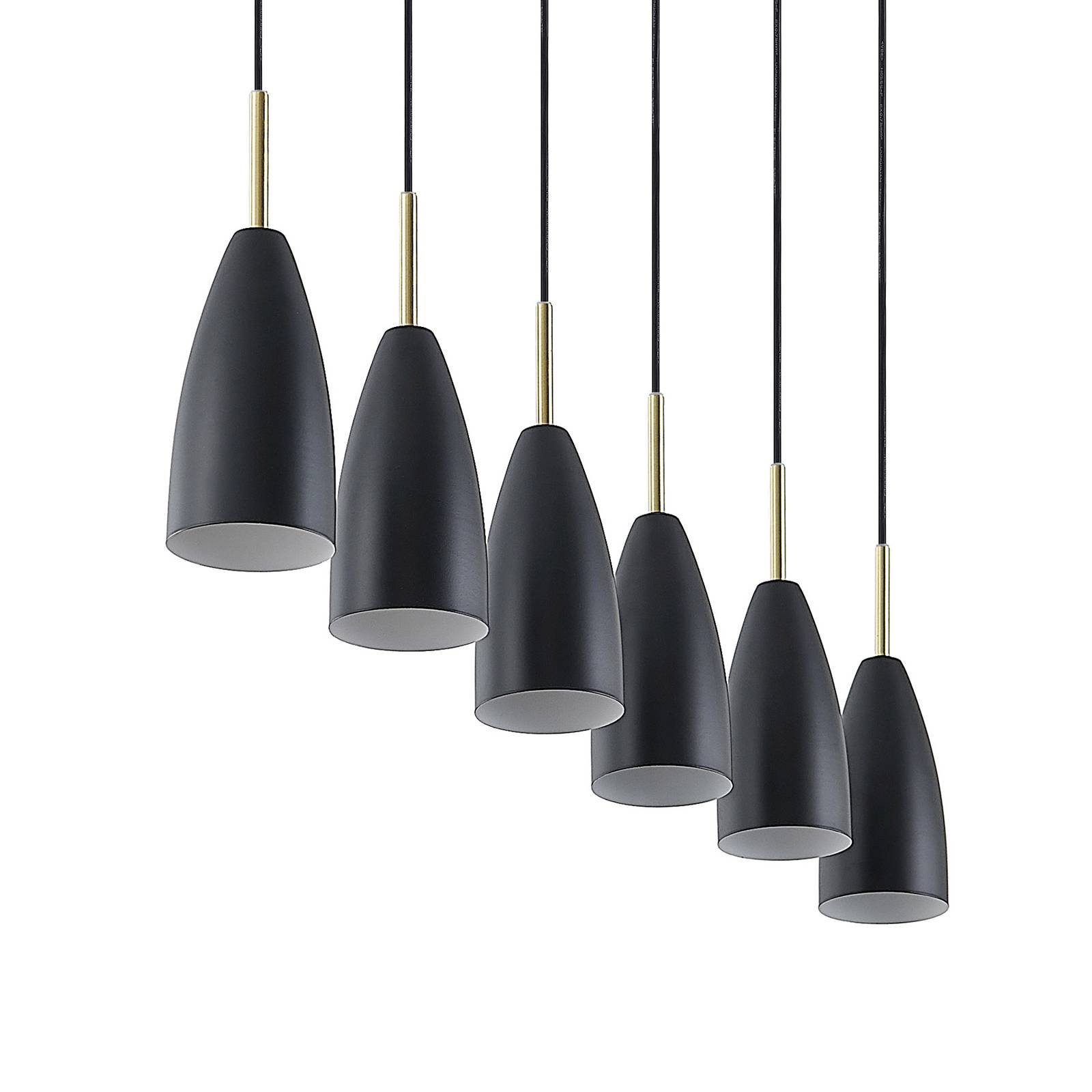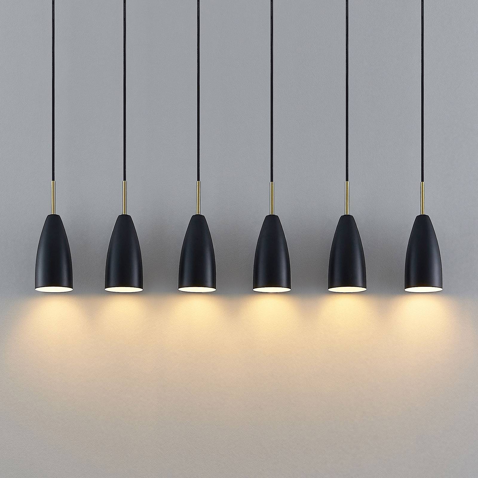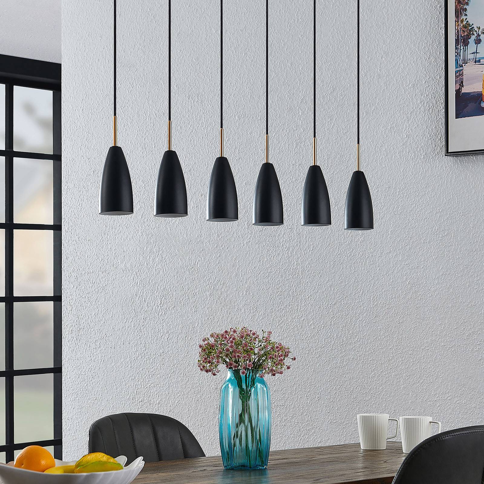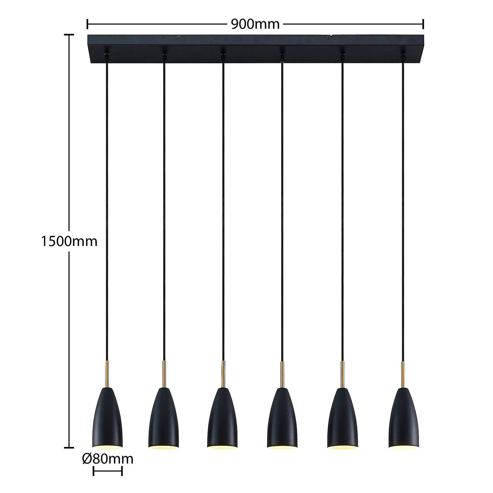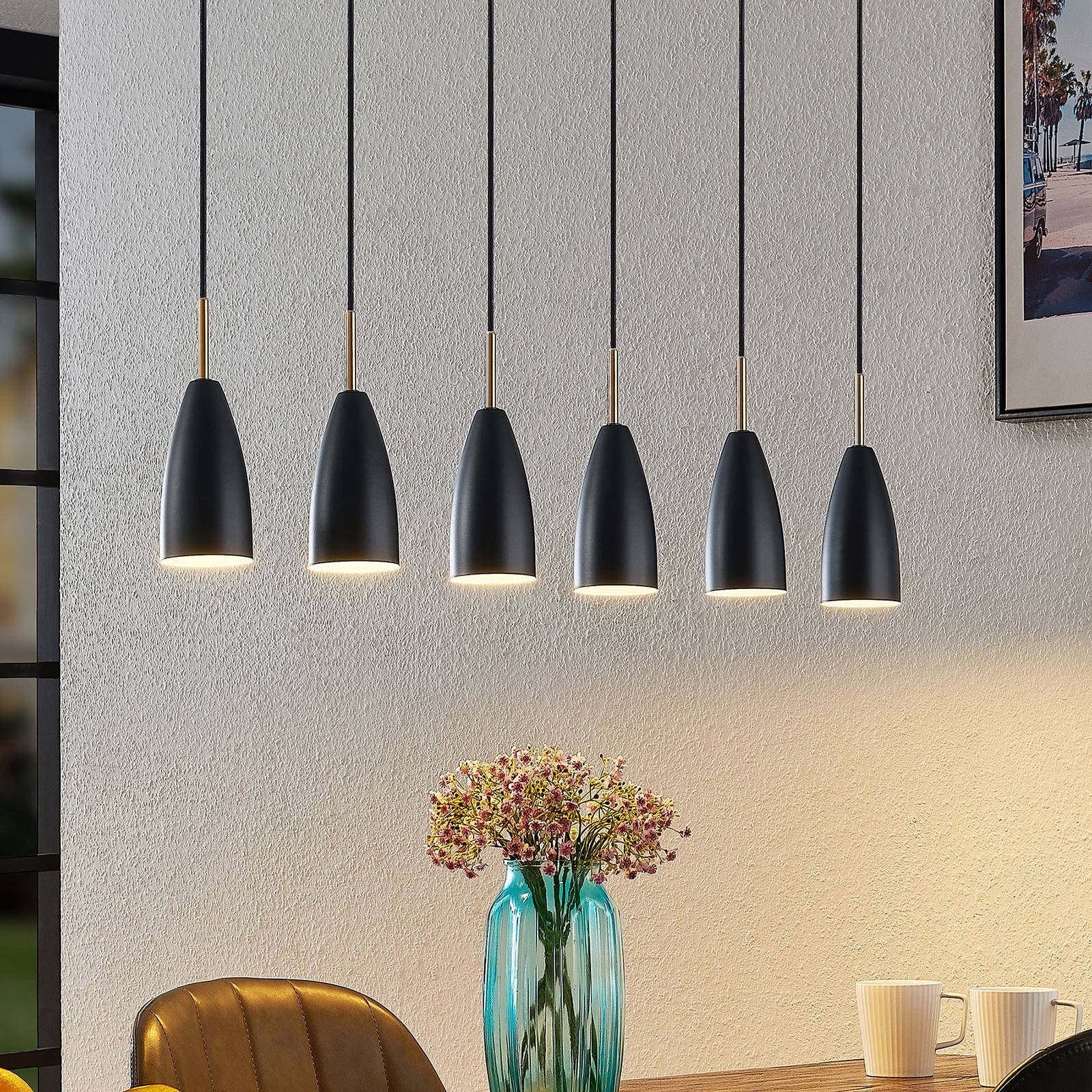 Závěsné svítidlo Caylee se šesti lampami a úzkými stínidly v černé barvě Caylee se krásně hodí k osvětlení jídelního stolu a je to závěsná lampa s celkem šesti černými a kulatými kovovými stínidly v řadě za sebou. Jídelní stůl tak může být skvěle osvětlen, aniž by oslňoval okolí. Díky konstrukci se šesti plameny lze bez problémů osvětlit i větší stoly a desky. Stínidla jsou velmi úzká a vyrobená ze železa, které je zvenku černé a zevnitř bílé. Nad každým stínidlem je umístěn úzký dekorativní prvek z mosazi, který vítaným způsobem narušuje černou barvu.