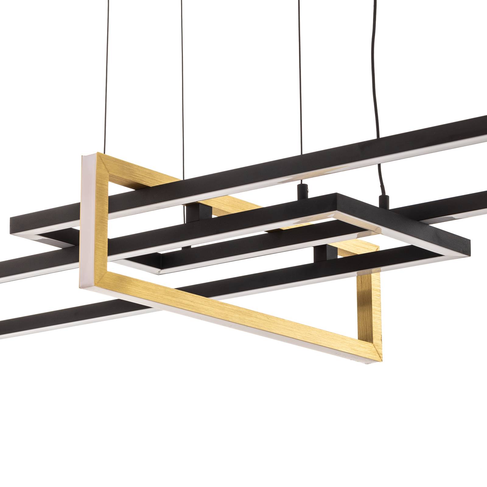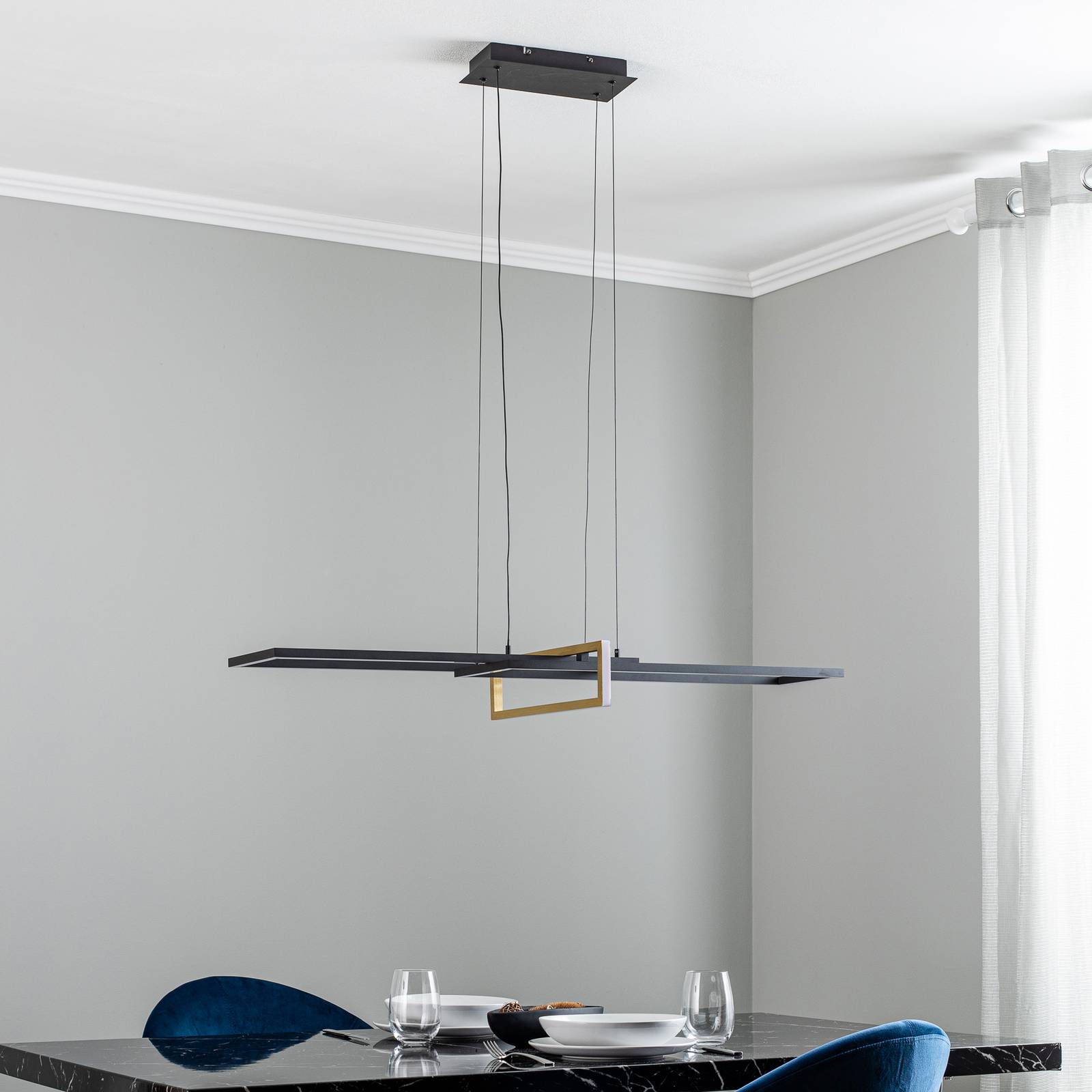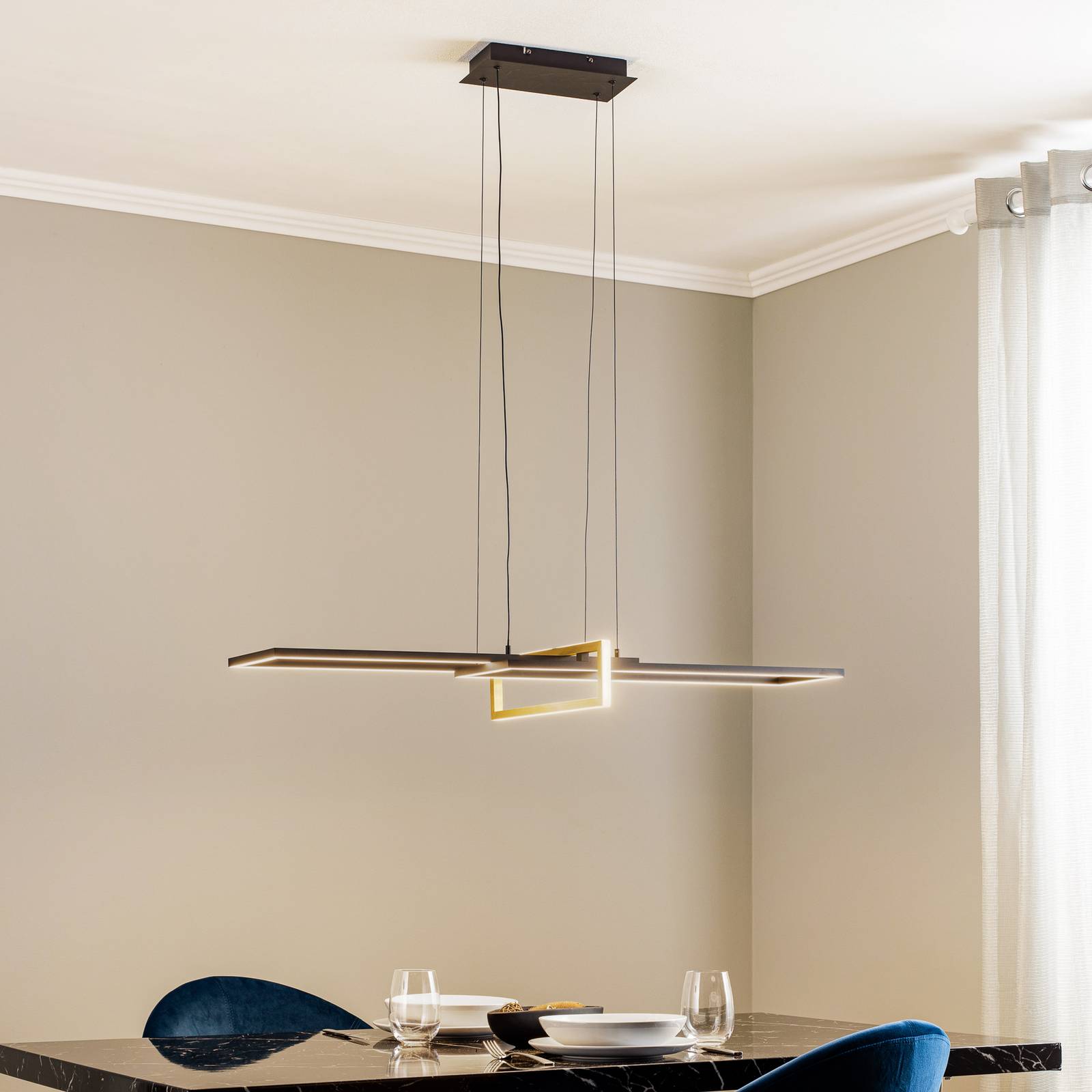 Přepínatelné závěsné svítidlo Jadoris LED s podlouhlým rámem v černé barvěJadoris je závěsné svítidlo LED, které zaujme velmi moderním designem a které lze díky funkci přepínání a stmívání pomocí nástěnného vypínače nastavit na tři úrovně jasu. Tělo svítidla připomíná dva podlouhlé rámy, které jsou osazeny LED diodami. Ty září příjemnou teplou bílou barvou a vytvářejí tak krásnou atmosféru obývacího pokoje a jídelny. Další, menší rámeček s LED diodami je uspořádán vertikálně.3stupňové vypínání: Pomocí nástěnného vypínače lze svítidlo zapínat a vypínat obvyklým způsobem. Třístupňová technologie stmívání s integrovanou funkcí vypnutí umožňuje také několikanásobným stisknutím spínače snížit jas na tři různé úrovně: 100 %, 50 % a 25 %.