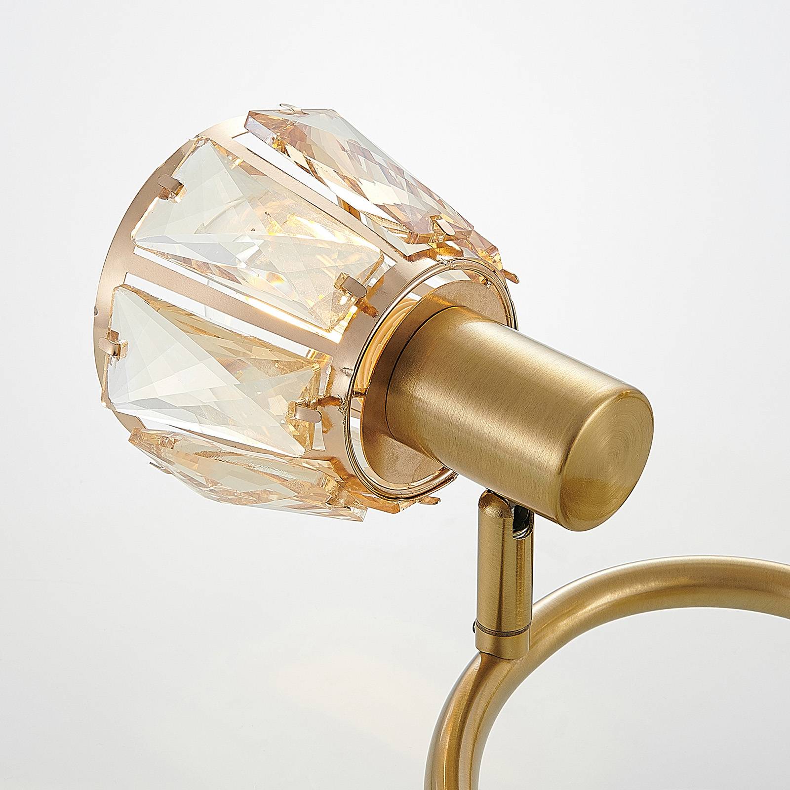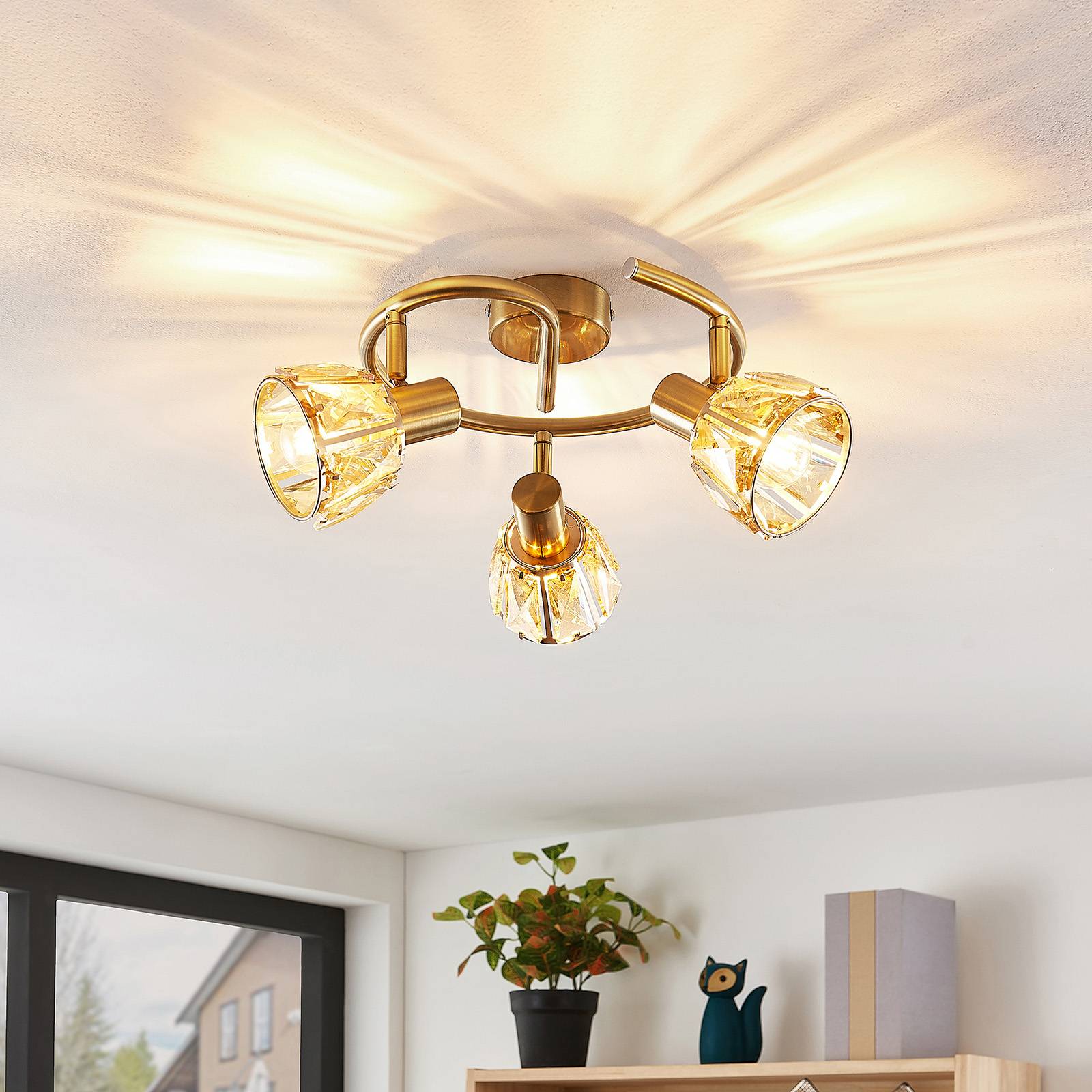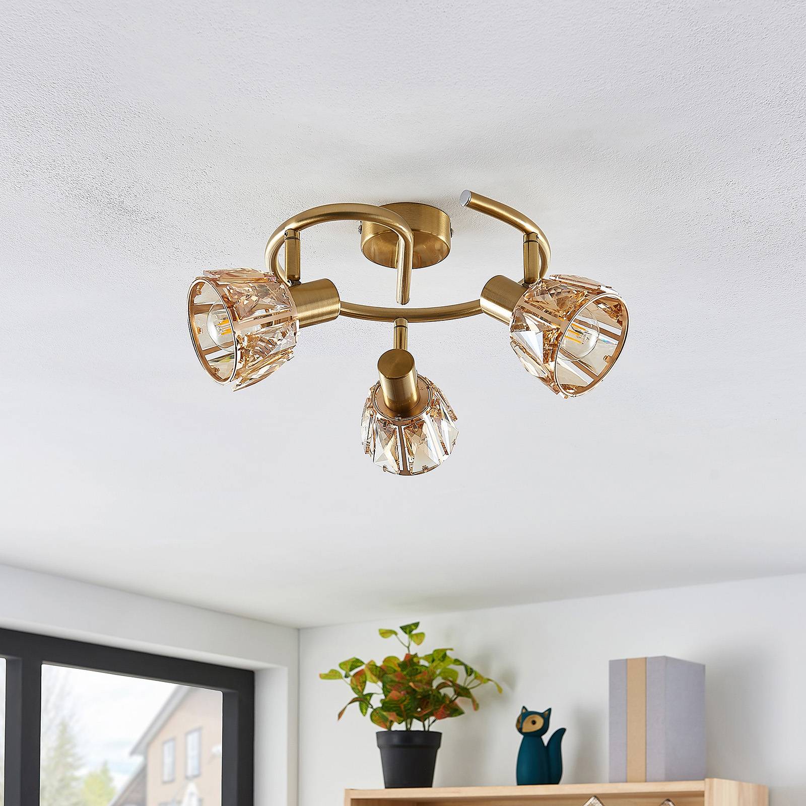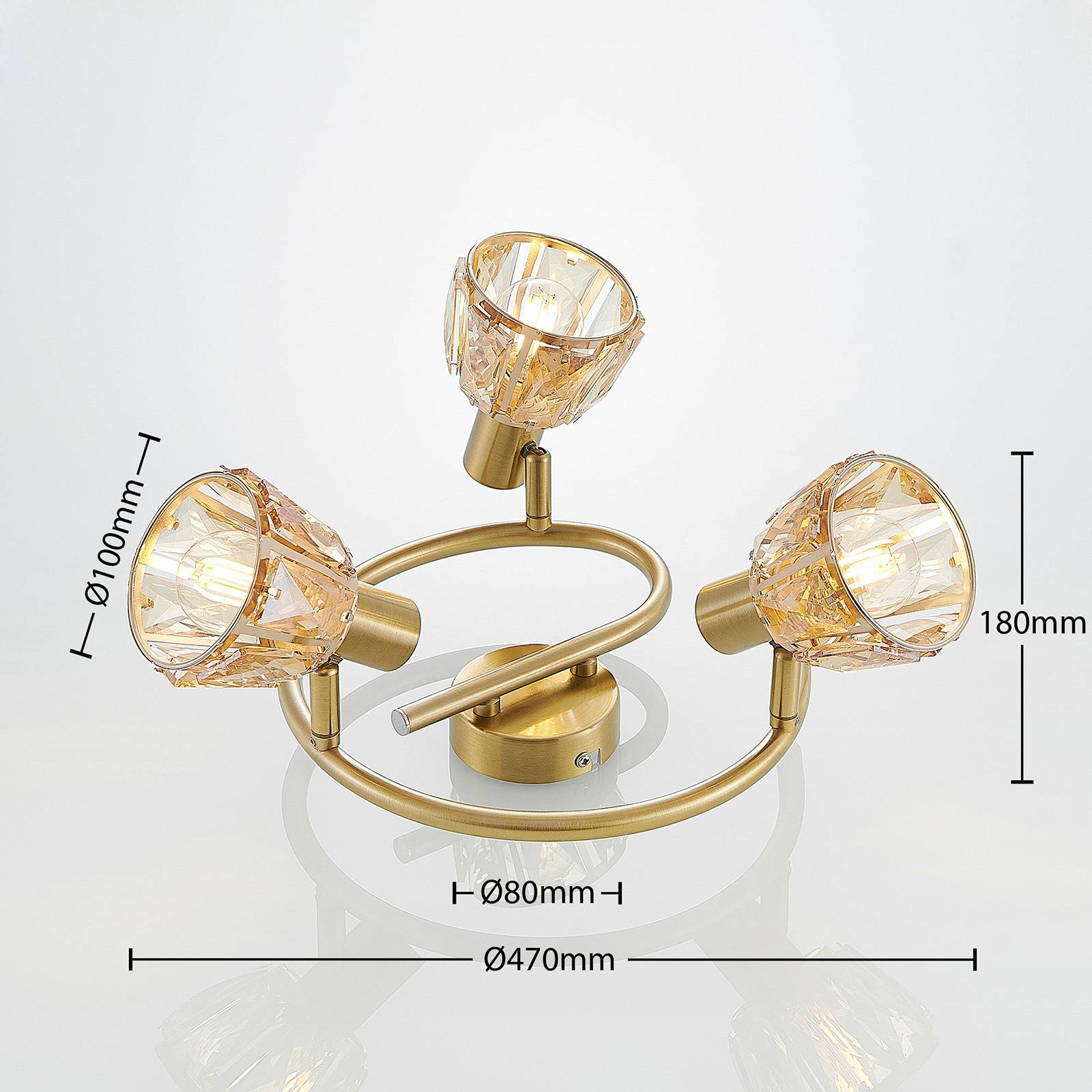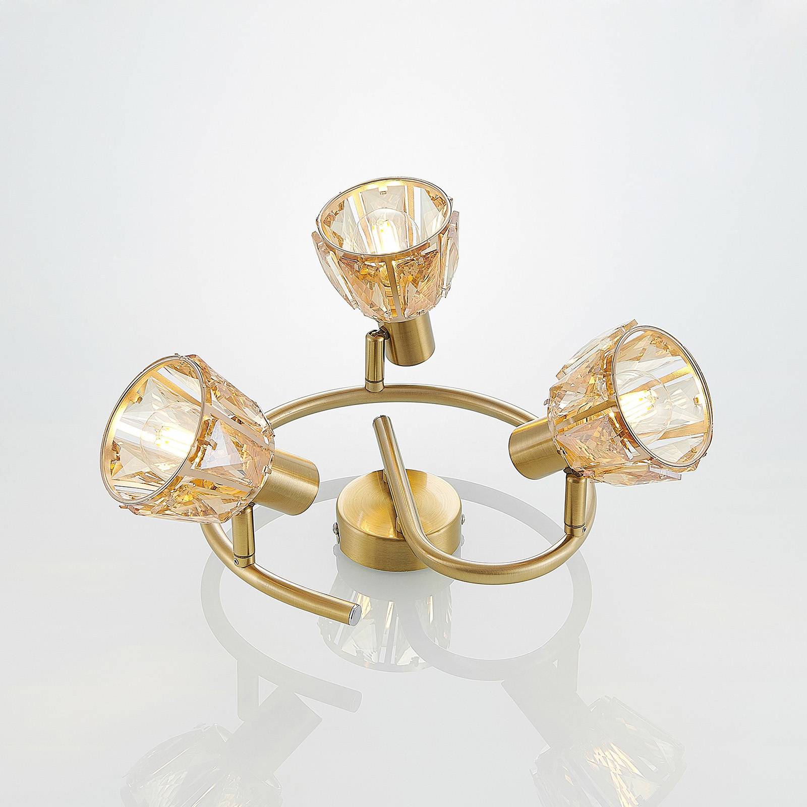 Mosazný strop Kosty se třemi deštníky z jantarového skla a kovu Tento stropní světlomet má atraktivní tvar nástupiště a tři pohyblivé slunečníky, které jsou připevněny ke stropnímu prvku spoji a lze je otáčet a otáčet podle libosti. Použité sklo je jantarové, díky čemuž je obraz teplejší, a má leštěný povrch, který poskytuje četné reflexy světla, které jsou obvykle vnímány jako krásné jiskření, a také atraktivní hra světla a stínu v blízkosti lampy. S mosazným kovovým povrchem je celkový výraz stropní lampy Kosta klasičtější.