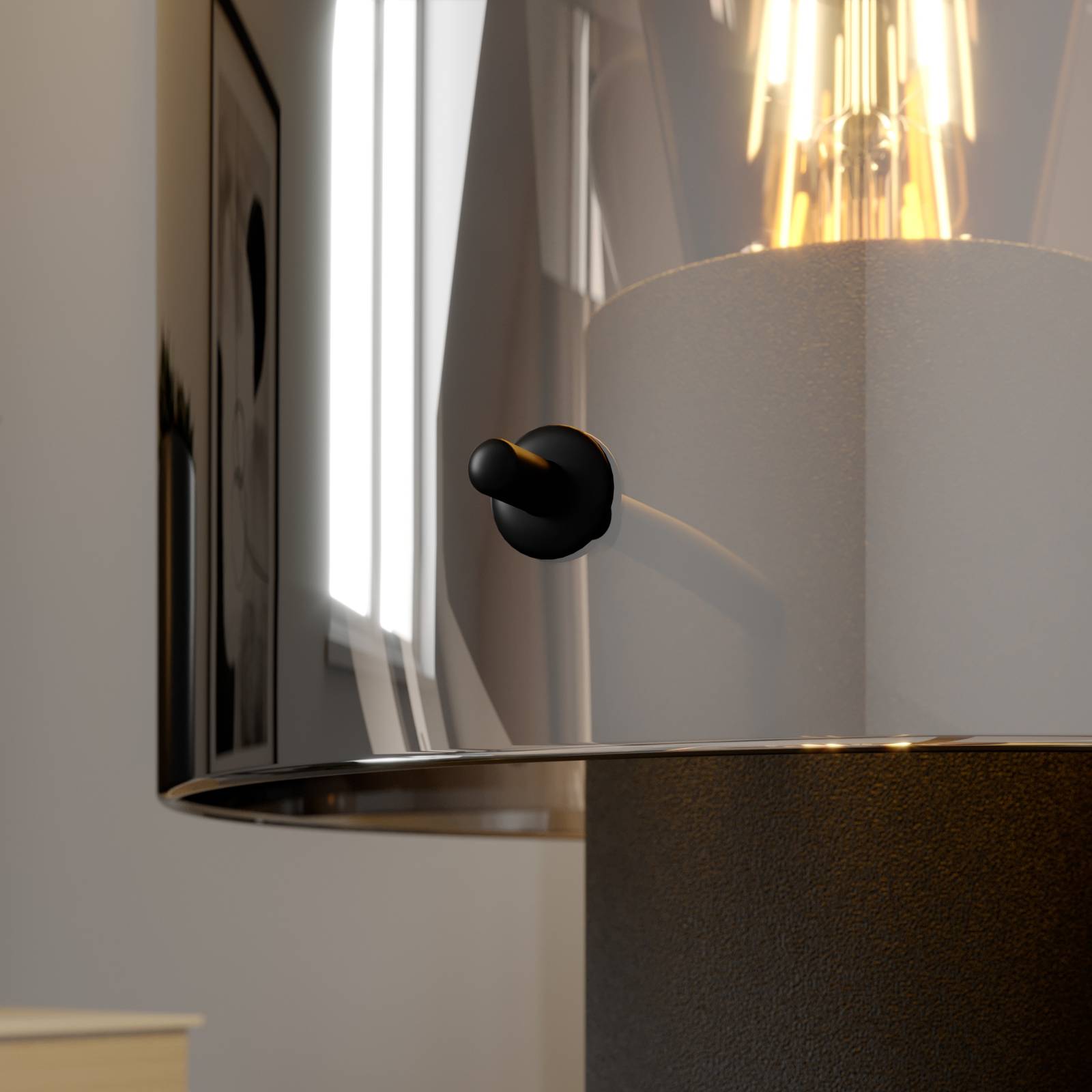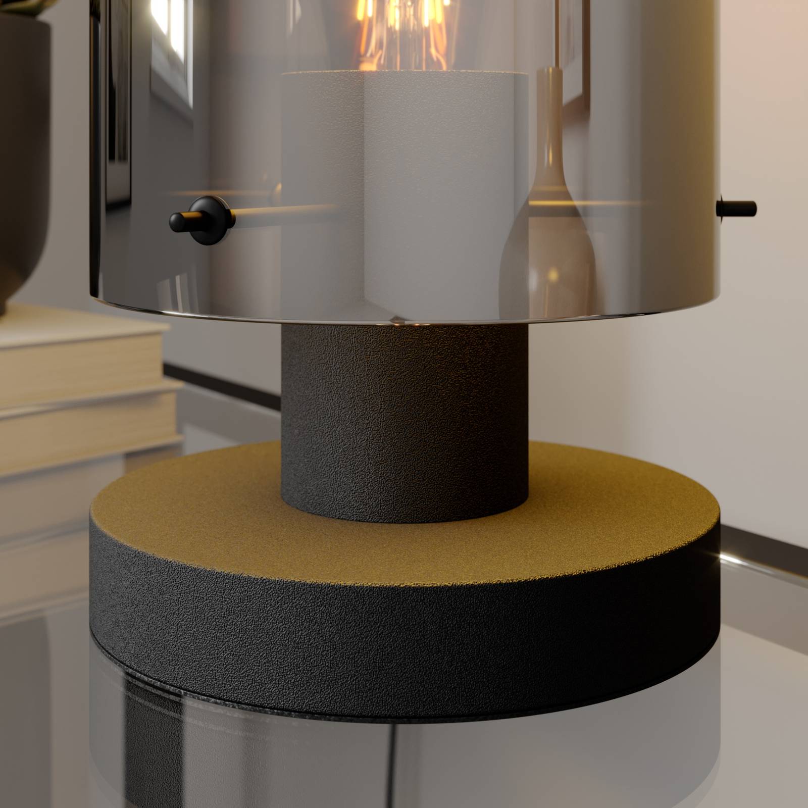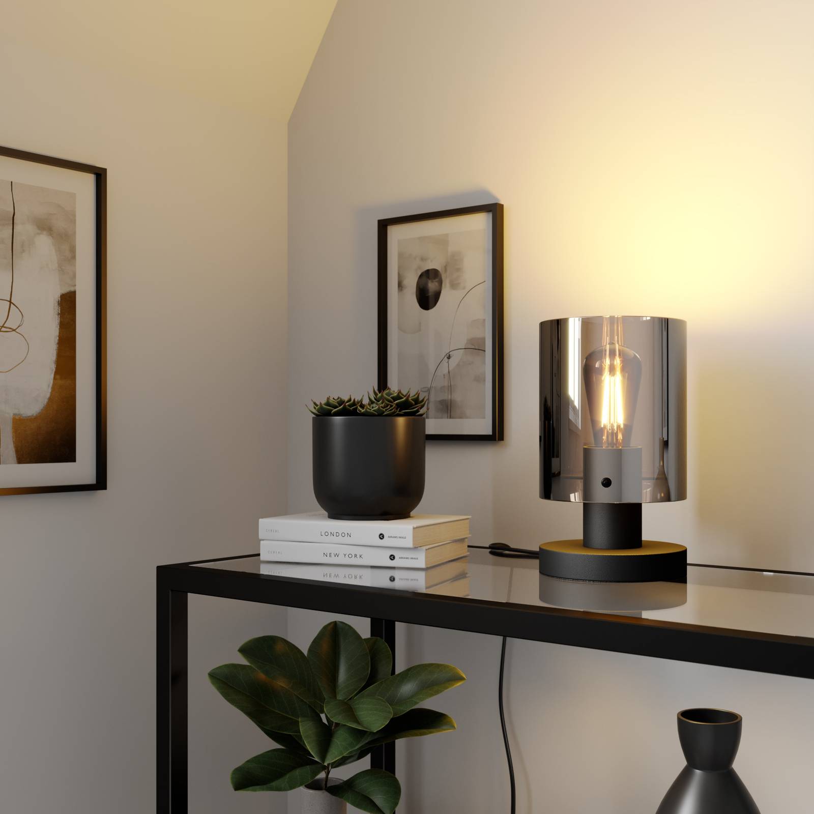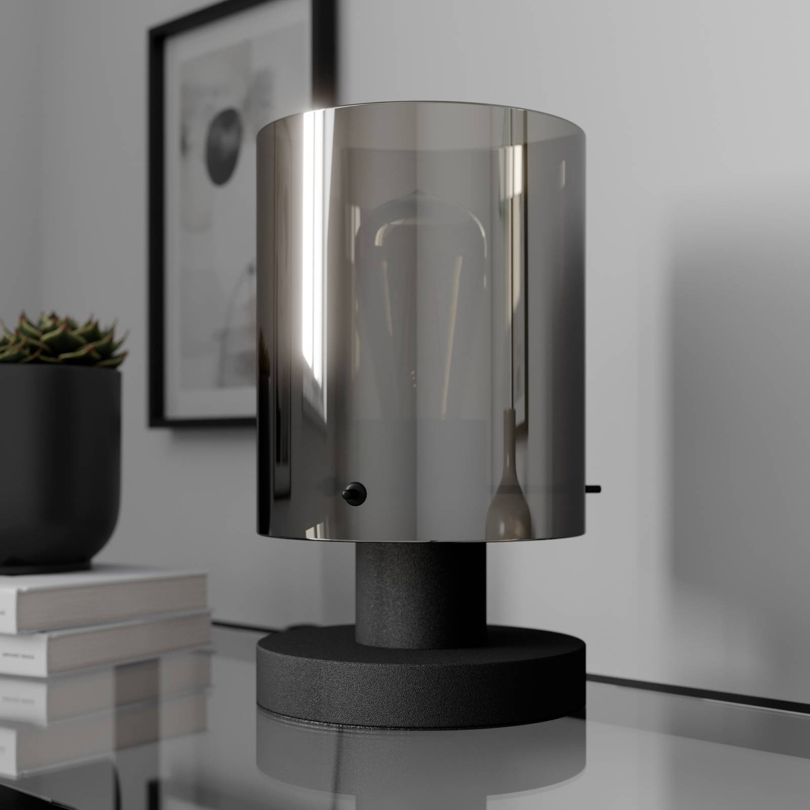 Stolní lampa Kourtney zaujme svou moderní povrchovou úpravou z kouřového skla Stolní lampa Kourtney se skládá z černé kovové patice, která drží kulaté stínidlo ze skla. Sklo není úplně průhledné. Místo toho má skvělý chromový efekt, který je také známý jako vzhled kouřového skla. Je to způsobeno tmavým zabarvením, které budí dojem, že sklo bylo zabarveno kouřově v plameni svíčky. Tento efekt je velmi populární, takže Kourtney je v trendu. Sklo však nejen dobře vypadá, ale také poskytuje skvělé světelné okamžiky, protože záře světla proniká zvenčí pouze tlumeným způsobem a poskytuje jemné osvětlení. Měkké světlo je obzvláště žádoucí v obývacím pokoji nebo v ložnici a lze ho krásně realizovat pomocí této stolní lampy.