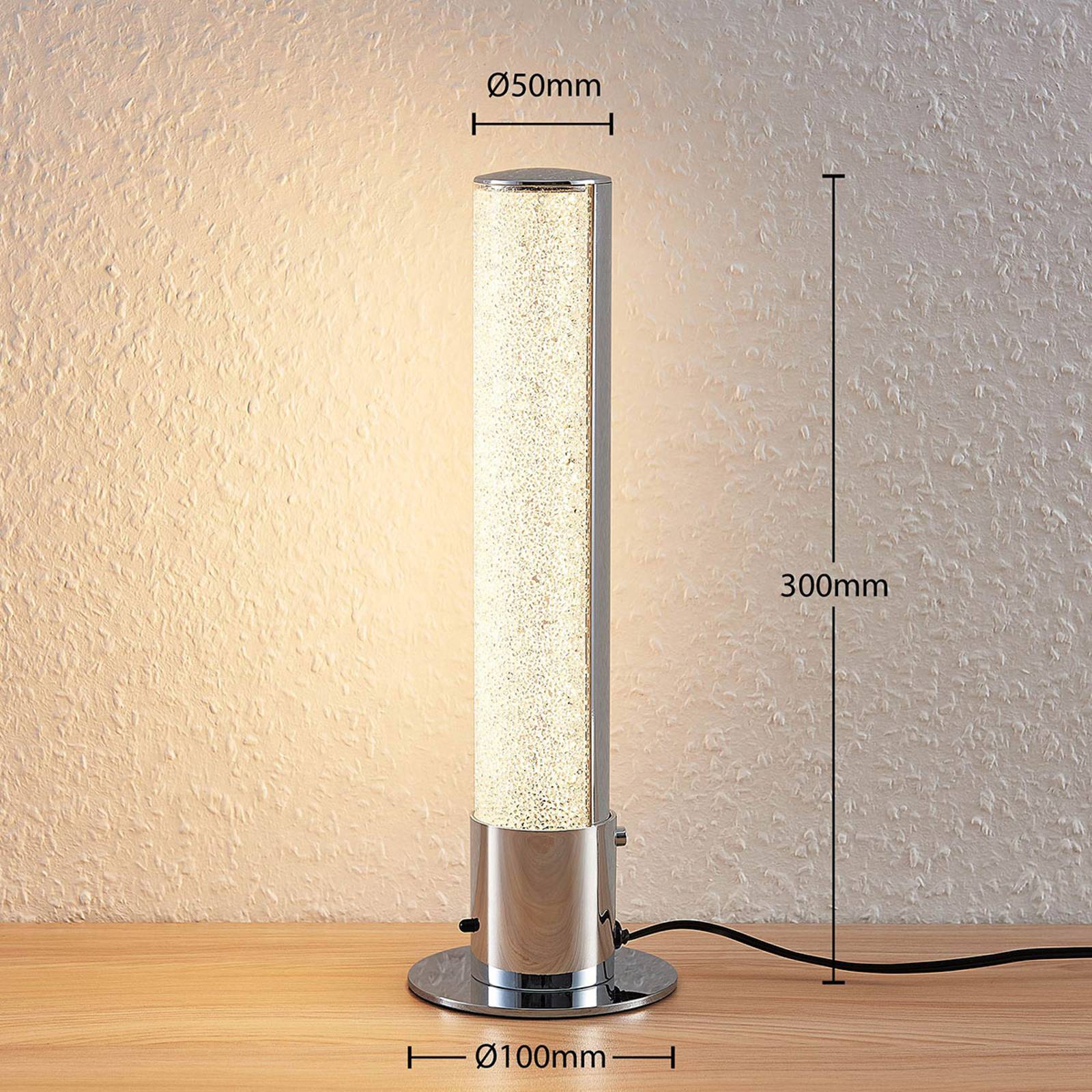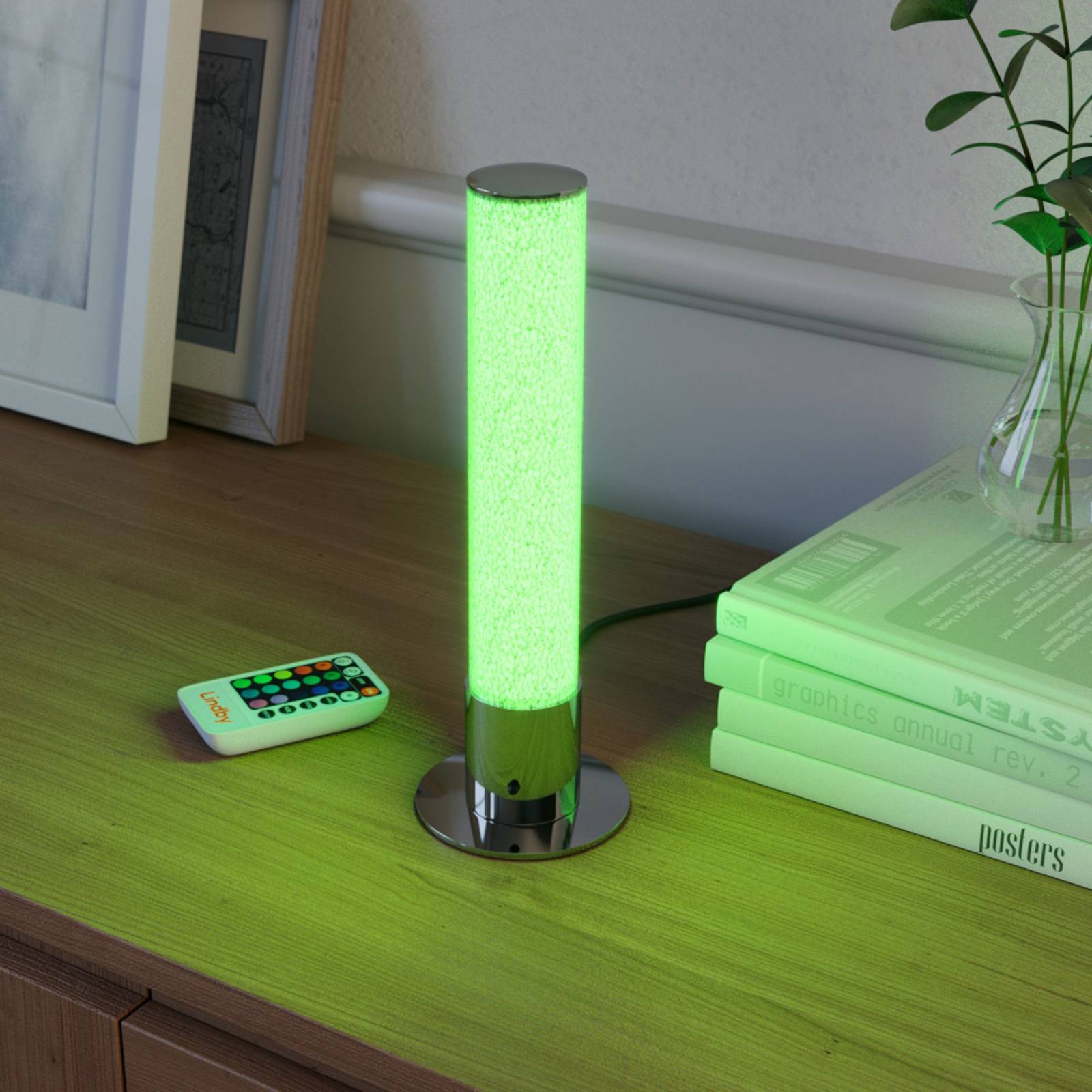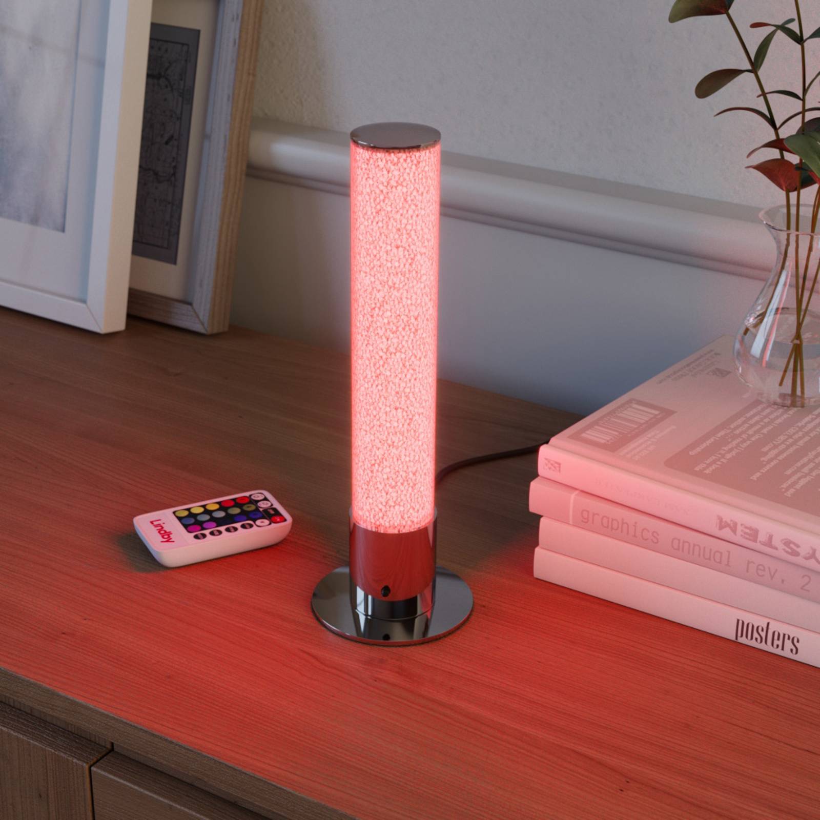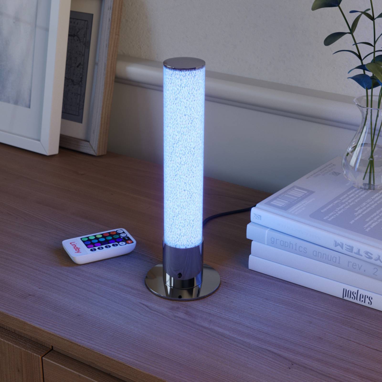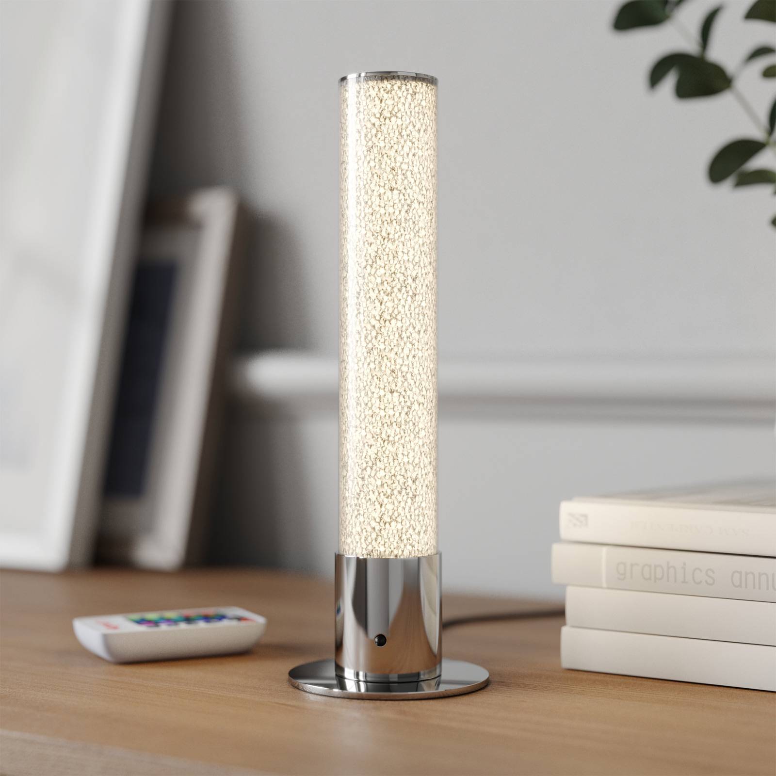 Válcová stolní LED lampa Fria s krystalickou strukturou, dálkovým ovládáním a funkcí změny barev RGB Stolní LED lampa Fria patří bezesporu k moderním světelným zdrojům s rovným válcovým stínidlem úzkého tvaru. Technologie RGB LED je také velmi nová, a proto přichází ve stylu stále populárnějšího osvětlení chytré domácnosti. Abyste mohli funkci změny barev využívat naplno, je svítidlo dodáváno s dálkovým ovladačem, kterým lze ovládat teplou bílou barvu světla i jasné barvy. Dálkový ovladač navíc umožňuje měnit jas a tato funkce stmívání se v obytném prostředí hodí vždy, když je potřeba svítit obzvlášť útulně a s nízkou svítivostí. Krystalická struktura uvnitř válcovitého akrylového stínidla navíc zajišťuje ještě brilantnější vyzařování světla s působivým třpytivým efektem. – včetně dálkového ovládání s paměťovou funkcí – možnost barevného světla a teplého bílého světla – funkce stmívání pomocí dálkového ovládání