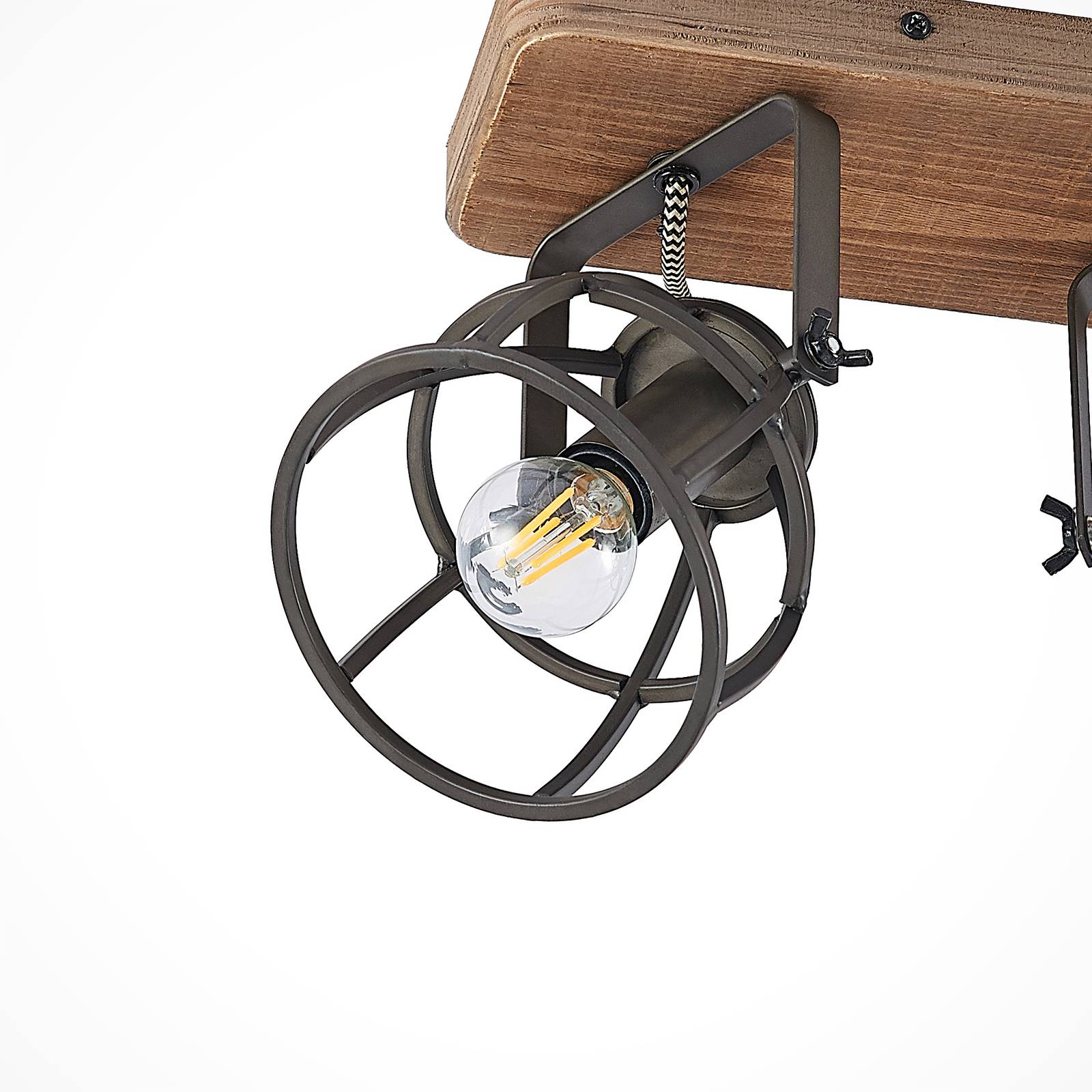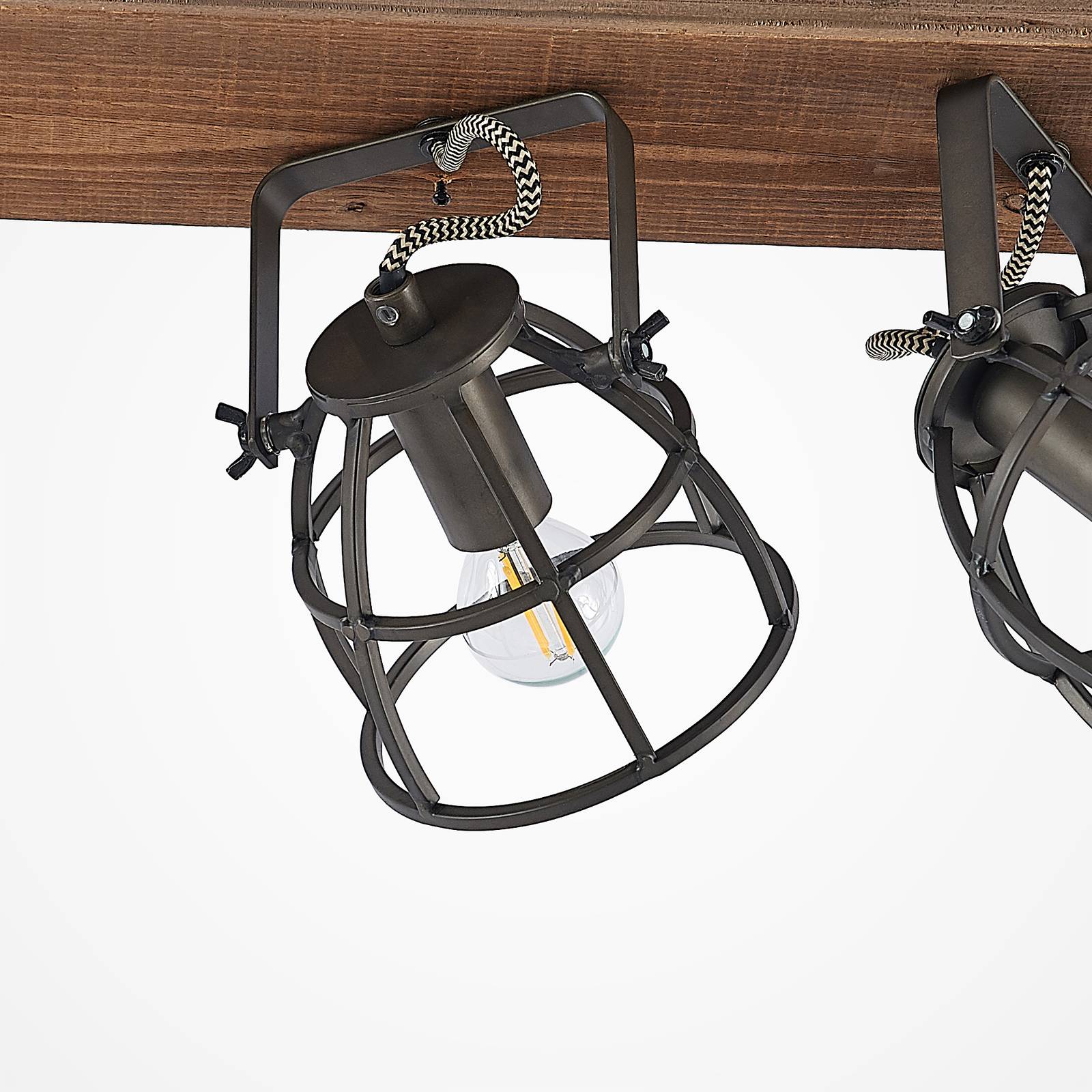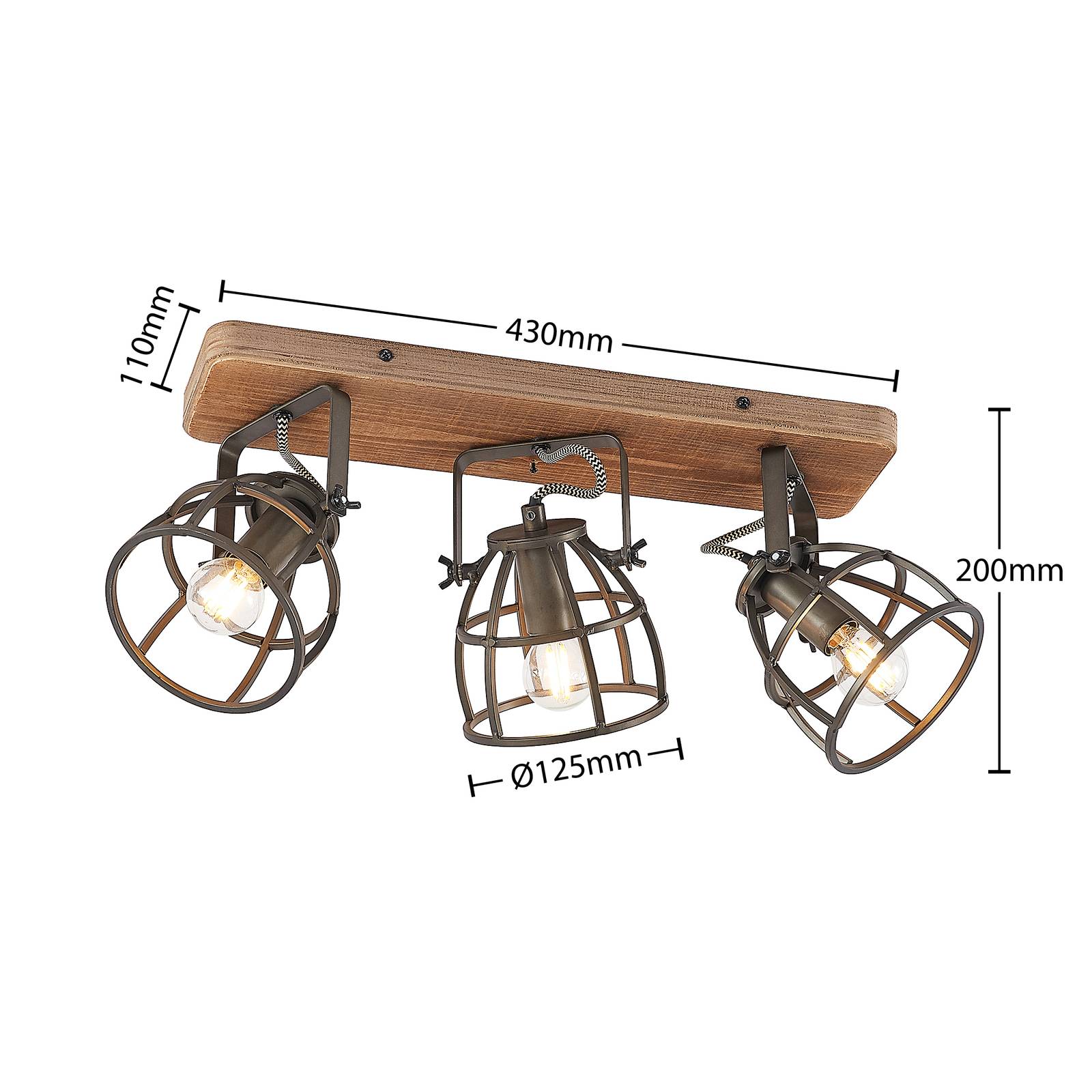 Stropní svítidlo Rutger se třemi klecovými stínítky na dřevěném krytu Stropní svítidlo Rutger se třemi plameny lze použít stejně dobře v pokojích s rustikálním designem, jako je tomu u nábytku v retro designu, protože světlo bylo navrženo v tomto. Na dřevěném vrchlíku, který dostal plamennou povrchovou úpravu, jsou v závorkách tři odstíny ve stylu klece. Lze je otáčet a otáčet, aby se změnila optika a světelné záření svítidla. Konstrukci žárovky lze nejlépe doplnit žárovkami, případně tónovanou žárovkou. Součástí dodávky nejsou žádné žárovky.