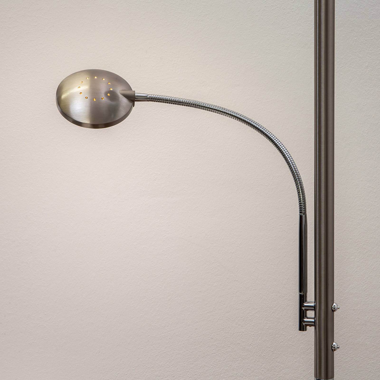 Intenzivní LED stojací lampa Malea s praktickým ramenem na čtení a stmívačem Tuto stojací LED lampu lze obsluhovat s vysokou mírou funkčnosti, protože nabízí bezpočet pozoruhodných výhod a funkcí. V první řadě je třeba zmínit, že díky integrované technologii LED je tato lampa obzvláště úsporná z hlediska spotřeby energie. Kromě toho je Malea vybavena nejen stropním osvětlením, které vrhá do místnosti krásné nepřímé světlo, ale má také čtecí osvětlení, které je navíc umístěné na konstrukci a lze jej optimálně nasměrovat díky ohebnému labutímu krku. Obě světla, stropní i čtecí, jsou vybavena stmívačem, který umožňuje ideální regulaci jasu teplého bílého světla. Pro regulaci podržte tlačítko stisknuté až do dosažení požadovaného jasu. Nad stropním osvětlením se nachází satinovaná skleněná deska. Stropní osvětlení: 1805 lumenů, čtecí osvětlení: 475 lumenů