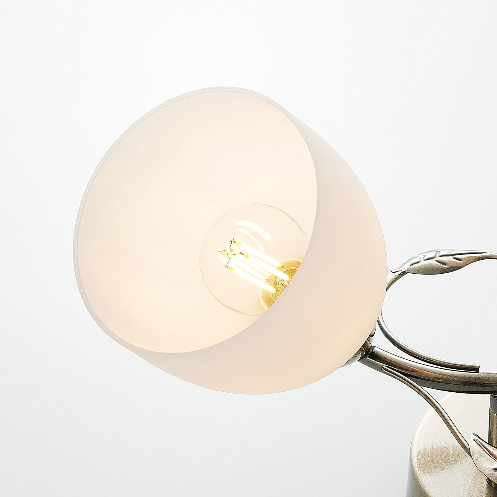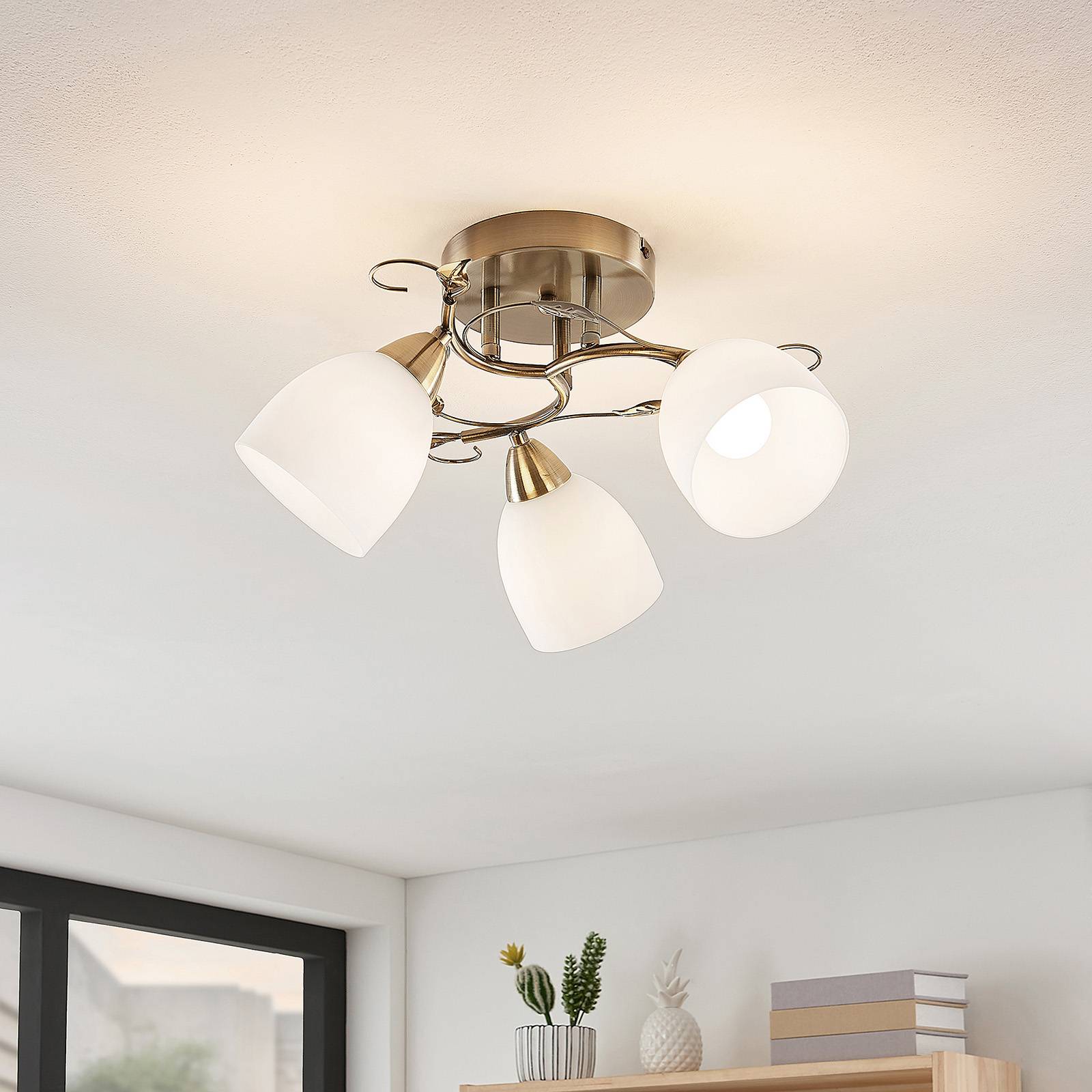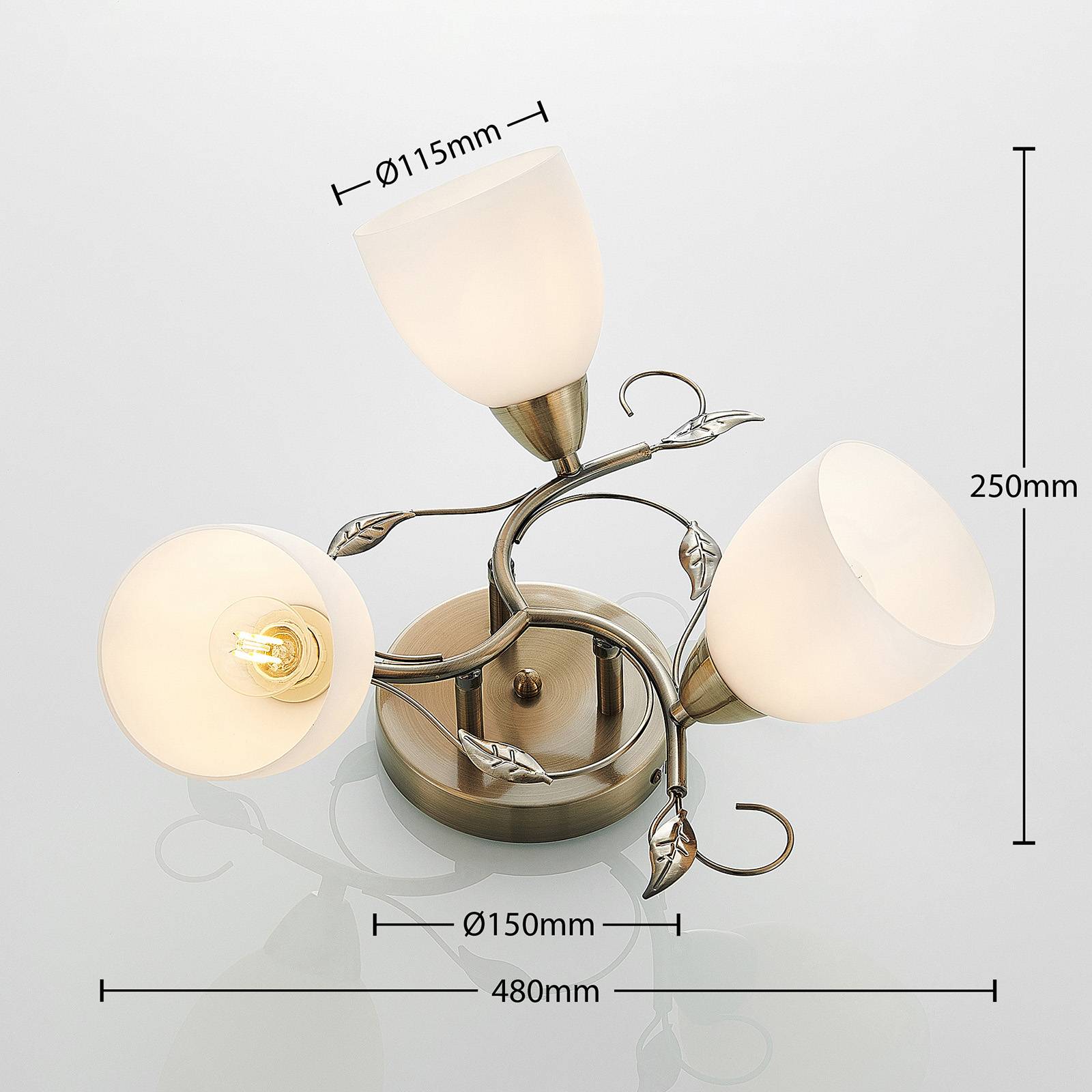 Třížárovkové stropní světlo Thaddeus s bílými skleněnými stínidly a rámem ze starobylé mosazi Na první pohled můžete vidět, jak dobře se stropní světlo Thaddeus hodí do klasických životních stylů. To je na jedné straně díky hravému vzhledu a zakřiveným kovovým prvkům, které vedou ke stínidlům a integraci prvků ve vzhledu lístků, a na druhé straně ke starožitnému povrchu ve staré mosazi. Tři stínidla jsou vyrobena z bílého skla v kulatém tvaru a rozkládají světlo hladce a rovnoměrně, přesně jak byste čekali od klasického osvětlení v obýváku.