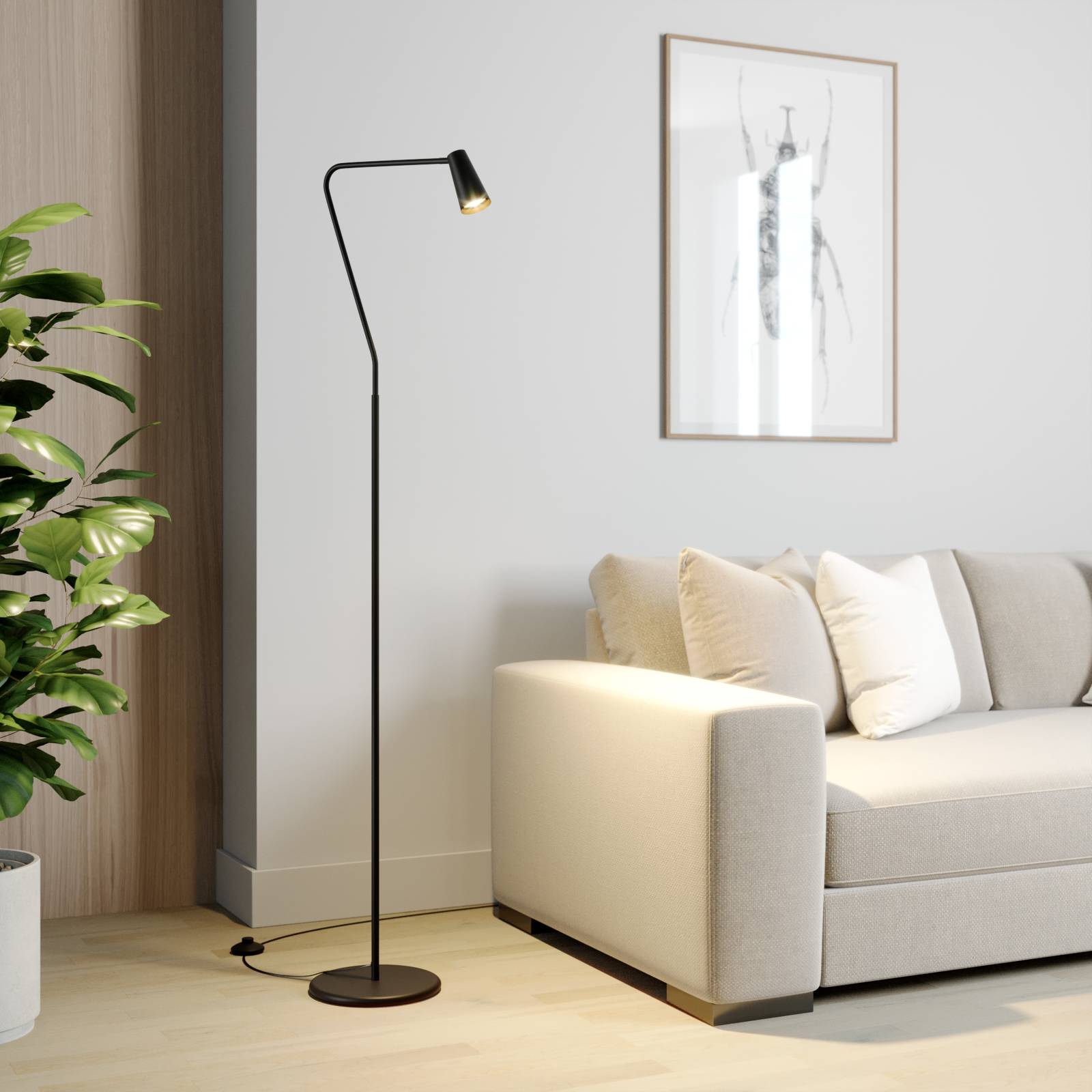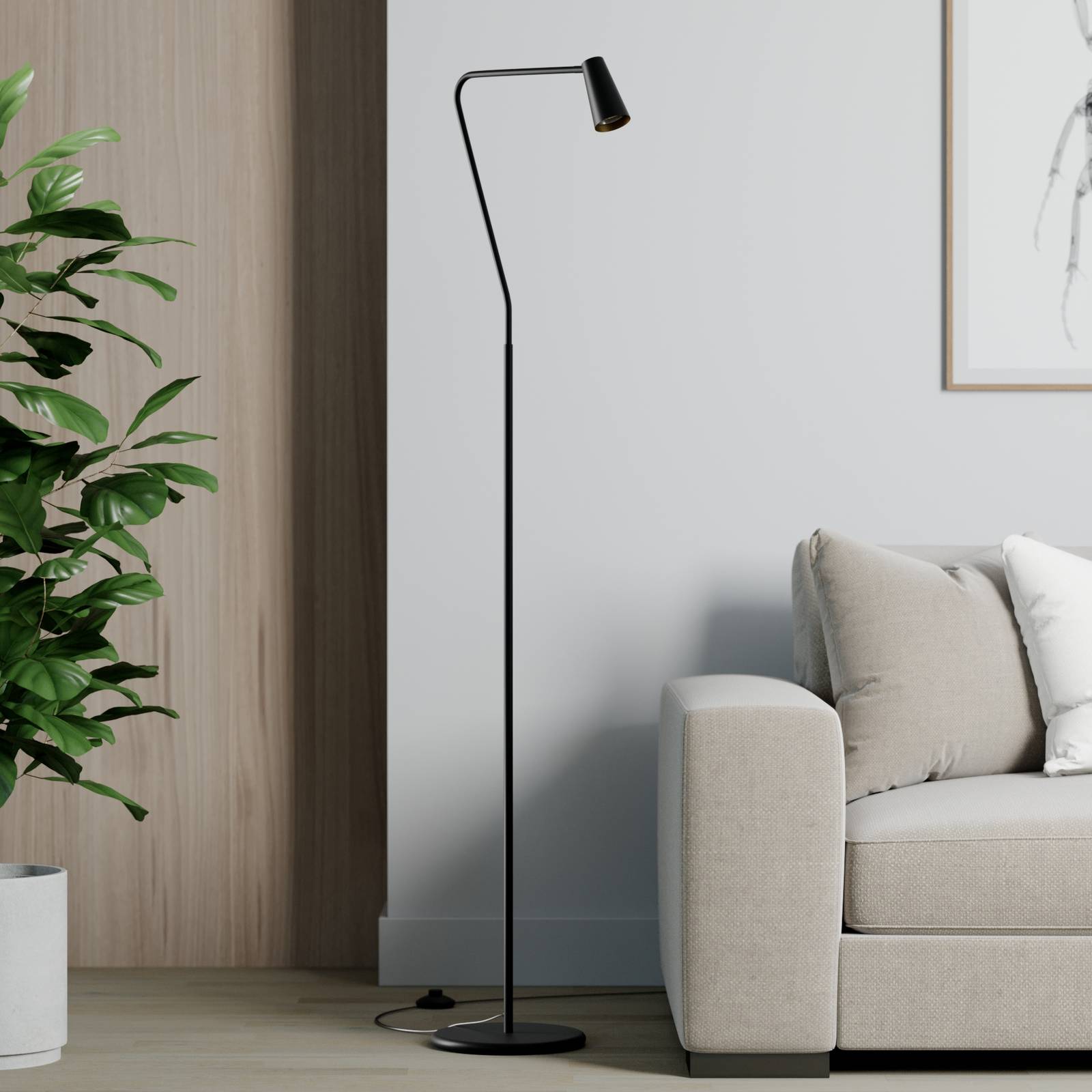 Štíhlí stojací lampa Angelina s černým povrchem a zlatou vnitřní stranou stínidla a nožním vypínačem Angelina je moderním zdrojem světla s jasným výrazem, vědomě se vyhýbá zbytečným podrobnostem. Stojáková lampa je ideální pro čtení a lze ji umístit na pohovku, například při pohodlném čtení knihy nebo procházení zásobníkem. Úzkou světelnou hlavici vyrobenou z kovu lze poněkud upravit. Vypadá to jako šálek a je černý na vnější straně, ale zlatá na vnitřní straně, což umožňuje příjemné reflexy světla, které jsou velmi útulné a teplé. Podlahová lampa je zapnuta vypínačem chodidla v napájecím vedení a měly by být použity LED svítilny se soketem GU10.