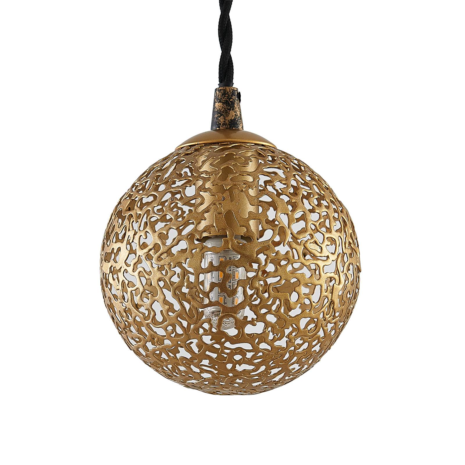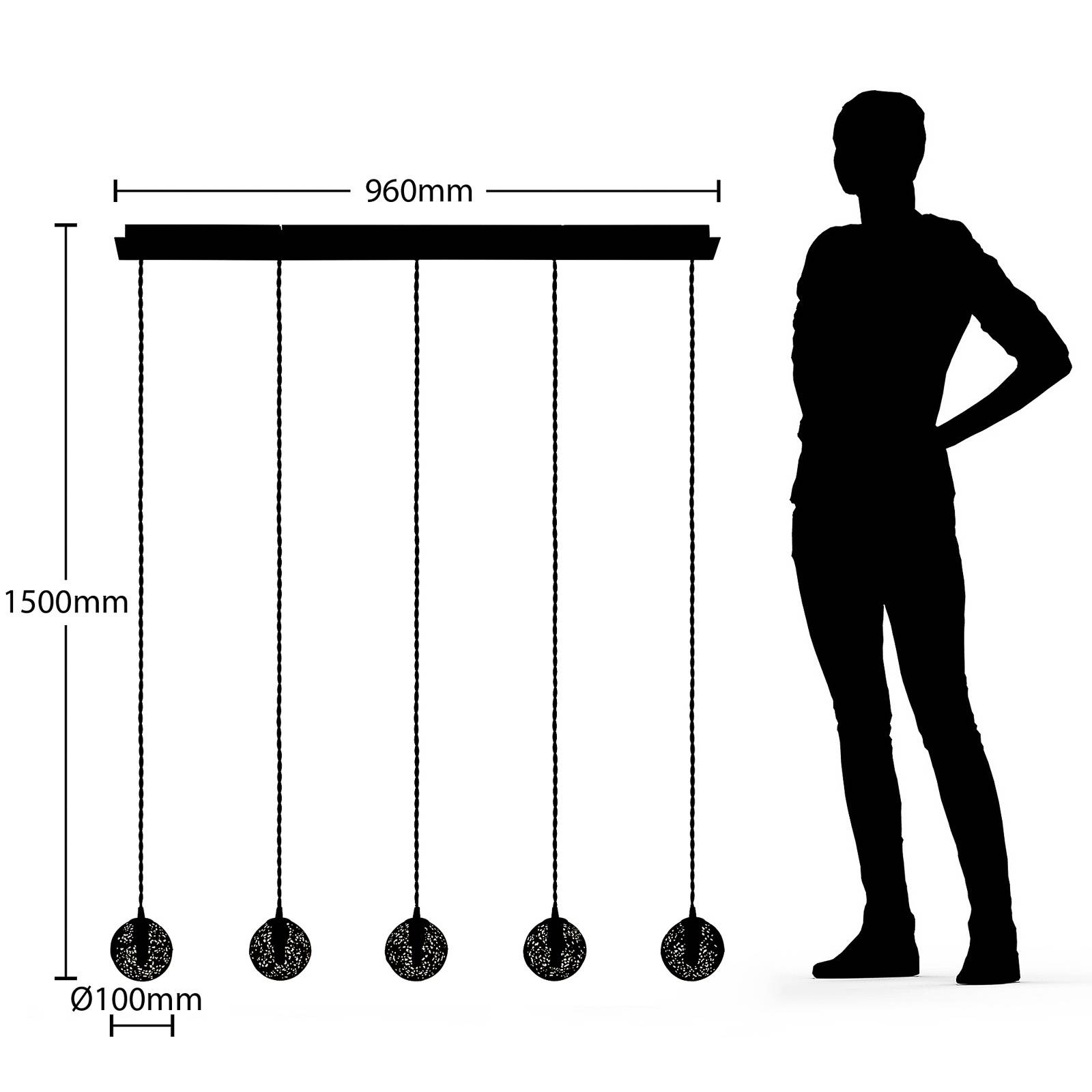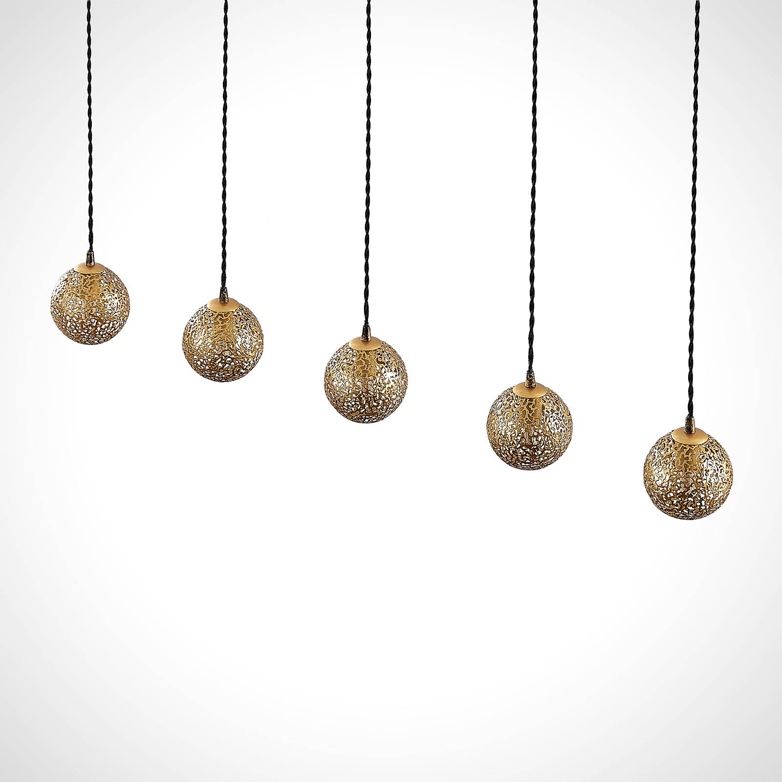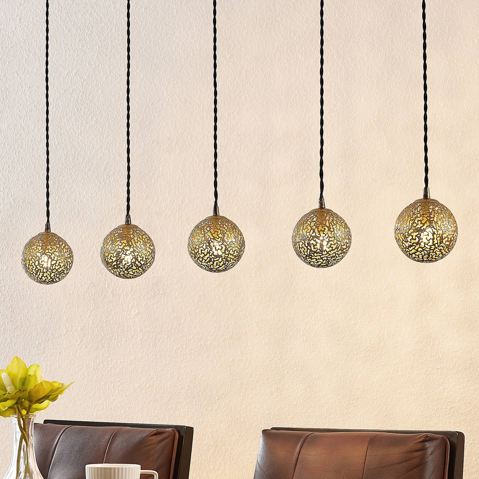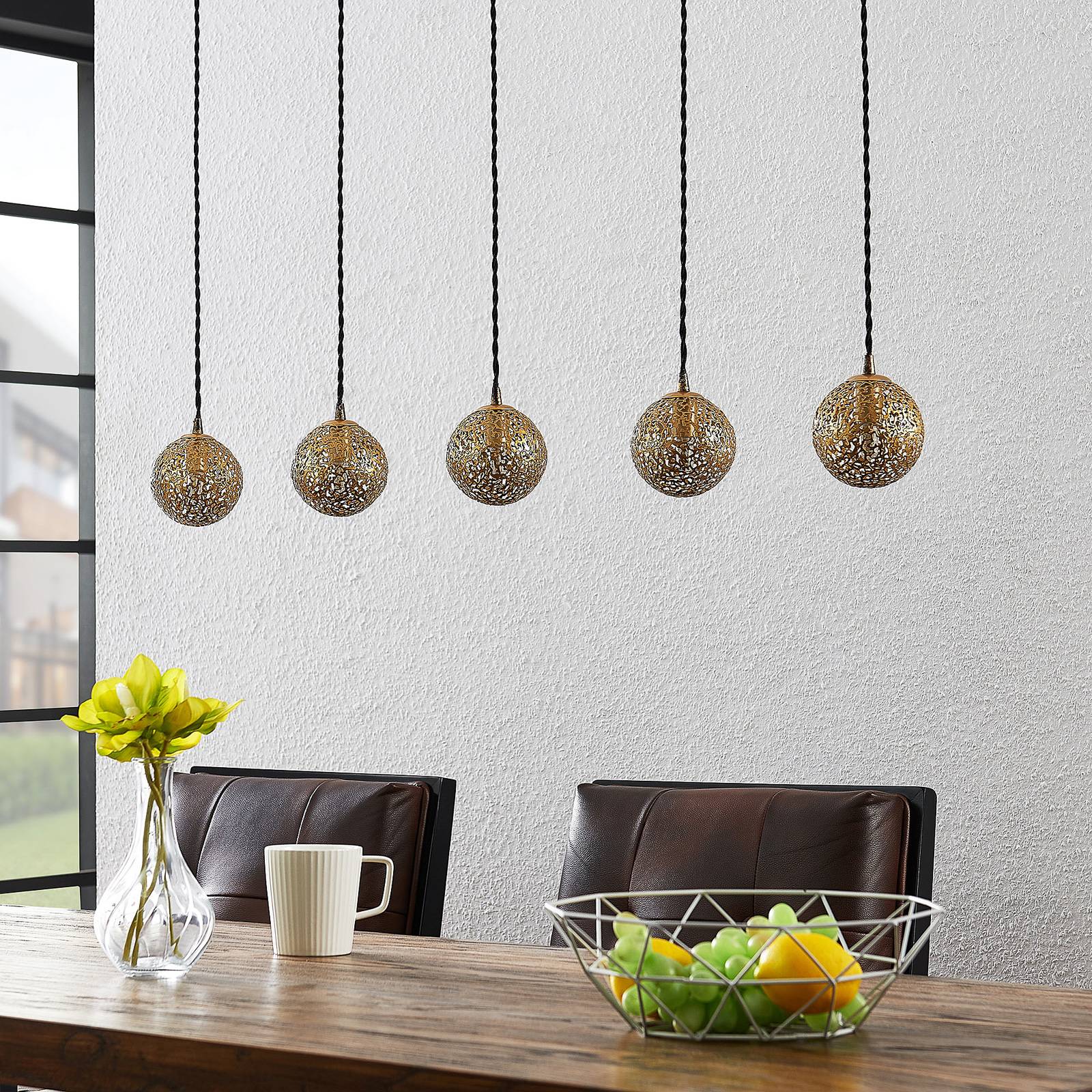 Díky filigránovému vzoru vytváří závěsné světlo Zale skvělou hru stínů Moderní závěsná lampa Zale je ideální pro podlouhlý stůl. Vyznačuje se svými pěti stínidly. Jsou individuálně zavěšeny, aby se světlo v místnosti distribuovalo co nejlepším způsobem. Jsou vyrobeny ze zlatě zbarveného kovu a mají filigránový vzor. Díky vzoru se vytváří obzvláště domácká atmosféra. Protože světlo proniká skrz prohlubně a vytváří nádherné stínové hry.