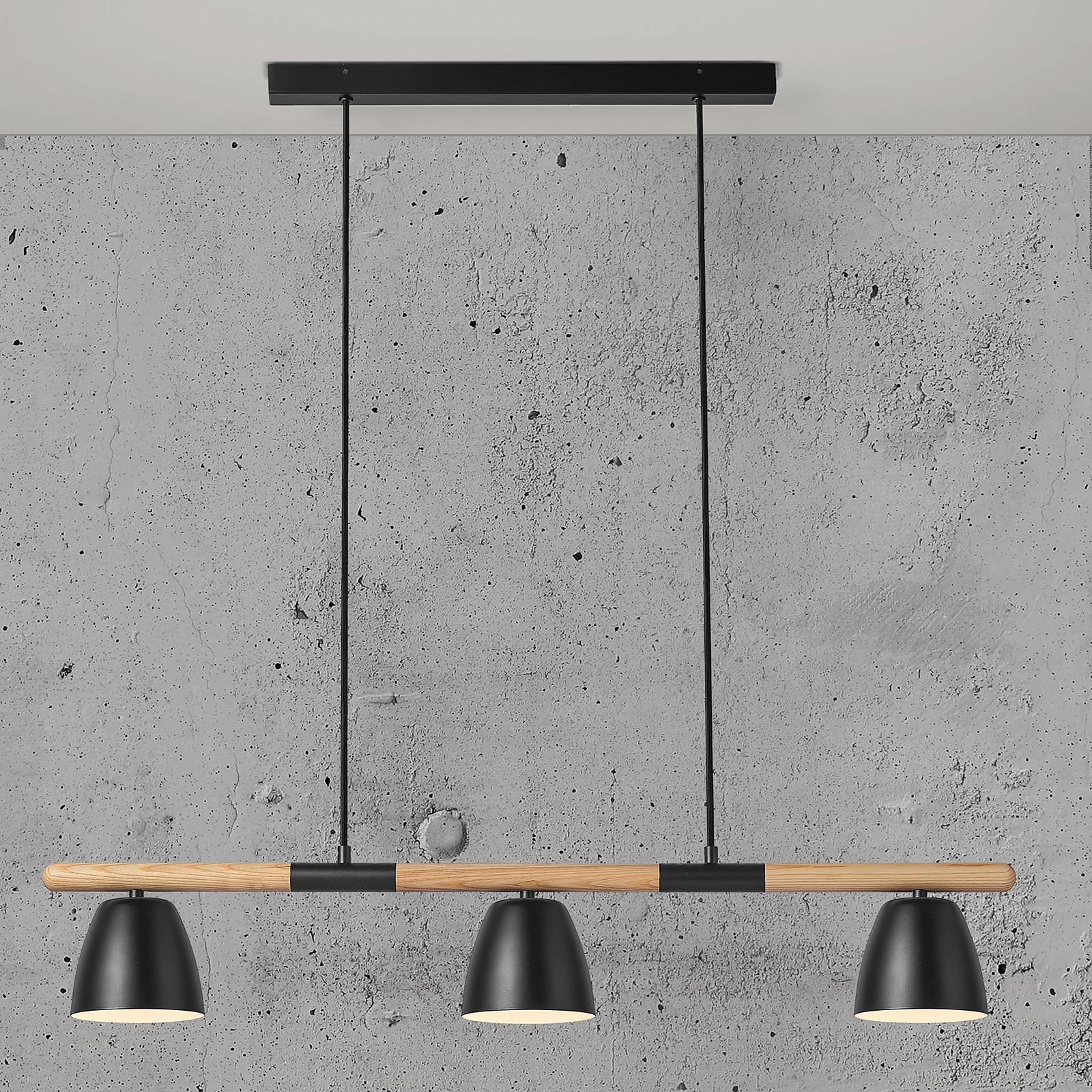 Trendy závěsné svítidlo Theo se třemi lampami ze dřeva a kovu Závěsná lampa Theo kombinuje světlé jasanové dřevo a černý kov. Do každé ze tří patic se vkládají odpovídající žárovky, které lze objednat prostřednictvím příslušenství. Kovová stínidla odrážejí světlo výhradně směrem dolů, a poskytují tak krásné velkoplošné osvětlení jídelních a kuchyňských stolů. Světlé dřevo vnáší do místnosti přírodní nádech a lze jej dokonale kombinovat s nábytkem v barvě dřeva.