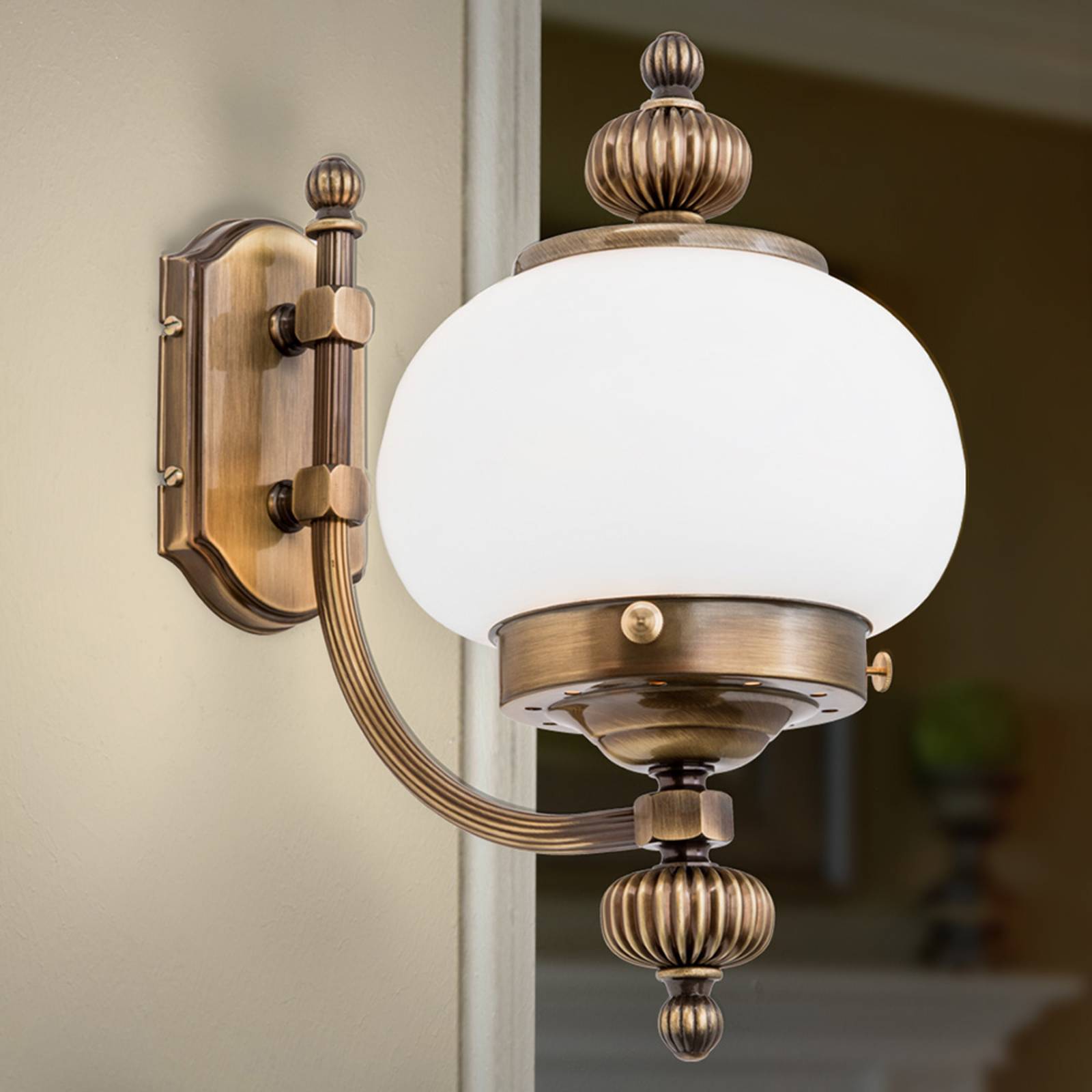 Elegantní nástěnné světlo Delia s pečlivě ztvárněný nástěnným držákem Atraktivní nástěnné světlo Delia zdůrazňuje zdařilý a vkusný bytový akcent. Je vybaven vysoce kvalitním nástěnným držákem z masivní mosazi. Všechny detaily a ozdobné hlavice jsou zpracovány pečlivě a s citem. Konečná podoba patinované mosazi propůjčuje nástěnnému světlu vkusnou vznešenost. Pozornost upoutá opálové svítidlo krásného tvaru. Jeho mírně vypouklý kulovitý design vykazuje krásnou eleganci. Jasná kvalita světla bez rušivého oslňování zajišťuje působivé doplňkové osvětlení. Delia je ideální světlo do haly a chodby. Doplňkovou světelnou náladu dokáže vytvořit i v obývacím pokoji. Obohatí kvalitní styl zařízení. Kvalitní výrobek z Rakouska.