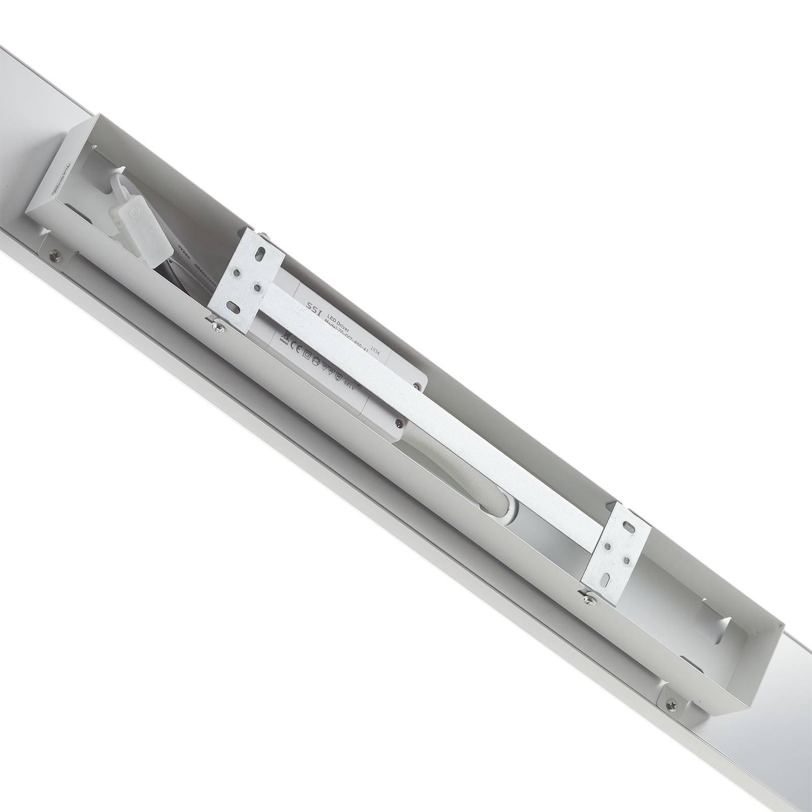 Bílé stropní svítidlo Frameless s CCT Svým dlouhým obdélníkovým tvarem poskytuje stropní lampa Frameless LED kompetentní světlo na širokou oblast. Díky tomu je ideální pro kancelář, kuchyň a obývací pokoj, které vyžadují jasné akcenty. Dodávané dálkové ovládání usnadňuje používání. Stropní lampa je ke stropu připevněna tenkým prvkem. Tento a bezrámový design vytvářejí lehký a jasný vzhled. Díky technologii CCT lze světelný zdroj nastavit z teplé bílé na denní světlo pro různé podmínky. Funkce paměti uloží tato nastavení. To znamená, že je lze kdykoli pohodlně vyvolat.