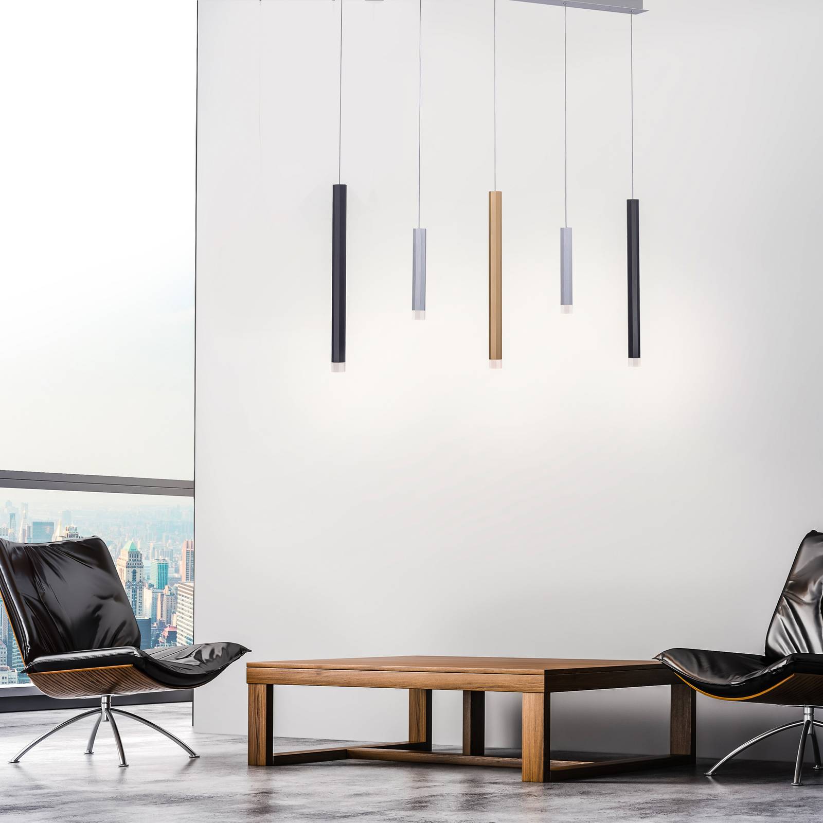 Závěsné svítidlo LED Pure-Gemin s pěti válcovými svítidly na dlouhém vrchlíku Dvě krátká a tři dlouhá, štíhlá a válcovitě tvarovaná svítidla visí v různých závěsech z dlouhé stříšky a dokonale osvětlují například dlouhý stůl nebo pult. Jednotlivá svítidla jsou osazena teplobílými deskami LED, které lze stmívat pomocí nástěnného vypínače. Tato technologie Simply-dim umožňuje regulovat jas svítidla ze 100 % intenzity světla na 10 % intenzity světla pomocí stávajícího spínače. Paměťová funkce uloží zvolené nastavení až do příštího zapnutí nebo do změny volby. Puristický vzhled závěsného svítidla ze série Pure je estetický a rafinovaný zároveň a činí z něj ozdobu místnosti.