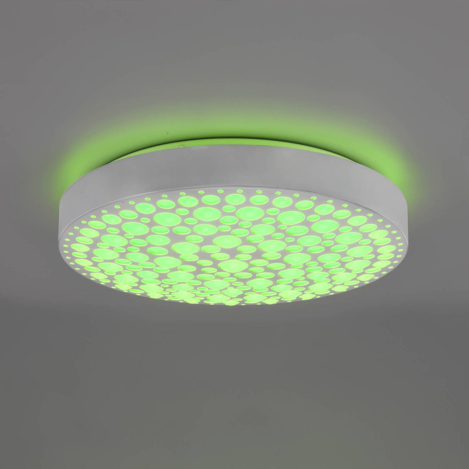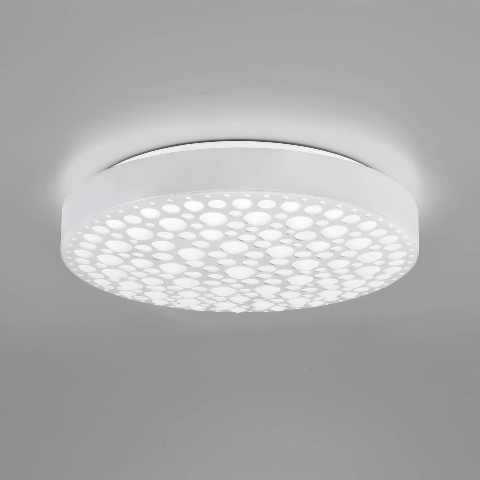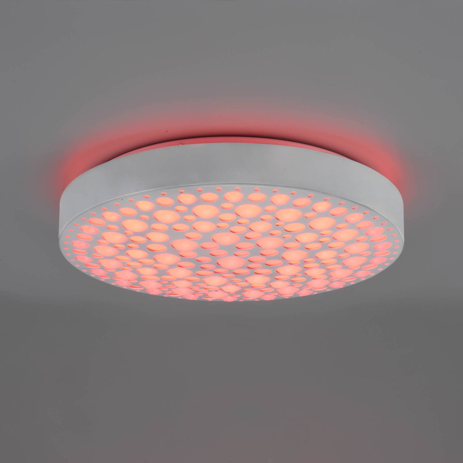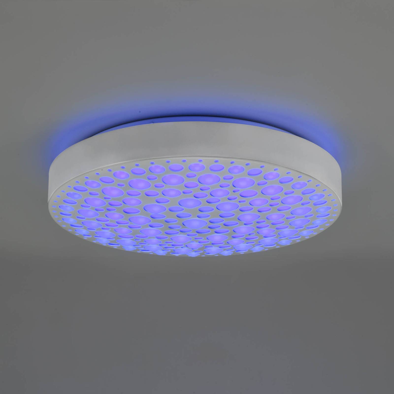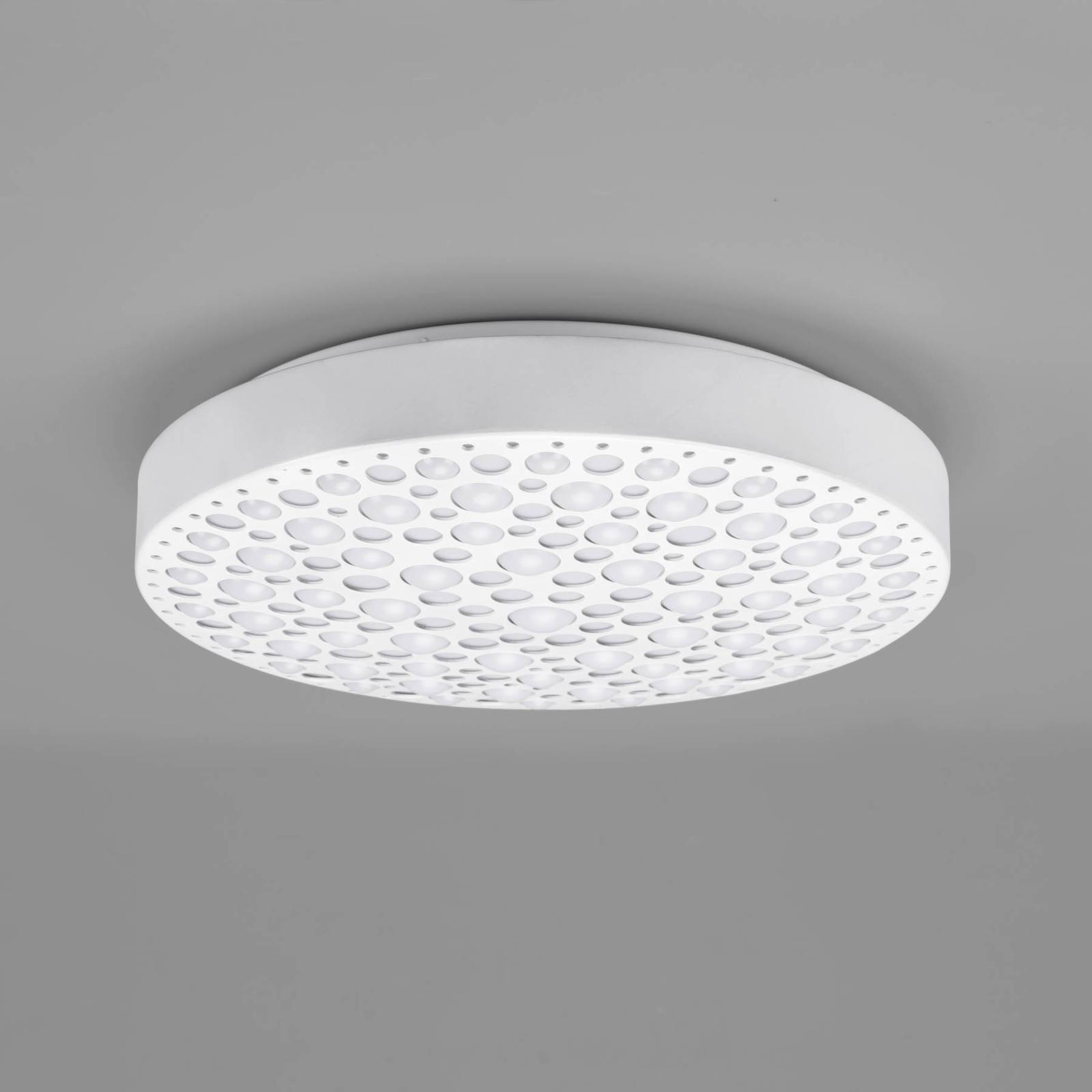 Kulaté stropní LED svítidlo Chizu v bodovém designu – nastavení jasu, barvy světla a nočního osvětlení pomocí dálkového ovládání Stropní LED svítidlo Chizu je vyrobeno z plastu a na spodní straně má vzor různě velkých kulatých otvorů, kterými vychází světlo. Integrované diody LED jsou stmívatelné a mají nastavitelnou teplotu barev (teplá bílá až denní světlo); navíc lze nastavit barevné barvy světla nebo diskrétní noční světlo. Všechny možnosti lze pohodlně ovládat pomocí přiloženého dálkového ovládání.