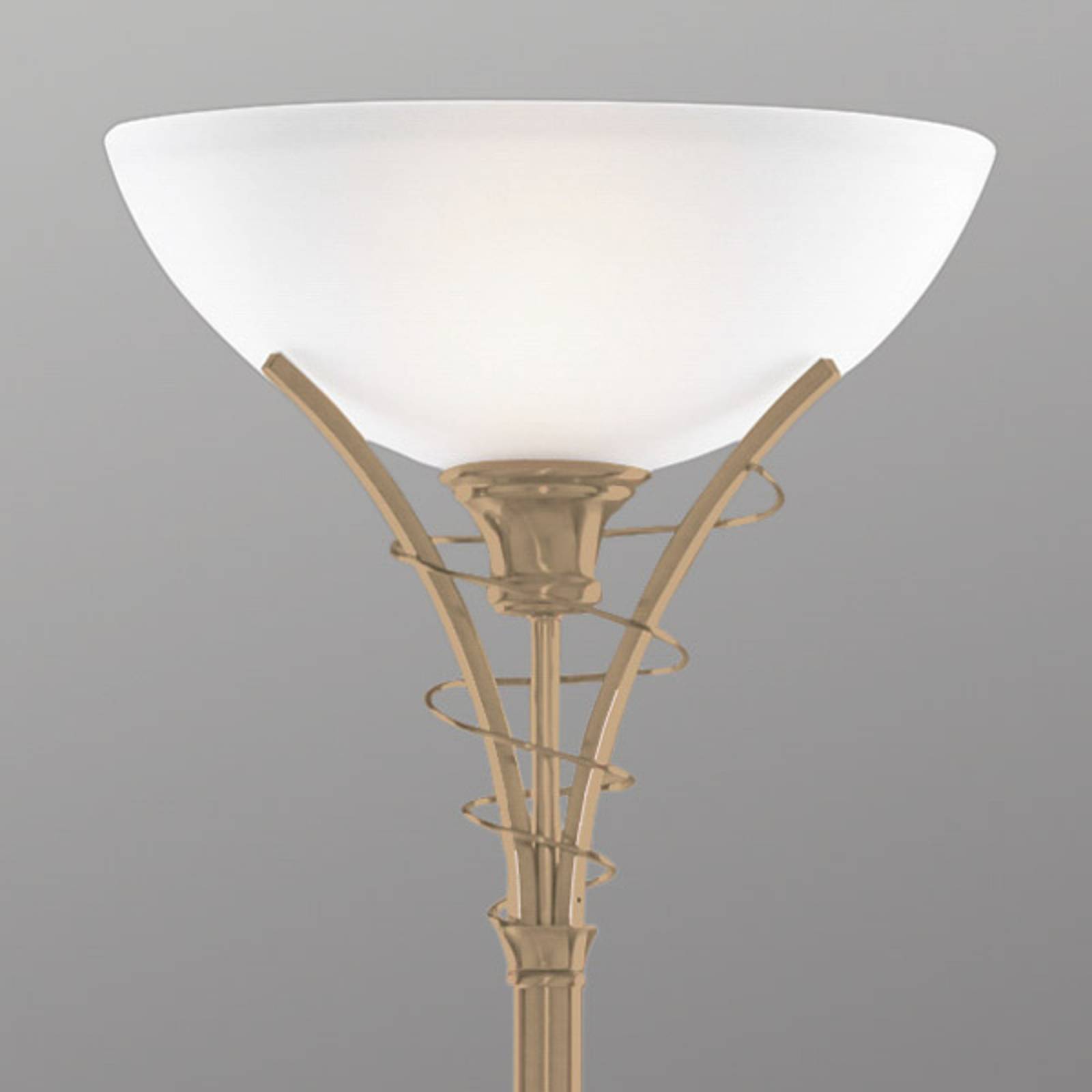 Vkusná stojací lampa Lineas s opálovým sklem a starožitným mosazným vzhledem Stojací lampa Lineas s výškou 179 cm je atraktivně navržena se spirálovitou dekorací na úpatí stínidla. Stínidlo z opálového skla vrhá světlo na strop obývacího pokoje a vyzařuje světlo bez oslnění. Rám lampy na kulatém podstavci je vyroben z kovu a má starožitný mosazný povrch. To dává krásné stojací lampě jemný a důstojný přízvuk. Lineas doplňuje moderní styly vybavení a je vhodný pro energeticky úsporné žárovky.
