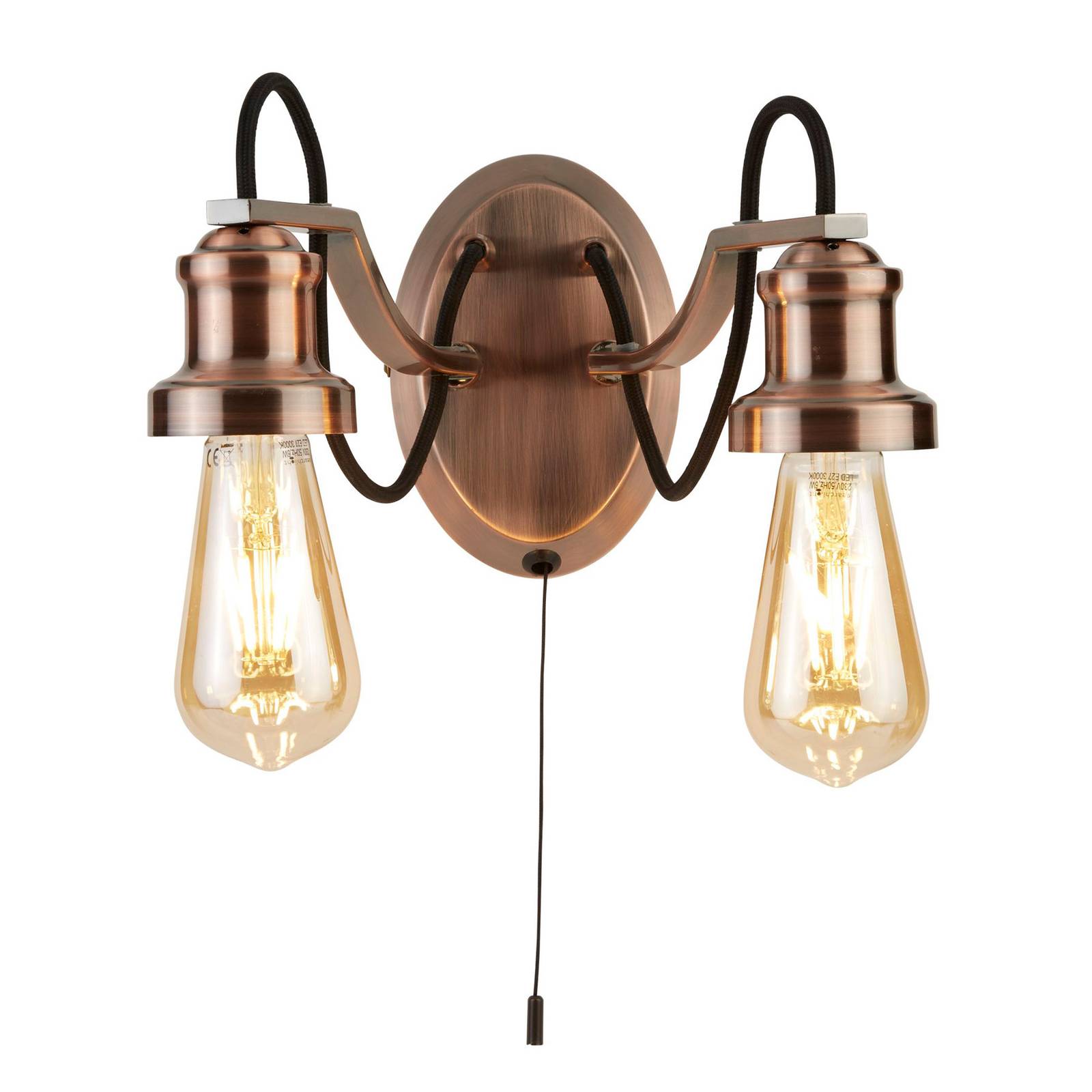 Nástěnné svítidlo Olivia se dvěma žárovkami a starožitným půvabem Nástěnné svítidlo Olivia, vyrobené z měkké oceli a zušlechtěné povrchovou úpravou v barvě staromědi, má dvě ramena vycházející do místnosti z oválné nástěnné desky, na každém z nich je namontována patice E27. Krásný vintage nádech dodává nejen starožitná povrchová úprava, ale také viditelné napájecí kabely. Nástěnné svítidlo Olivia působí obzvláště dekorativně, pokud se použijí estetické zdroje světla, jako jsou žárovky nebo rustikální lampy. Příslušná svítidla lze objednat prostřednictvím příslušenství. Pro pohodlné ovládání je uprostřed nástěnné desky ve spodní části umístěn tahový spínač.