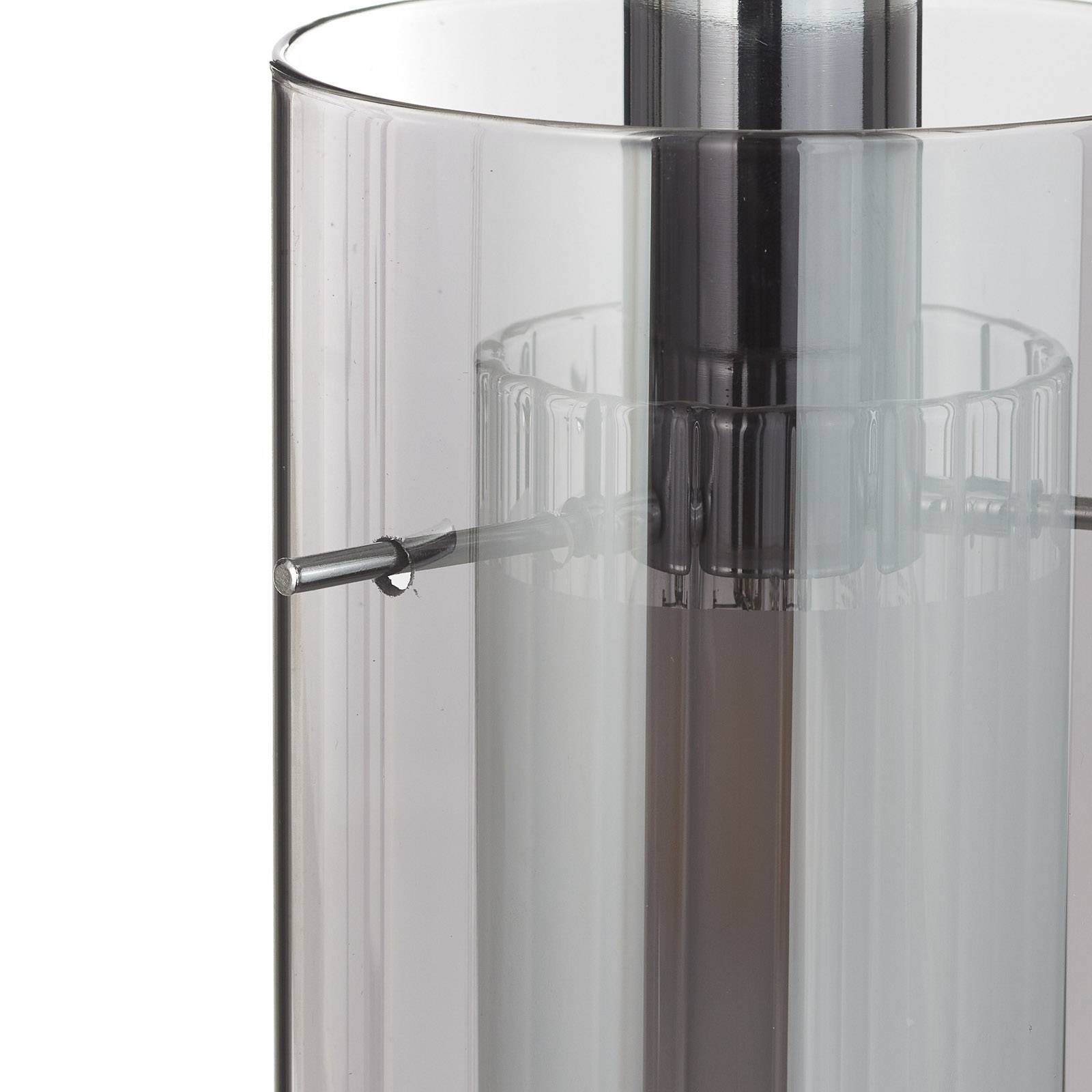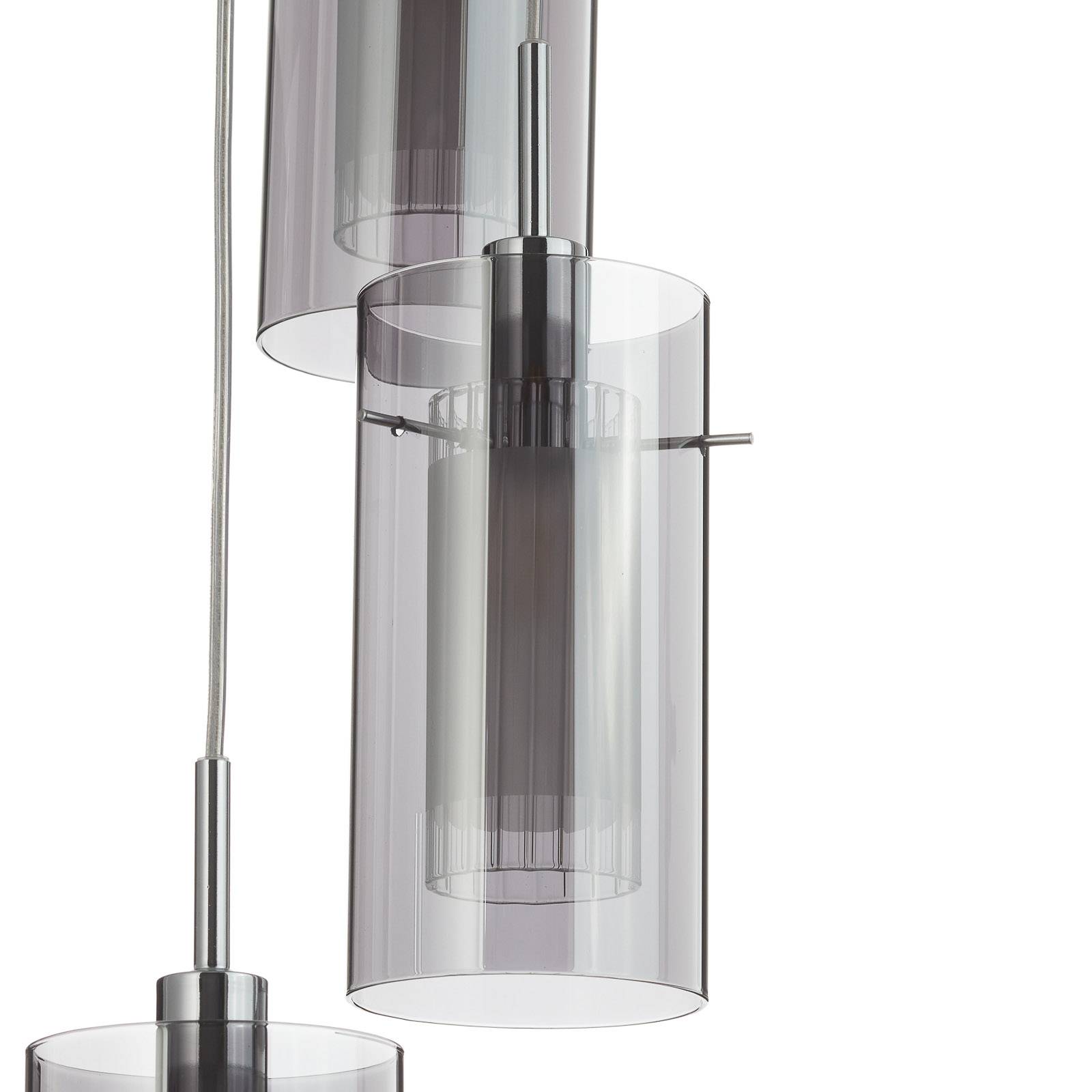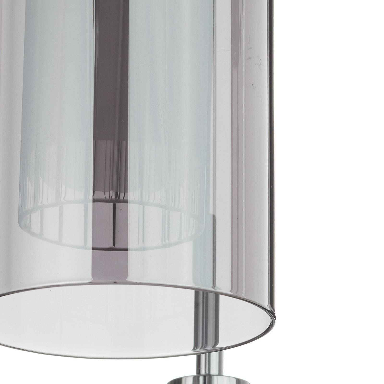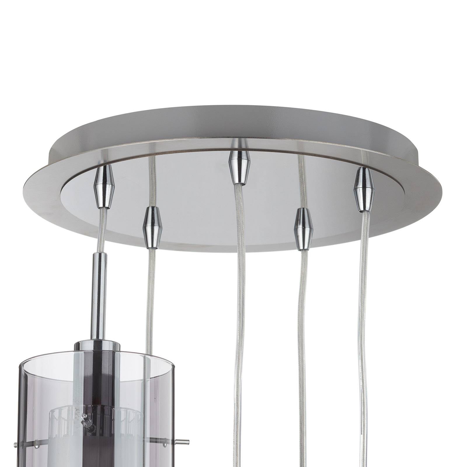 Stylová závěsná lampa Duo 2 s pěti závěsnými skleněnými stínítky Závěsné svítidlo Duo 2 je skutečným poutačem v každém moderním obývacím pokoji. Lesklý chrom je chytře kombinován s kouřově šedými odstíny skla. Samotné deštníky však mají zvláštní vlastnost – jsou to dvojité deštníky. Z vnitřní strany bylo použito matné sklo a z vnější strany kouřilo průhledné sklo. V kombinaci oba vytvářejí okouzlující světelný efekt, který může svítit na strop obytného prostoru nebo ve vstupním prostoru domu.