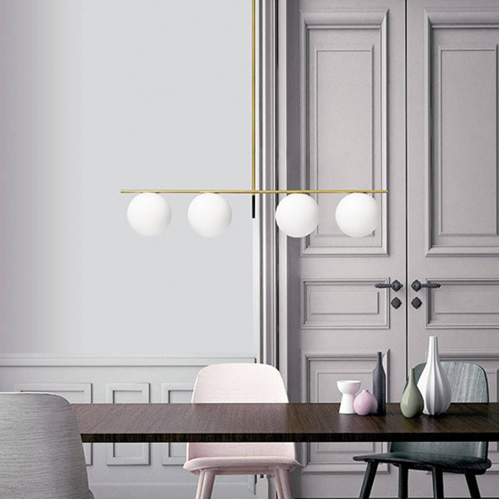 Přímé linie v mosazné a bílé barvě – závěsné svítidlo Jugen Víceplamenné závěsné svítidlo Jugen se skládá z dlouhé kovové trubice, která je připevněna ke stropu pomocí stříšky. Mírně nad spodním koncem tyče je vodorovně připevněna další kovová tyč, která slouží jako podpěra pro stínidla. Tato kulovitá stínidla jsou vyrobena z foukaného matného skla a každé z nich ukrývá objímku E27, kterou lze osadit i LED žárovkami.