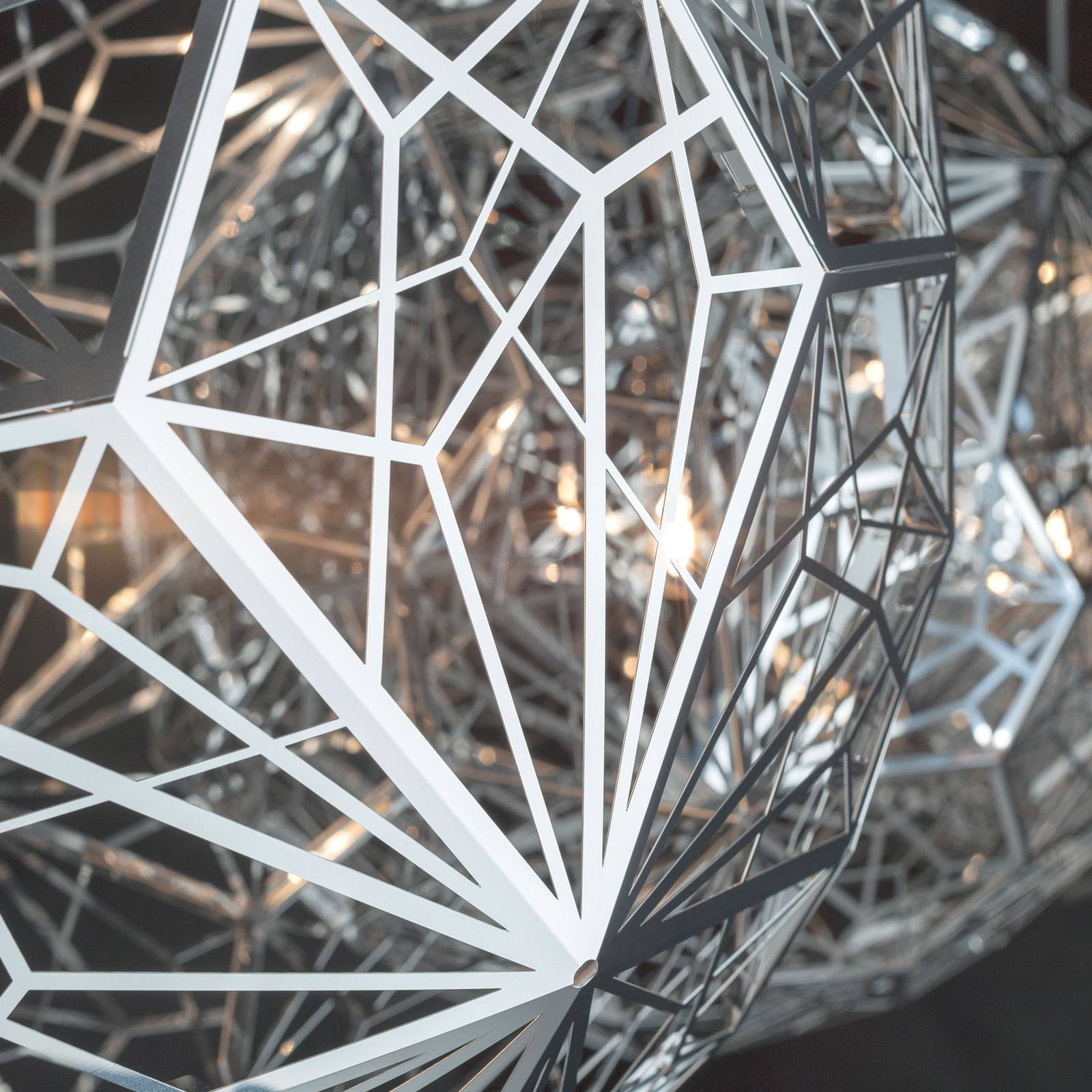 Závěsná lampa Etch Web – stínidlo s nerezovou strukturou Závěsné svítidlo Etch Web z nerezové oceli je unikátní konstrukce z mnoha tenkých vzpěr, které tvoří fascinující vzor a vzájemně se doplňují v mnoha úhlových řezech a vytvářejí téměř kulovitý mnohostěn. Díky svým rozměrům a speciálnímu designu vyzařuje Etch Web nesrovnatelný šarm nejen v soukromých obytných prostorech, ale je vhodný i do hotelů, restaurací a dalších prestižních prostor. Leptaný povrch dodává nerezové oceli individuální vzhled. Střídání kovových vzpěr a velkorysých otevřených ploch vytváří nejen jedinečnou hru světla a stínu, ale také umožňuje pohled na použité svítidlo; zejména dekorativní žárovka ideálně doplňuje celkový vzhled. Autorem tohoto díla je Tom Dixon, jeden z nejvýznamnějších interiérových designérů Velké Británie. Jeho kariéra začala výrobou svařovaného kovového sedacího nábytku. Dnes jsou pro výrobky jeho společnosti charakteristické vysoce kvalitní materiály, jedinečný design a nesrovnatelný světelný efekt.