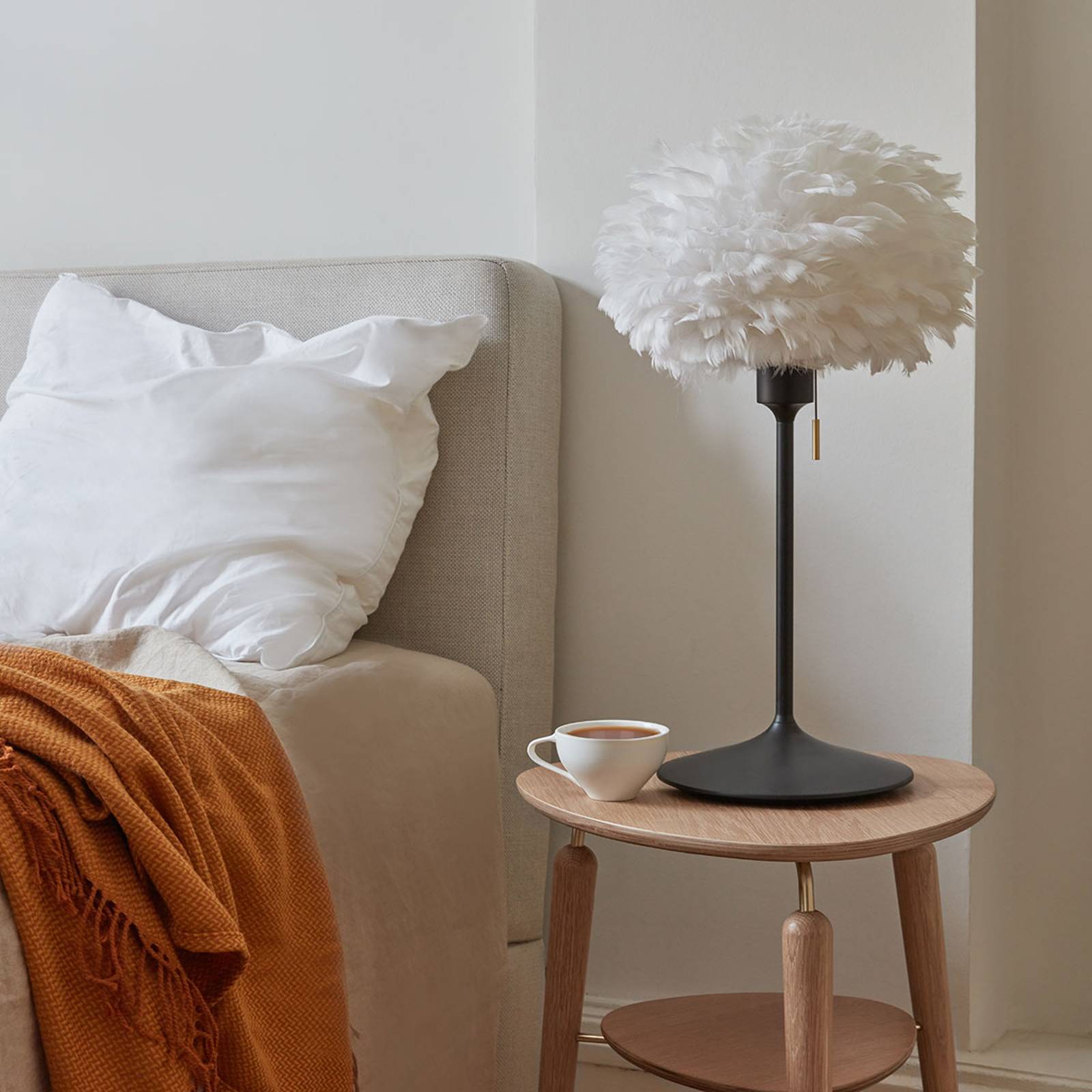 Stolní lampa Eos mini – stínidlo z peří na černém stojanu Eos mini kombinuje jednoduché základní tvary s nezávislým vzhledem a moderní přidanou hodnotou. Søren Ravn Christensen, hnací síla dánského výrobce svítidel UMAGE, navrhl svítidlo, které ladí s atmosférou mnoha interiérů v moderním a skandinávském pojetí vybavení. Stínidlo v bílé barvě je po celém obvodu pokryto husím peřím, které mu dodává lehkost. Ten se opírá o štíhlou tyč černého stojanu. Moderní funkčnost představuje například přípojka USB na základně pro nabíjení chytrých telefonů. – K čištění stolní lampy Eos mini se doporučuje použít fén. – Nepoužívá se peří ze živých zvířat.