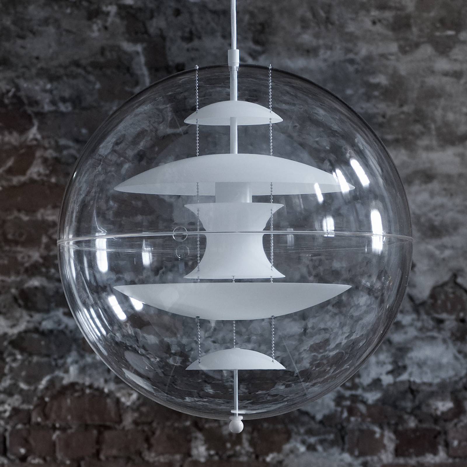 Designová závěsná lampa VP Globe Glass s difuzory z opálového bílého skla Model VP Globe Glass pochází z rodiny světel, které Verner Panton navrhl v 60. a 70. letech minulého století. Verner Panton (1926-1998) byl dánský architekt a designér, který mimo jiné formoval styl pop-art. Při jeho práci ho zvláště inspiroval plast jako materiál a výrazné barvy. Zatímco pro svůj nábytek pracuje hlavně po celém světě, např. B. The Panton Chair je známý, navrhl také některé důležité světelné klasiky, které nyní vyrábí dánská společnost VERPAN. Každé z těchto světel obsahuje certifikát pravosti a bylo vyryto jménem Vernera Pantona. Sférická závěsná světla VP Globe jsou postavena na podobném principu. Vnější plášť se skládá z průhledné akrylové koule, která odhaluje vnitřek lampy. Uvnitř VP Globe Glass jsou skleněné reflektory nebo difuzory různých velikostí, které ovlivňují směr světla. Jsou uspořádány tak, že světlo uniká do strany jako světlo místnosti a je jemně rozptýleno dolů, takže lze použít například závěsné svítidlo VP Globe Glass. B. lze použít i na jídelní stůl.