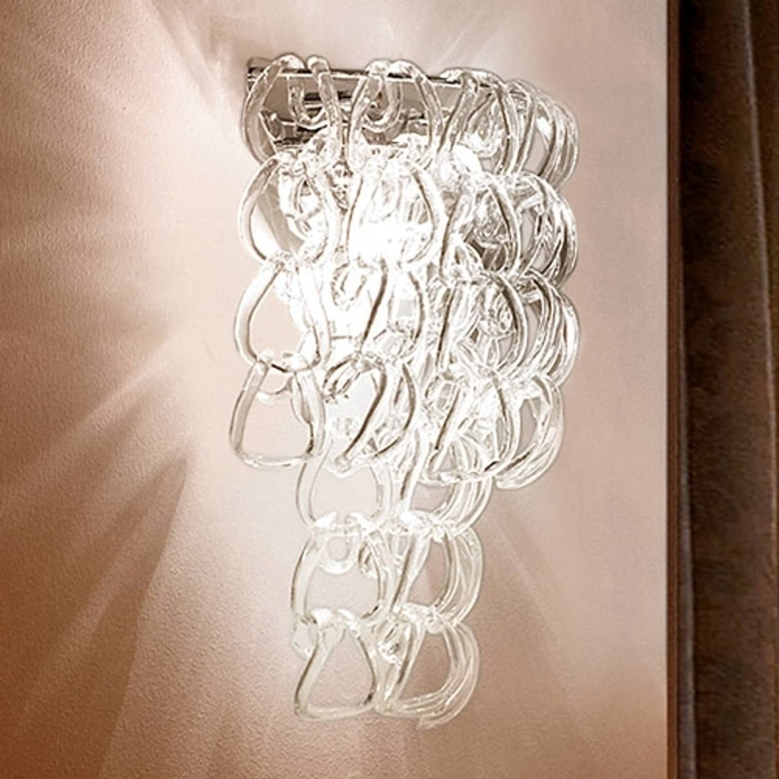 Rozkošné nástěnné světlo GIOGALI s křišťálovým sklem Nástěnné světlo GIOGALI poskytuje jiskřivé momenty v obytném nebo gastronomickém prostoru. Svítidlo se vyznačuje speciálním designem, protože hlavní důraz je kladen na tvar a zřetězení jemných křišťálových skleněných prvků, které probíhají, jako by byly propleteny od nástěnného držáku dolů. Vhodné pro LEDS nebo úsporné žárovky. Při rozsvícení je světlo odráženo a reflektováno křišťálovým stínidlem, takže se vytvářejí působivé světelné efekty. Pro vzhledové vylepšení i v hotelových zařízeních nebo restauracích vyzařuje GIOGALI ušlechtilé akcenty a zajišťuje příjemné doplňkové osvětlení. Výrobce, který v Itálii vyrábí od roku 1952, používá pro své osvětlení vybrané sklo Murano. Rodinná historie zakladatele společnosti sahá až do 16. století. I tehdy se zpracování skla stalo tradicí, na kterou je dodnes kladen důraz. Společnost současně spolupracuje s moderními designéry, jako je Angelo Mangiarotti. Vznikají zdroje světla pro soukromé a komerční prostory, které nabízejí přidanou hodnotu a zajišťují krásný vzhled. – s ručně foukaným vícevrstvým stínidlem