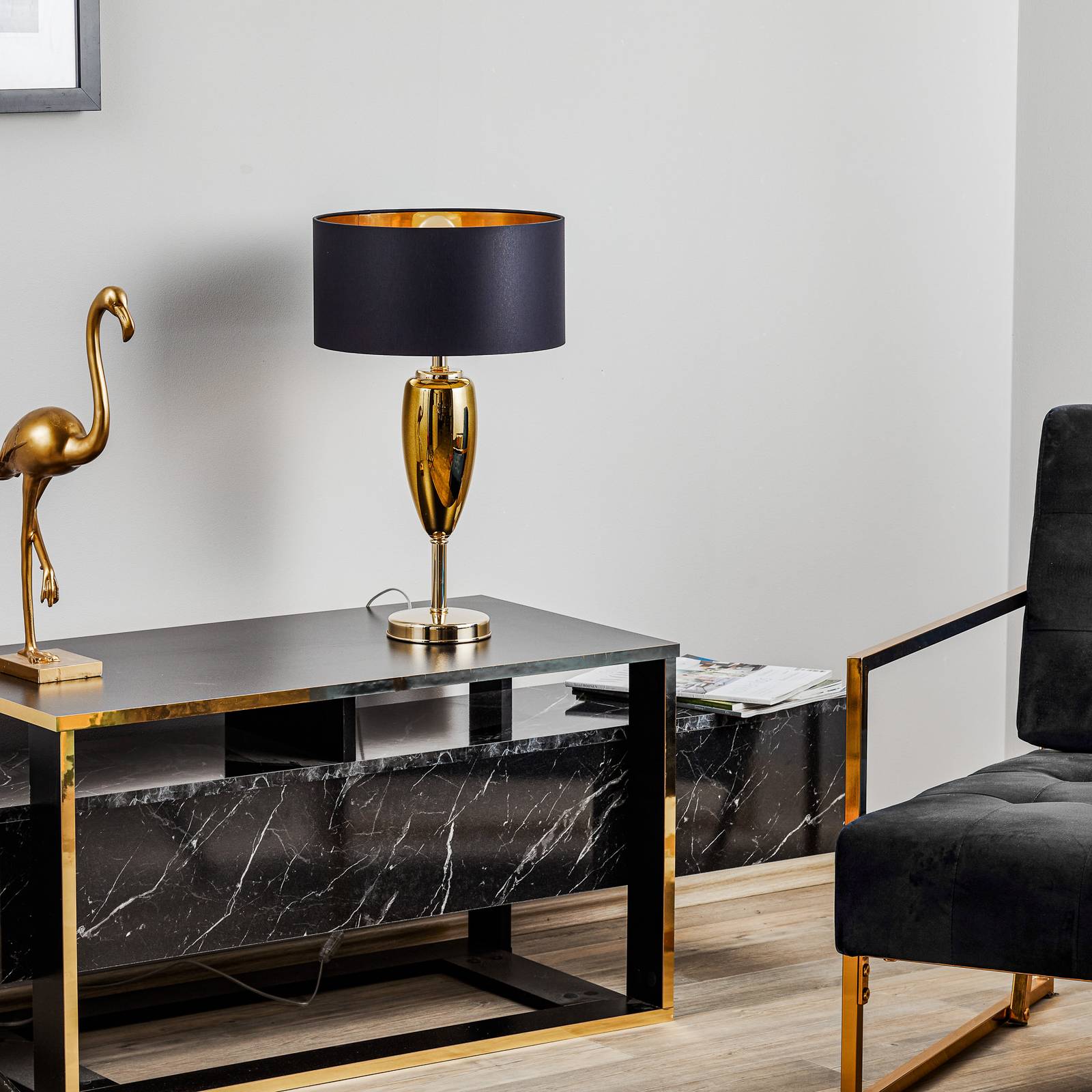 Ailati Zobrazit Ogiva – černo-zlatá textilní stolní lampa, Obývací pokoj / jídelna, Sklo, plast, textil, E27, 70W, L: 32 cm, K: 54cm