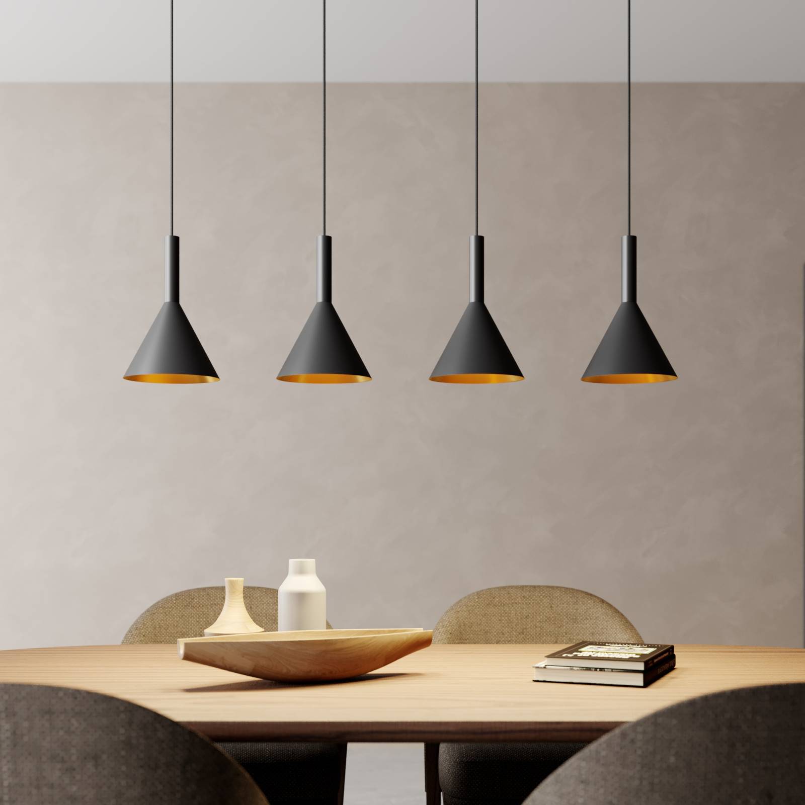 Arcchio Tadej závěsné světlo, 4žár., černo-zlaté, Obývací pokoj / jídelna, ocel, E27, 40W, P: 100 cm, L: 19 cm