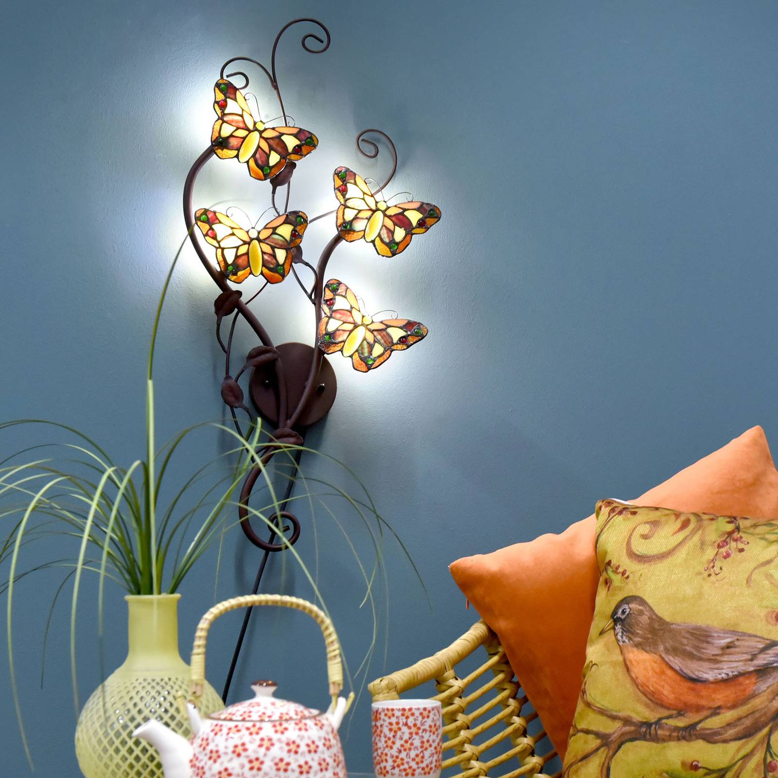 Clayre&Eef Nástěnné světlo 5979 s motýly, čtyři zdroje, Obývací pokoj / jídelna, kov, sklo, G4, 2W, L: 32 cm, K: 68cm
