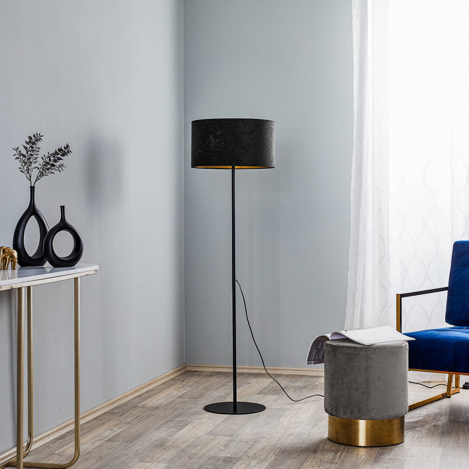 Duolla Stojací lampa Golden Roller černá/zlatá, Obývací pokoj / jídelna, samet, kov, E27, 40W, K: 150cm