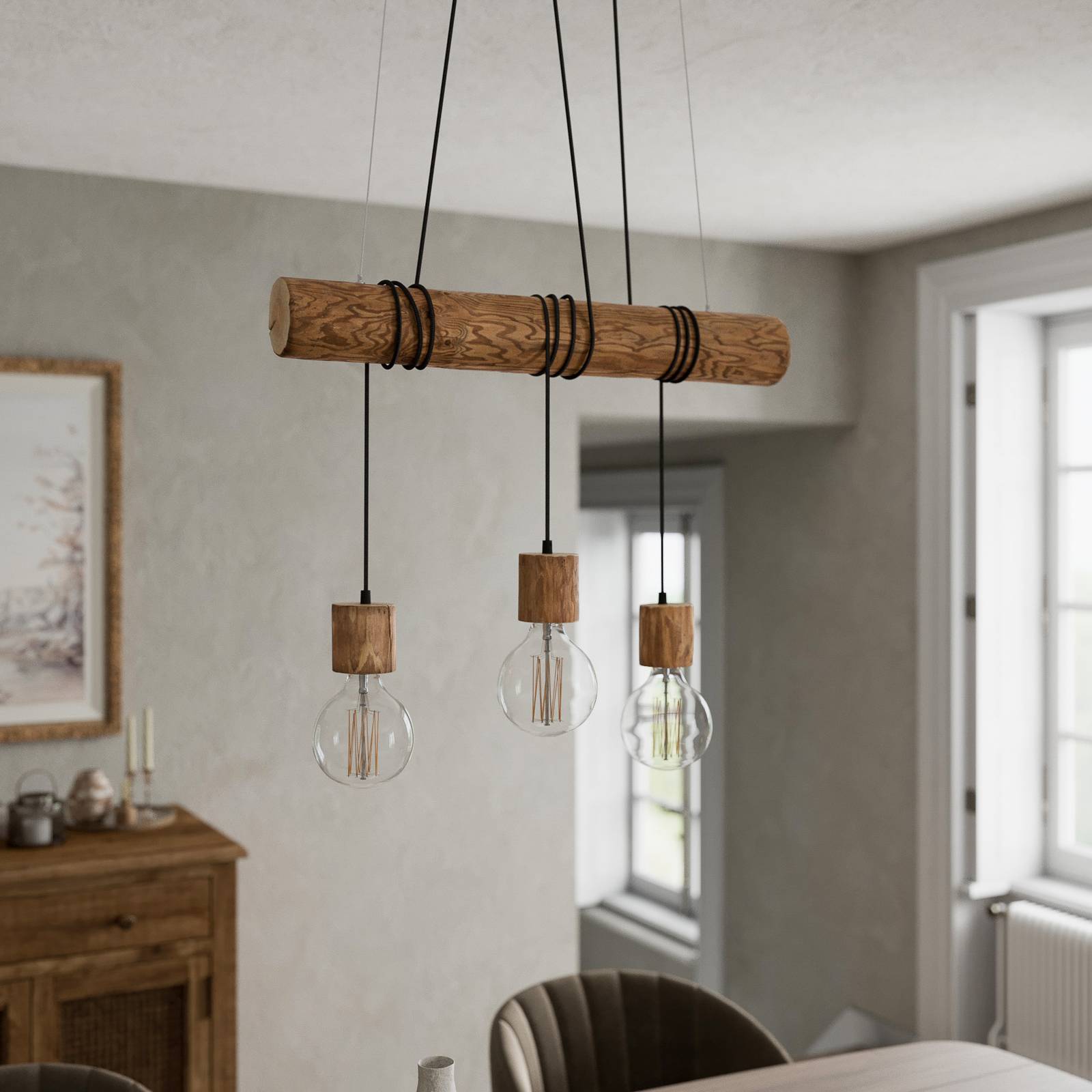 Envostar Závěsná lampa Terra, světlý dřevěný trám, 3fl, Obývací pokoj / jídelna, Mořené borovicové dřevo, kov, textil, E27, 15W, P: 70 cm, L: 12 cm, K: 40cm