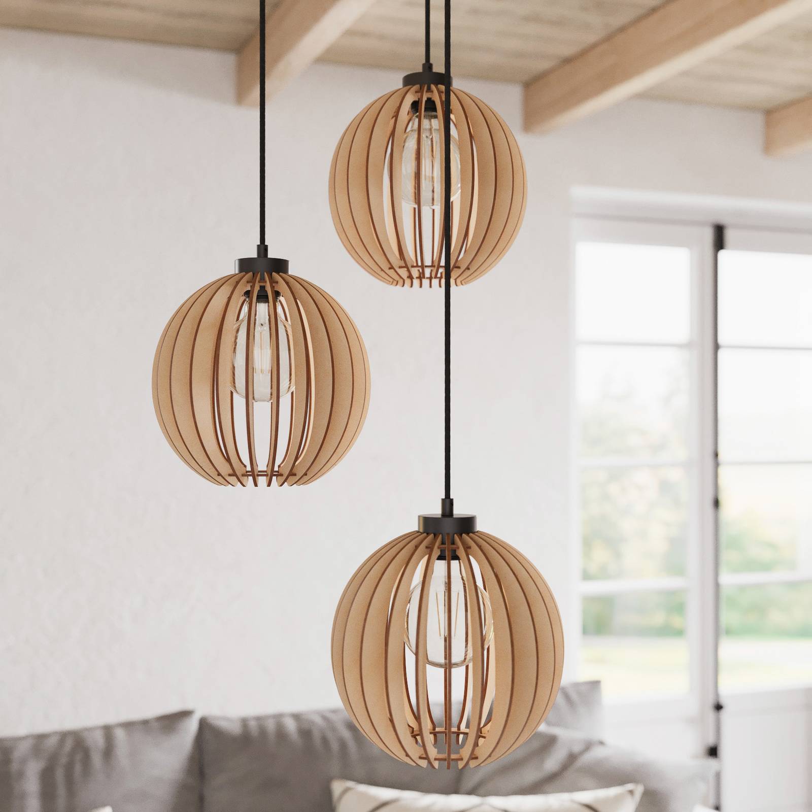 Envostar Hliněná závěsná lampa březová překližka 3fl kulatá, Obývací pokoj / jídelna, Kov, textil, březová překližka, E27, 15W