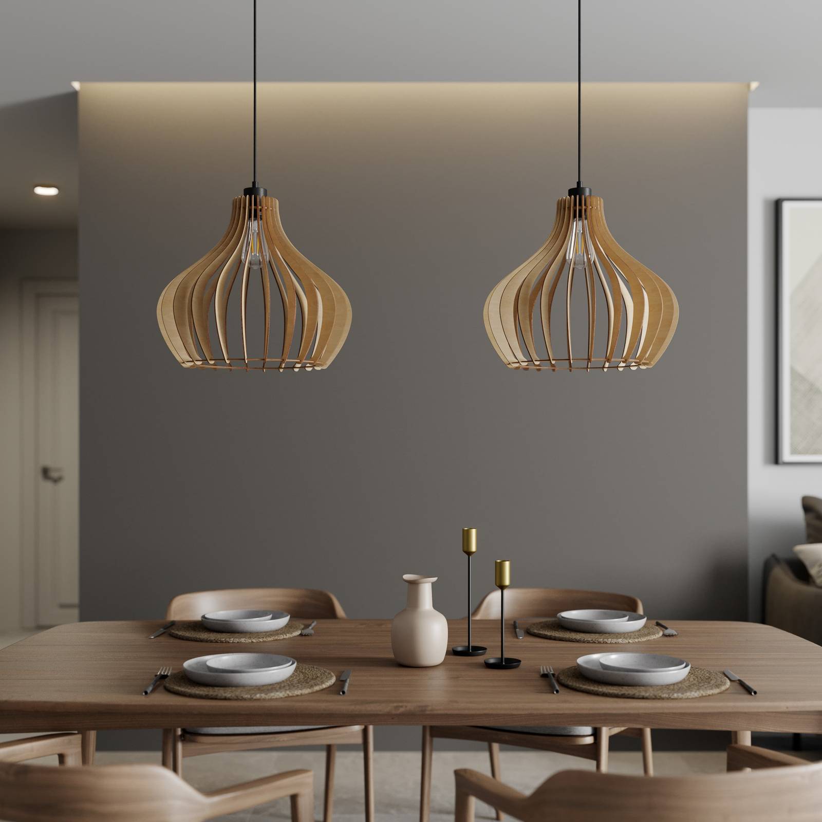 Envostar Závěsné svítidlo Faje, březová překližka, 2fl, Obývací pokoj / jídelna, Kov, textil, březová překližka, E27, 15W, P: 110 cm, L: 41 cm