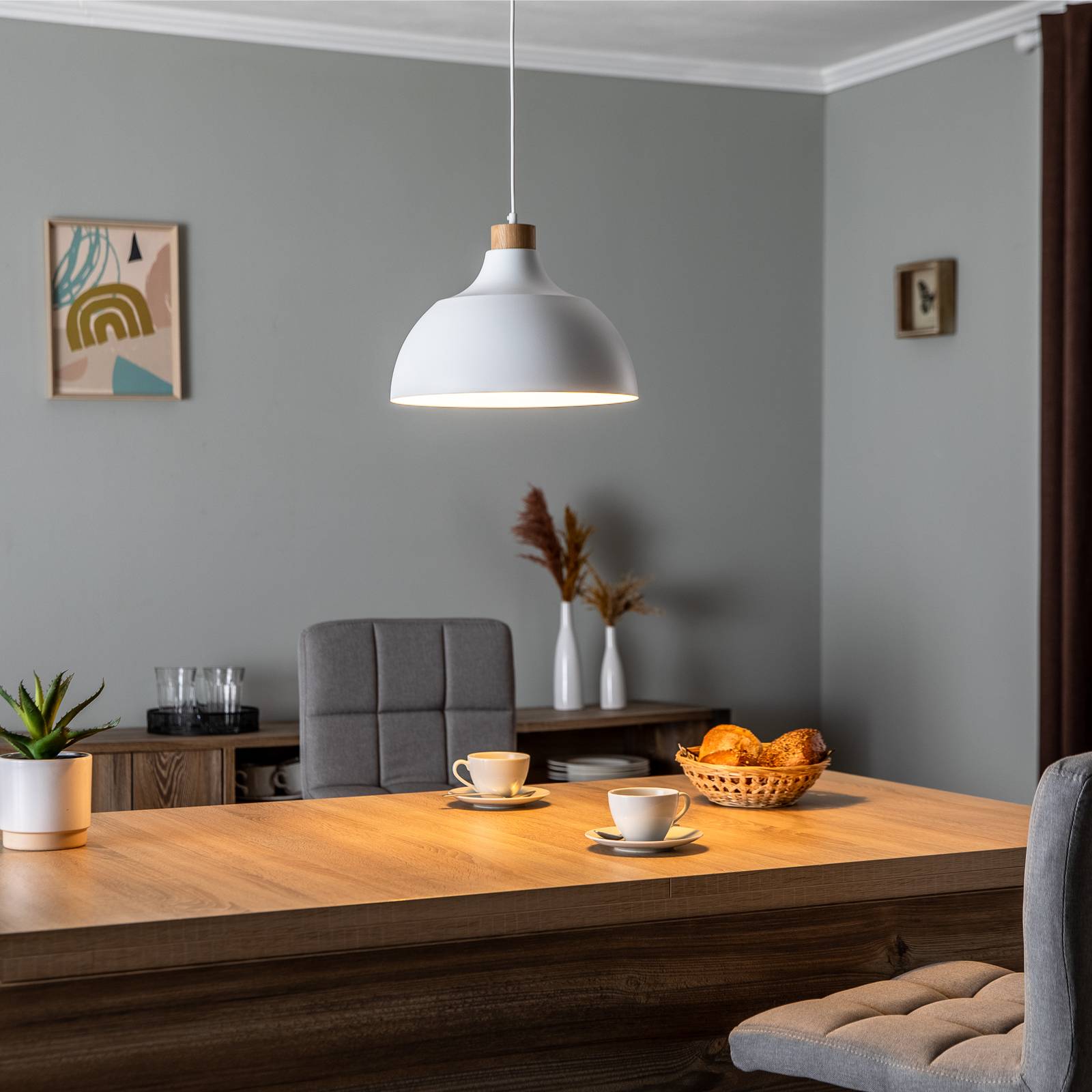 Envostar Závěsné svítidlo Kaitt, detail dřeva, Ø 34 cm, bílá barva, Obývací pokoj / jídelna, Ocel, dřevo, E27, 15W