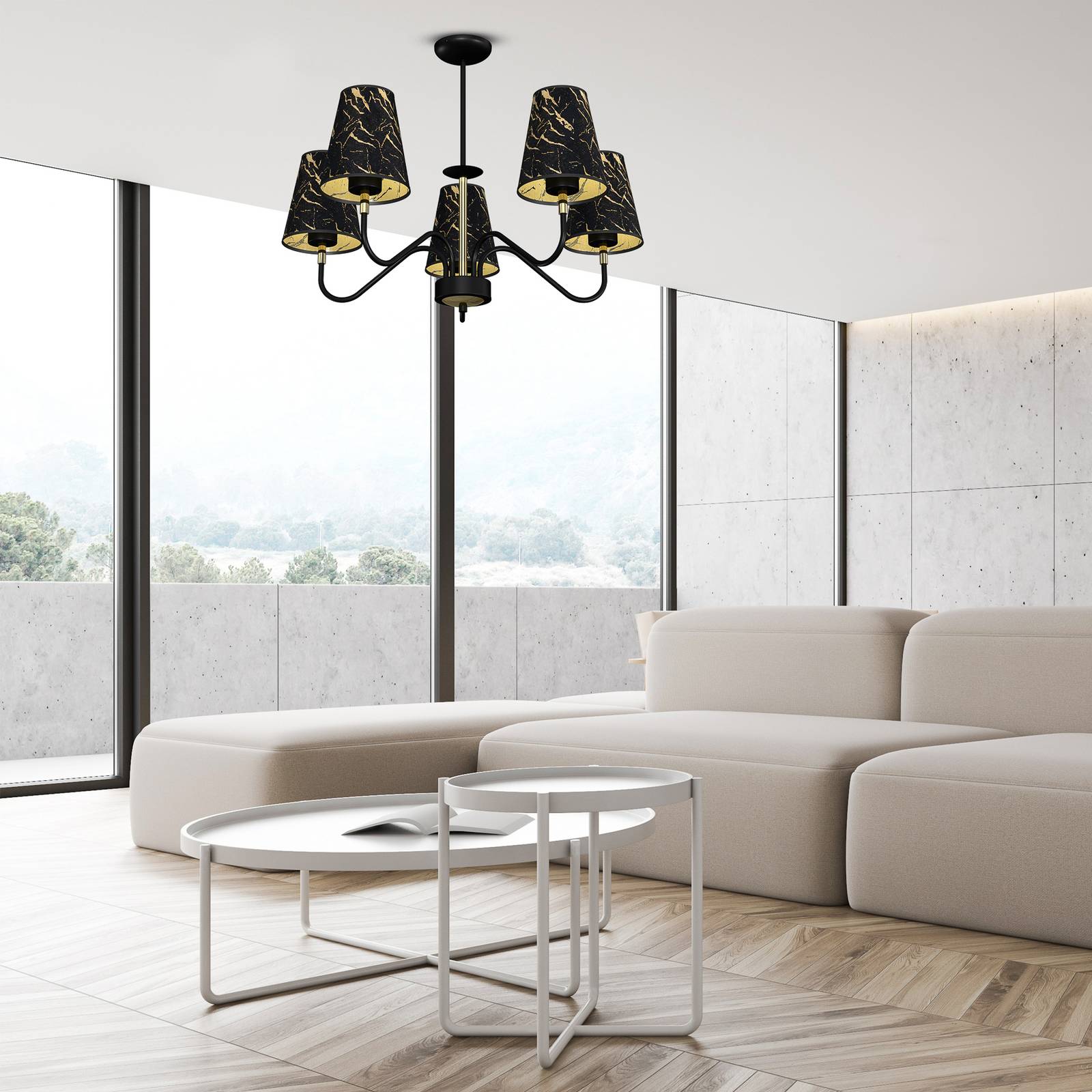 Euluna Stropní světlo Harmias, černá/zlatá, pět zdrojů, Obývací pokoj / jídelna, kov, textil, E27, 60W, K: 52cm